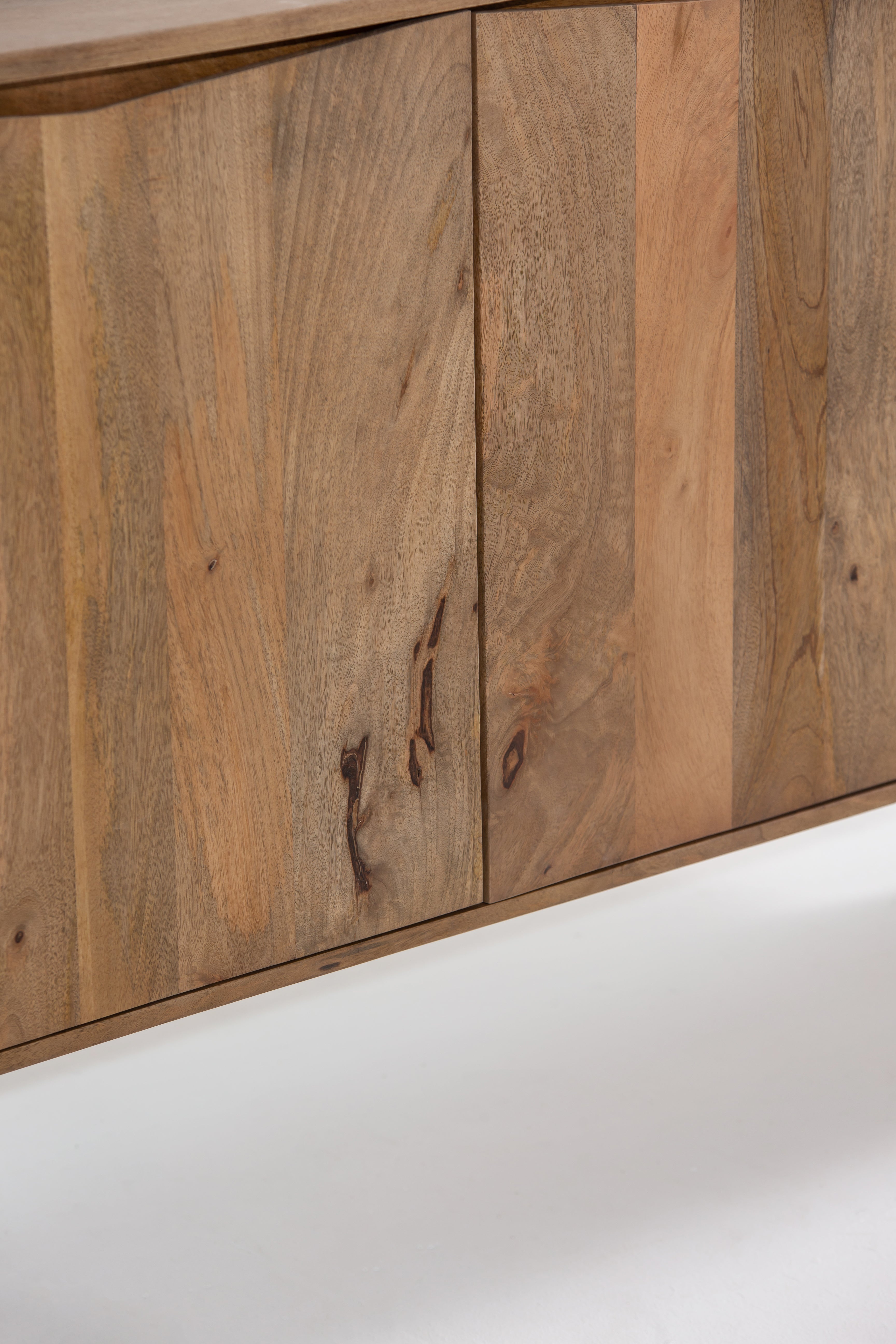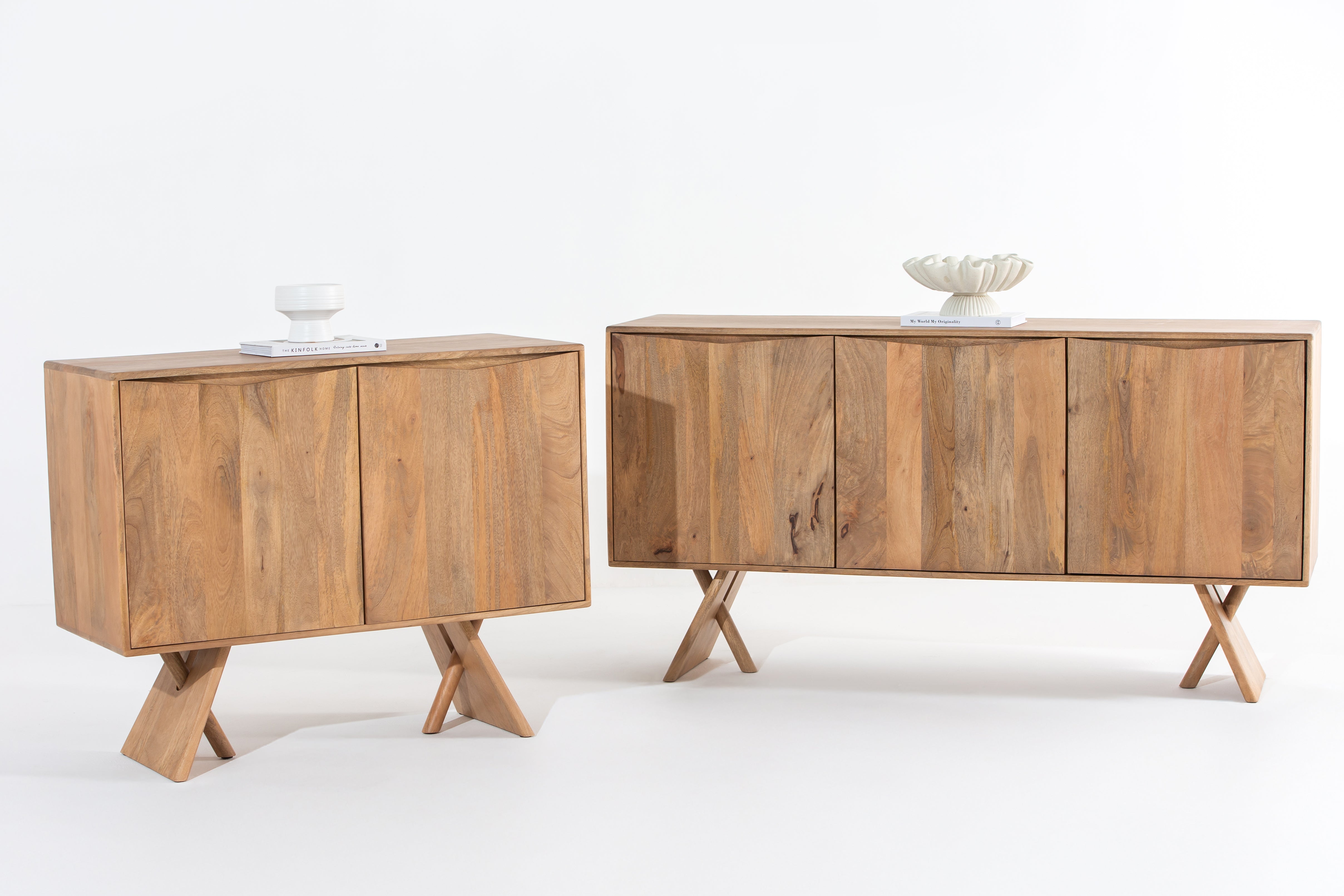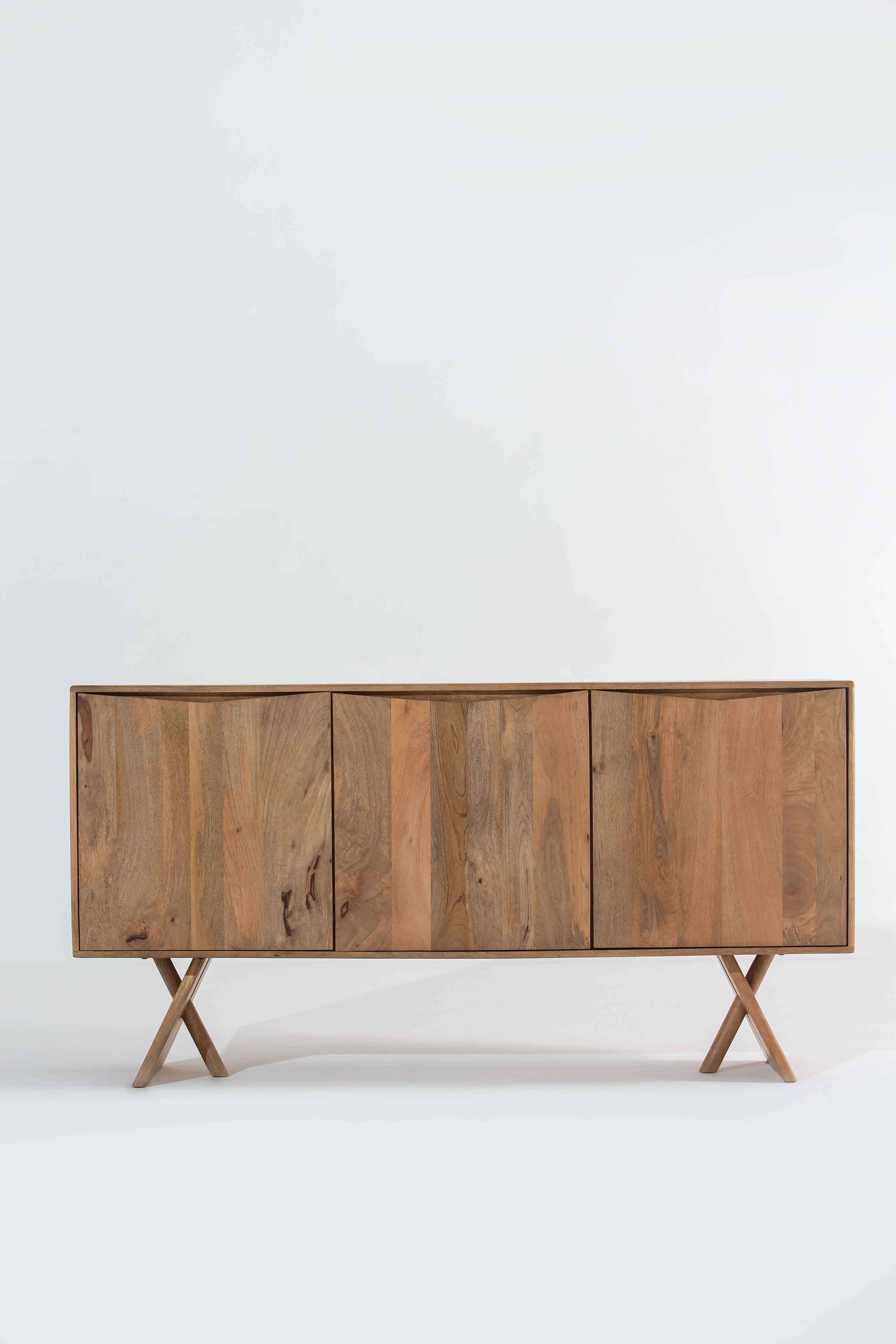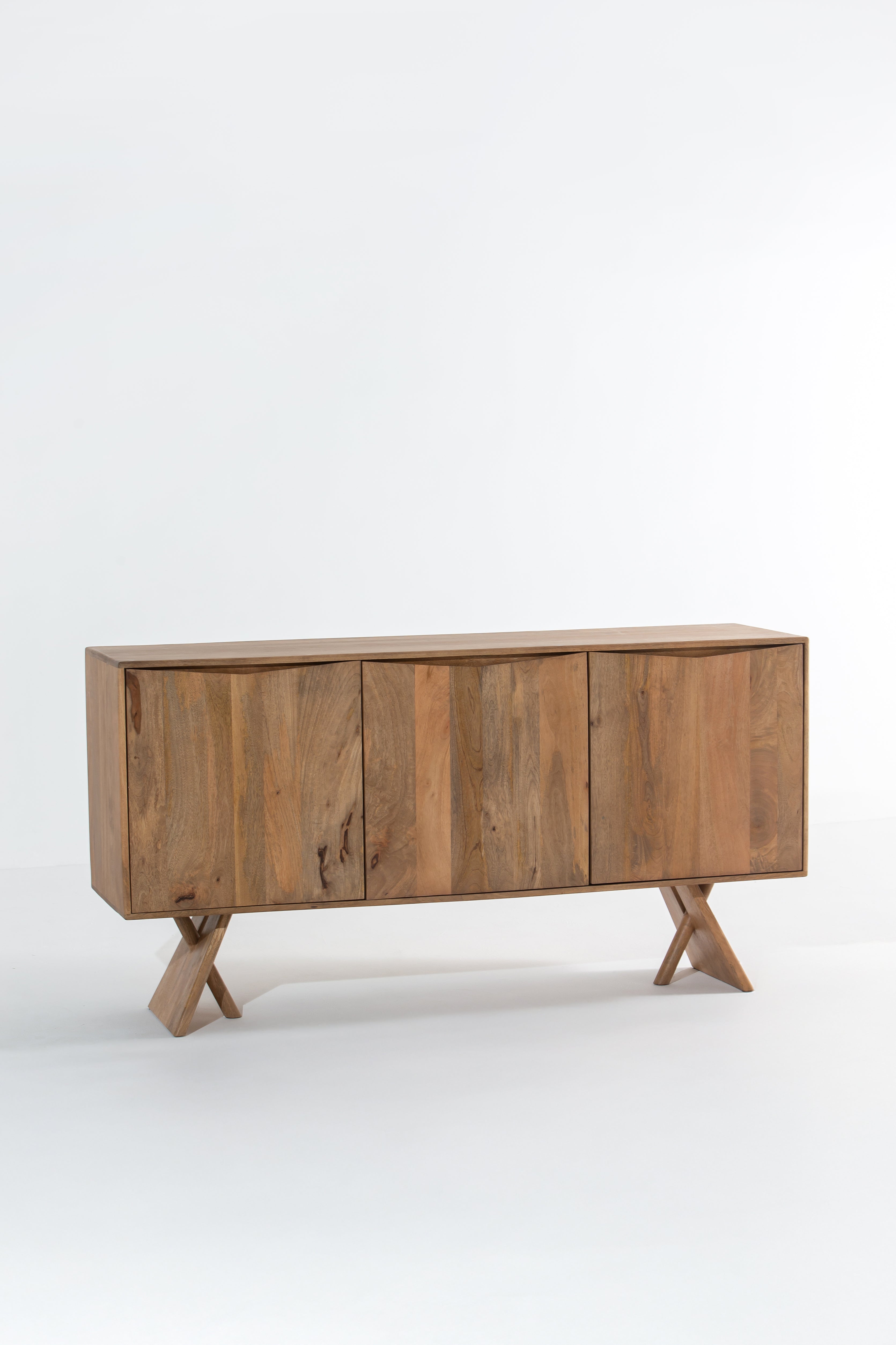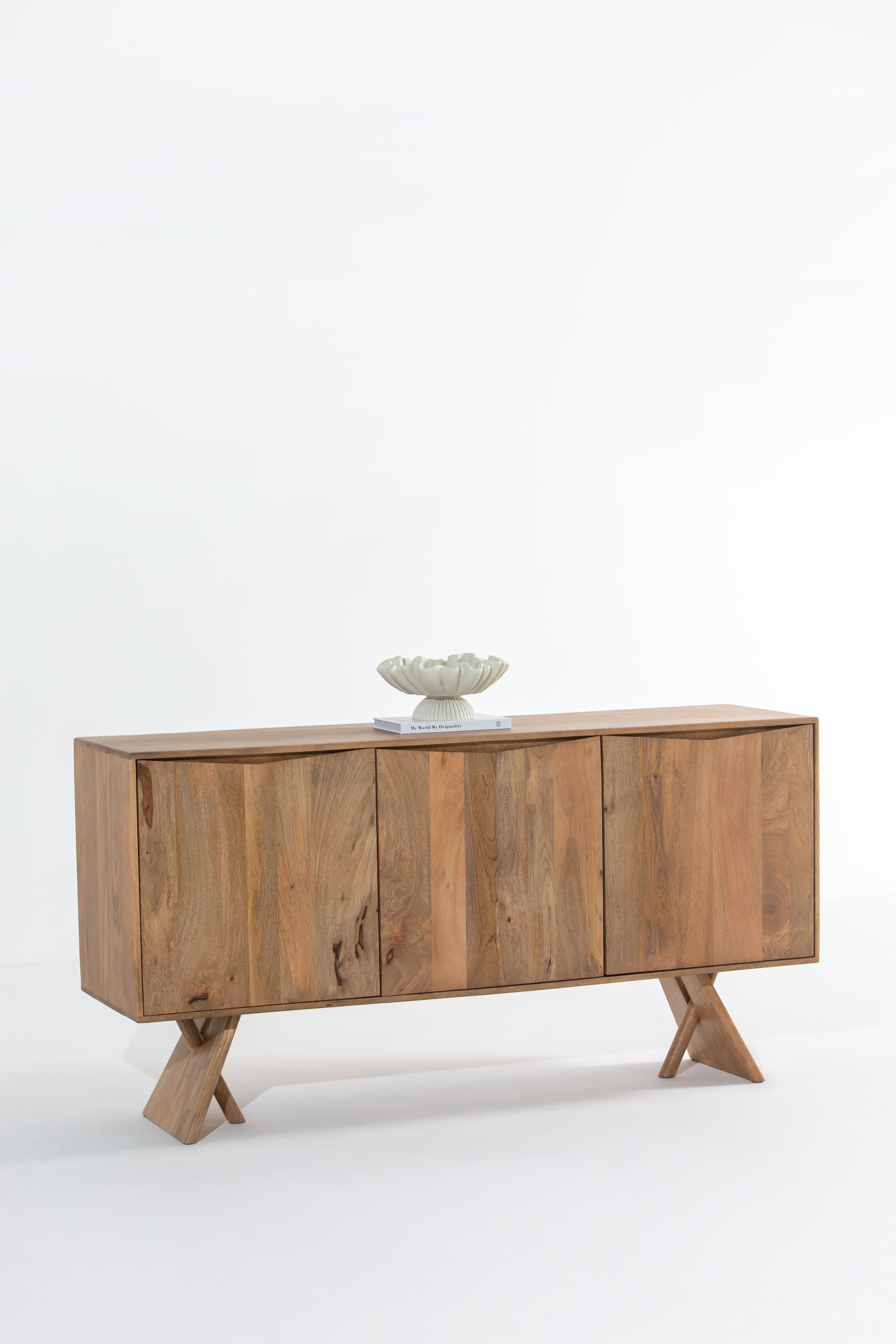 Elevate your storage with this 3-Door Wooden Sideboard, expertly constructed from solid Mindi wood and finished in a natural tone that highlights the rich, organic grain. Its clean, minimalist silhouette is complemented by unique angled X-style legs, lending it a modern sculptural character. The three flush cabinet doors open to spacious compartments with internal shelving—perfect for organizing serveware, linens, or living room essentials. Whether used in a dining area, entryway, or lounge, this sideboard delivers both timeless design and versatile storage with architectural charm.