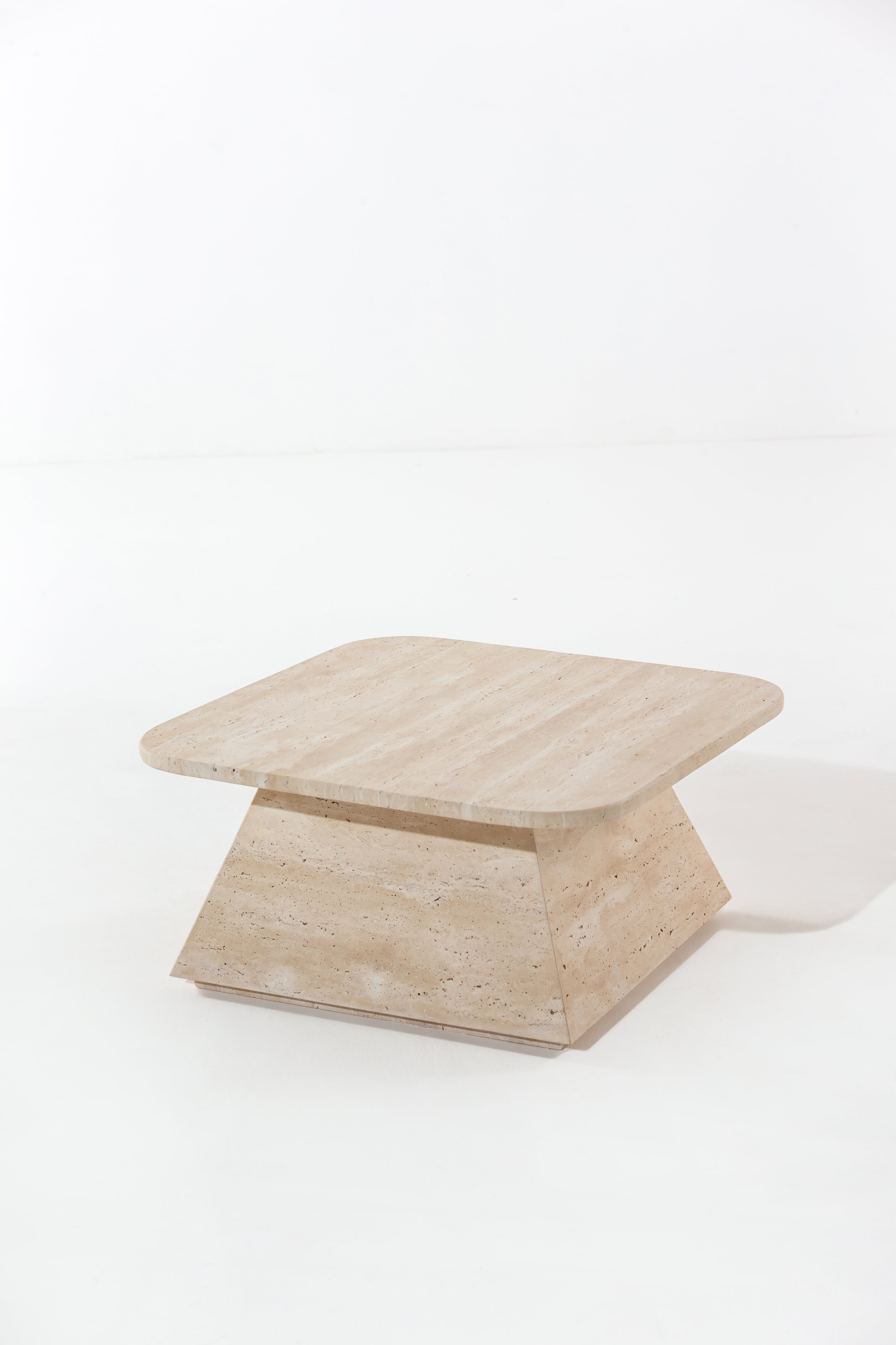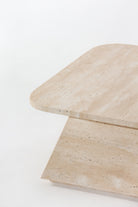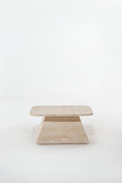 With a refined square silhouette and softly rounded edges, this beige travertine coffee table anchors your space with effortless luxury. The natural stone finish and sculptural tapered base offer a harmonious blend of texture and geometry, creating visual depth from every angle. Whether styled in a minimalist living room or a curated contemporary interior, this table invites you to enjoy beauty in its most grounded form.