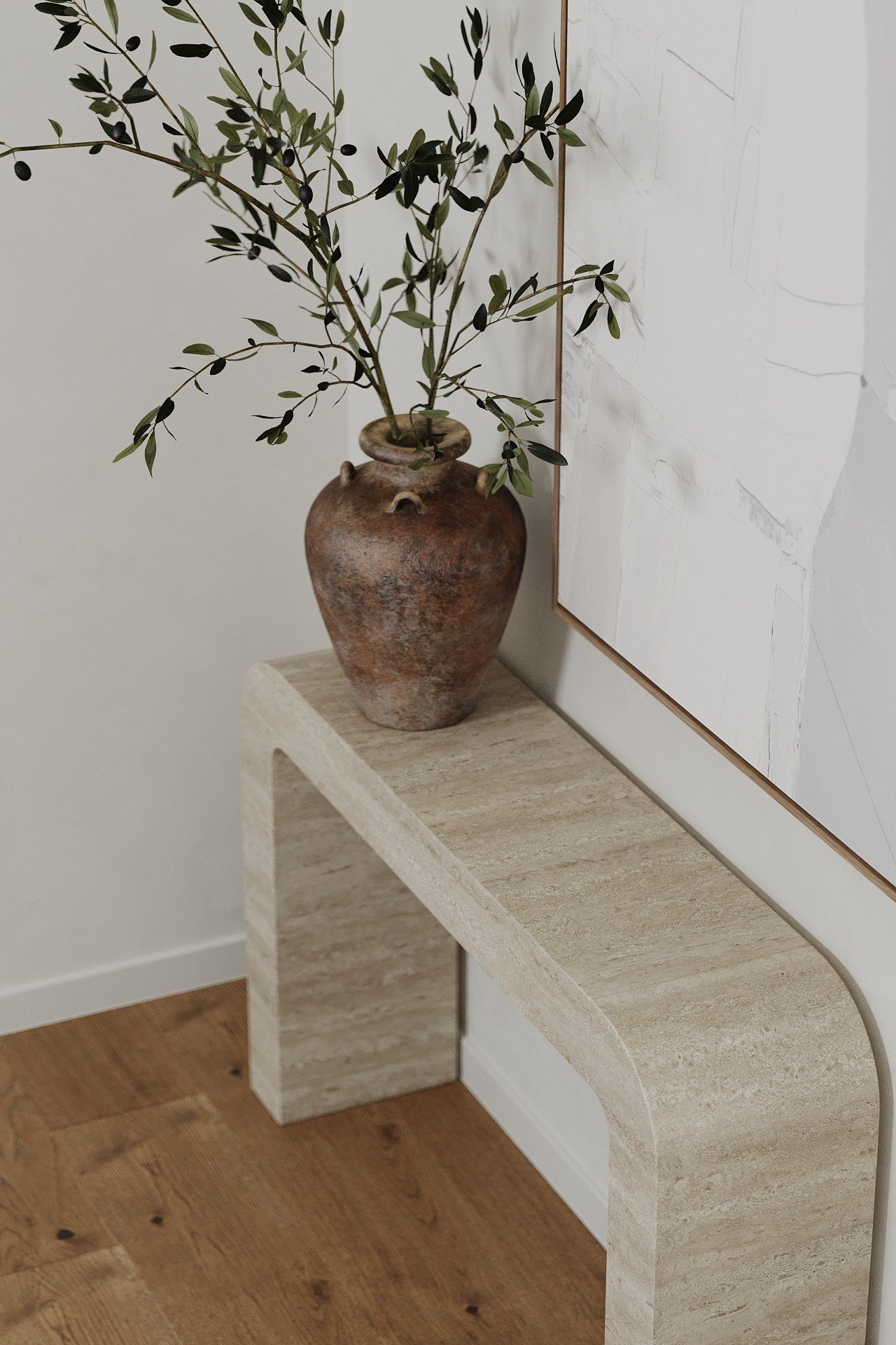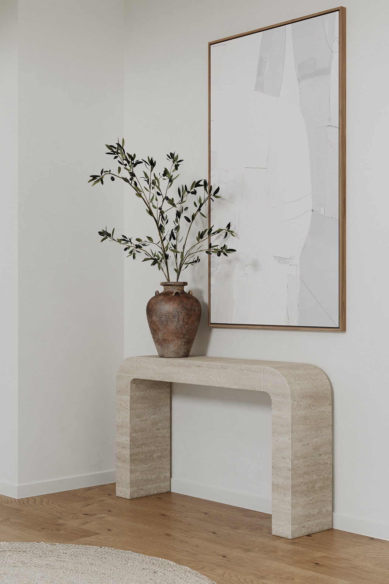 Elevate your entryway with this travertine console table, where sculptural curves meet natural stone elegance. Its arched silhouette and creamy beige tones create a refined statement, effortlessly blending into modern and classic interiors. A versatile piece that serves as a console, hallway accent, or a minimalist display surface.