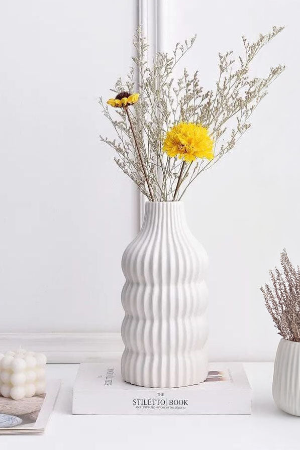 Elevate your home decor with these Layered Wavy Ceramic White Vases, where artistic craftsmanship meets versatile elegance, offering you endless possibilities to curate a space that reflects your unique style and sophistication.