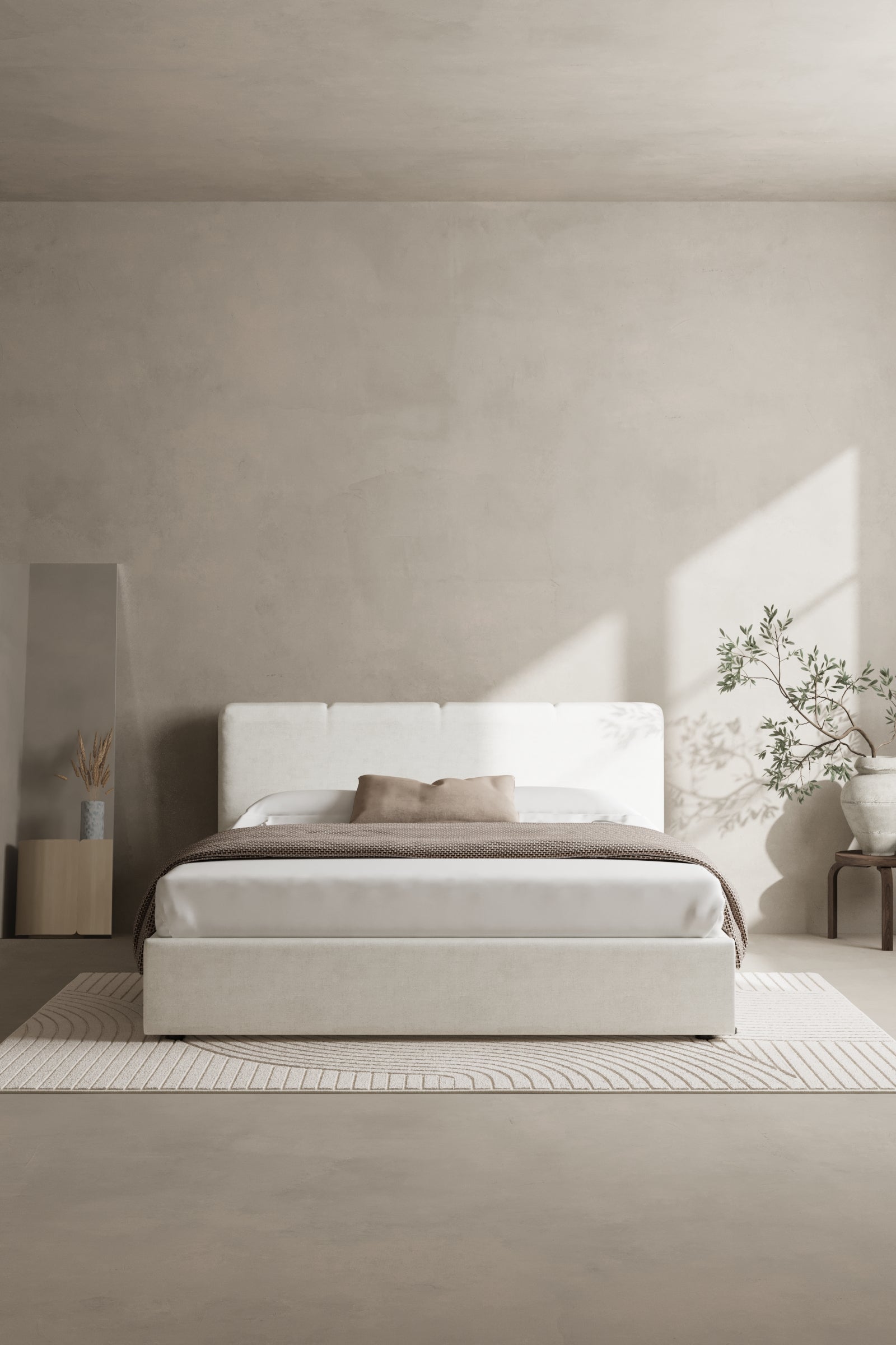 Experience refined elegance with this contemporary bed featuring a minimalist design and clean lines. Upholstered in soft, creamy fabric, its plush headboard offers a touch of sophistication while maintaining comfort. Supported by sleek, black metal legs, this piece brings a subtle contrast to any space, creating a balanced aesthetic perfect for modern bedrooms. Ideal for those who appreciate understated luxury and timeless style.