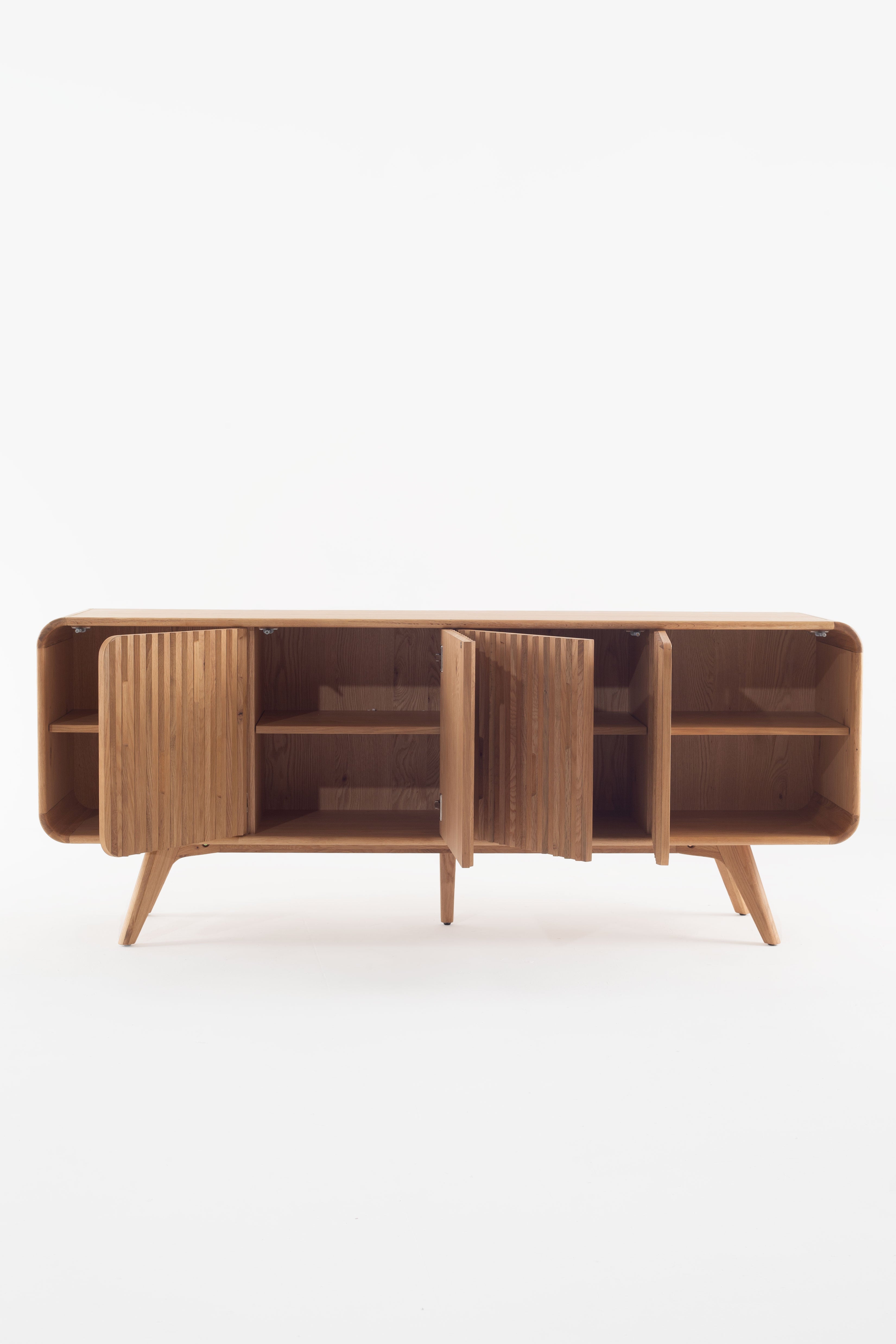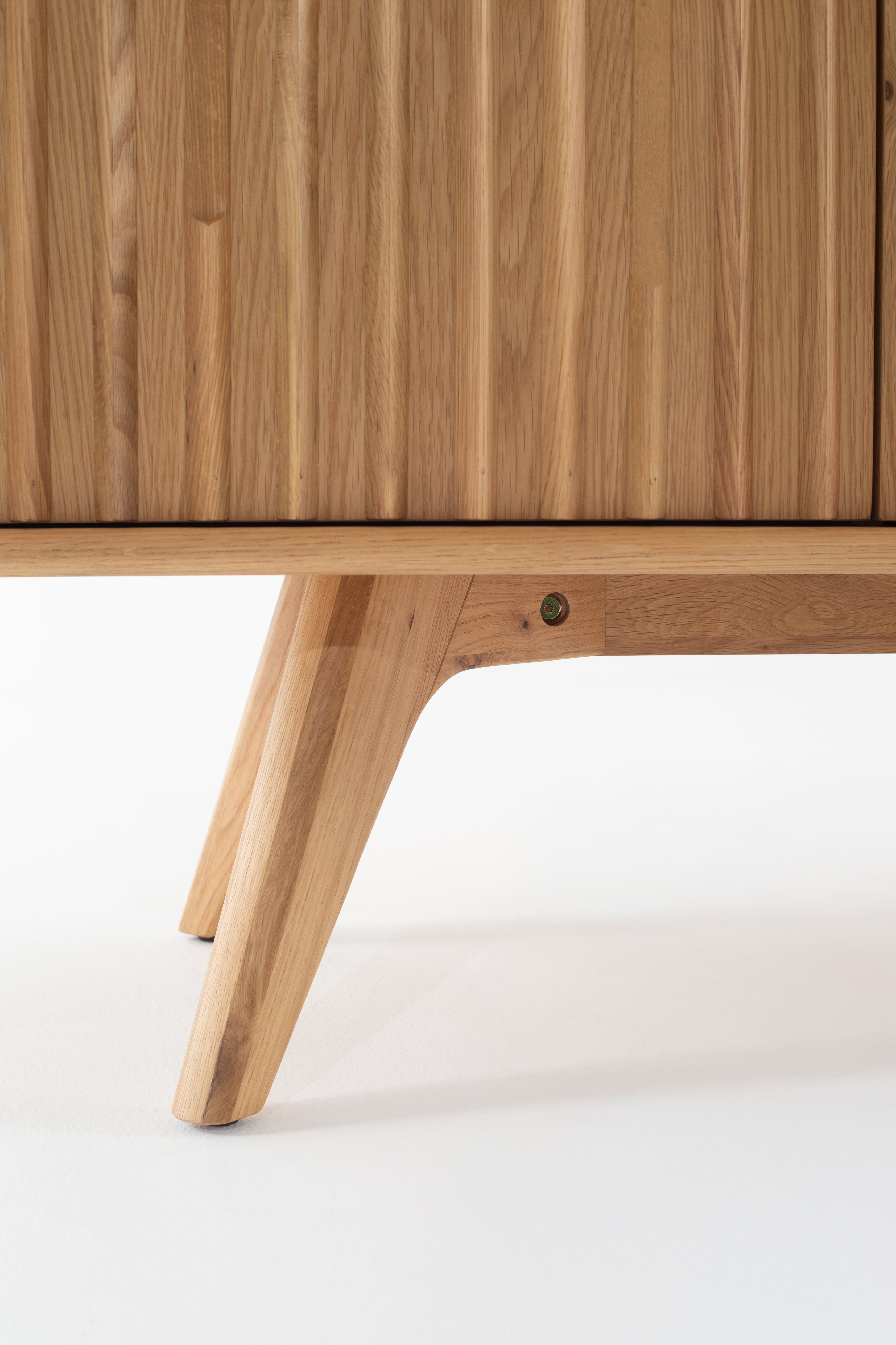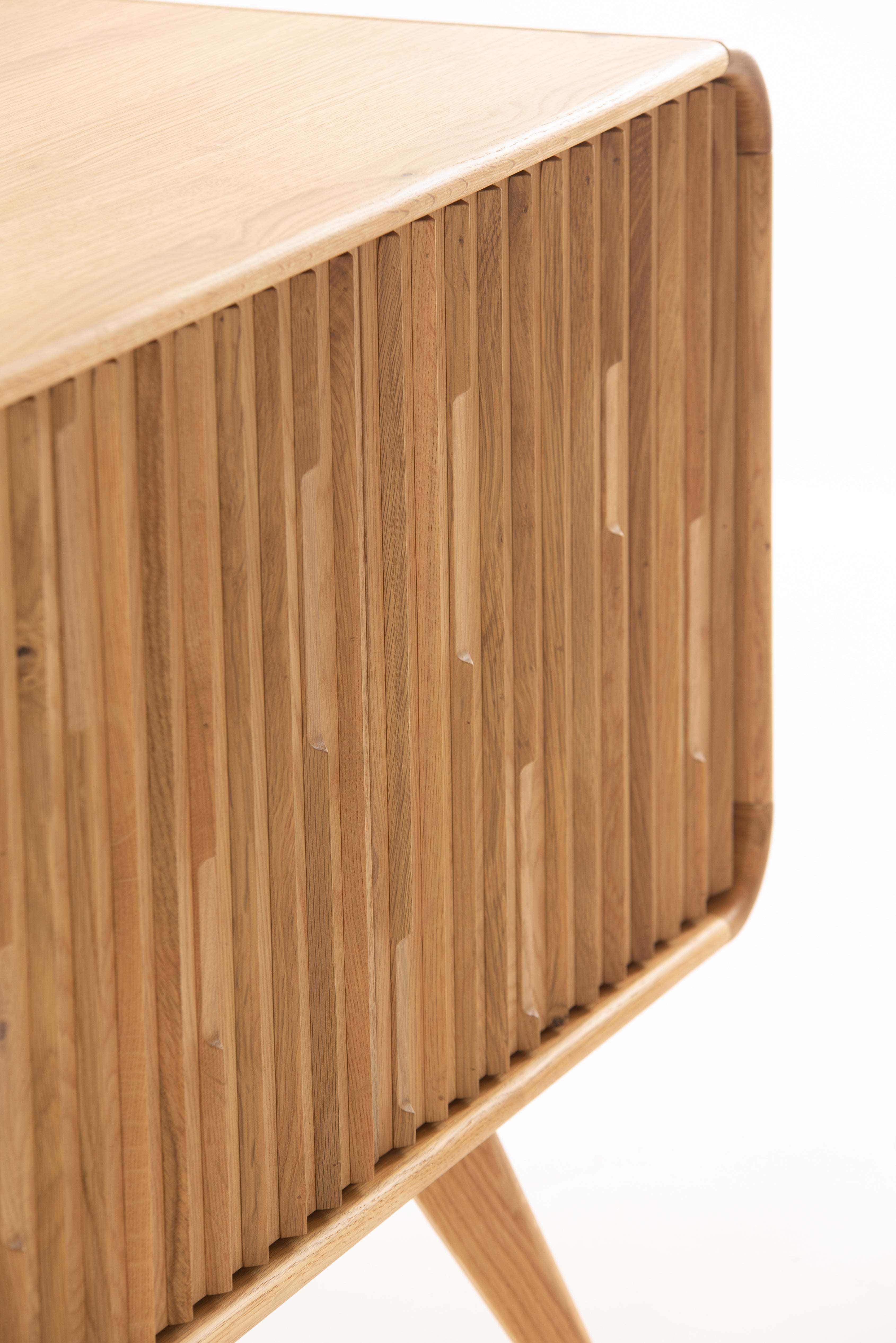 Your space deserves a statement piece that balances functionality and style. Crafted from oak and oak veneer, this sideboard boasts a slatted front that adds depth and texture to its warm, natural wood finish. Softly rounded edges enhance its organic aesthetic, while sturdy tapered legs offer mid-century charm. Behind the sleek push-to-open doors, ample storage awaits to keep your essentials neatly tucked away. Whether placed in the dining area, living room, or entryway, it blends modern sophistication with timeless craftsmanship.