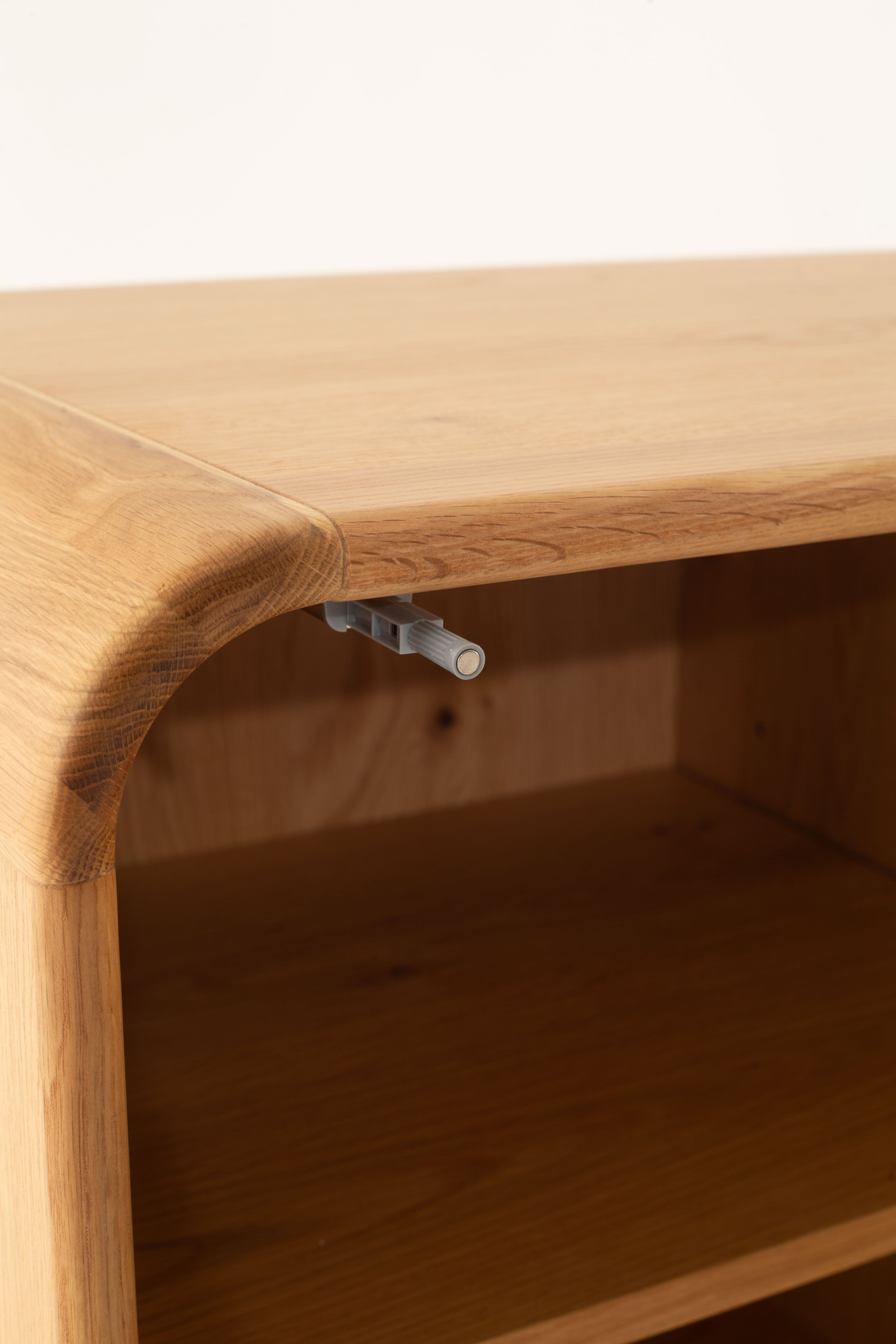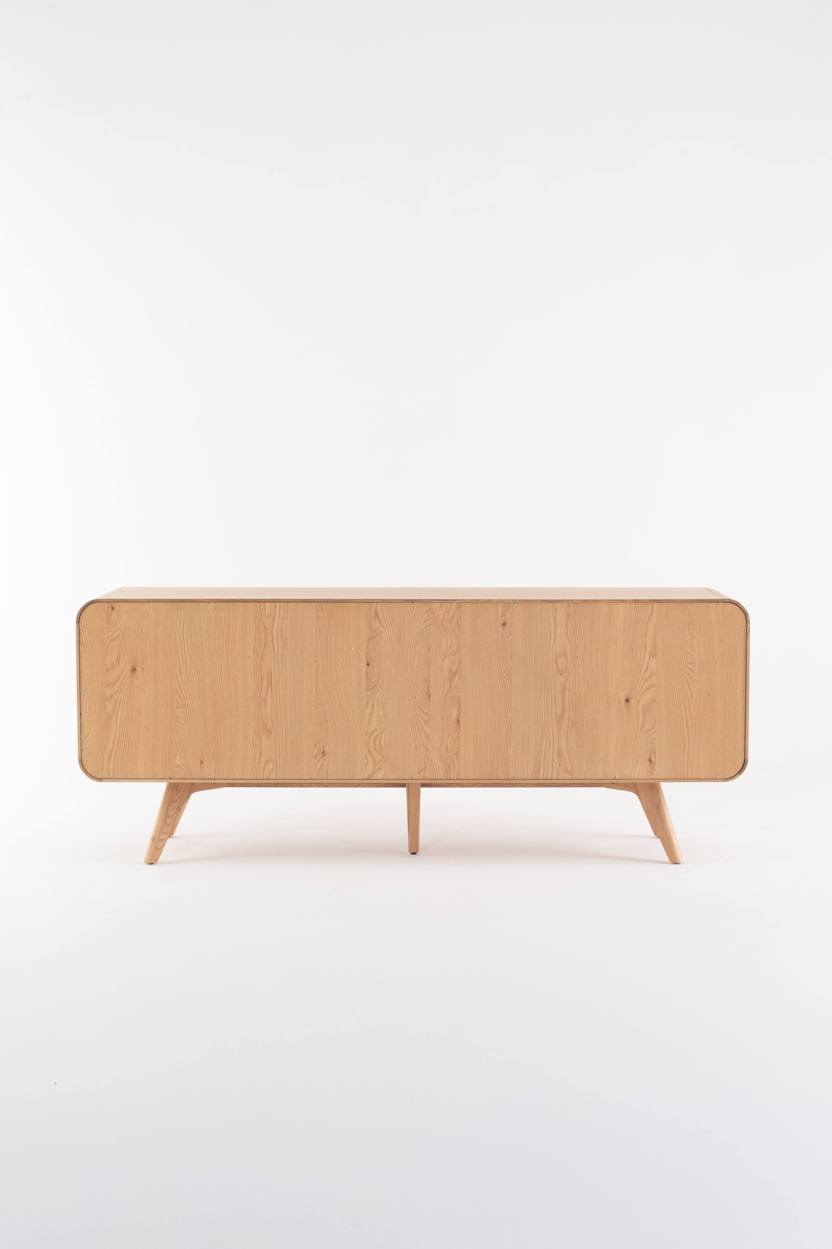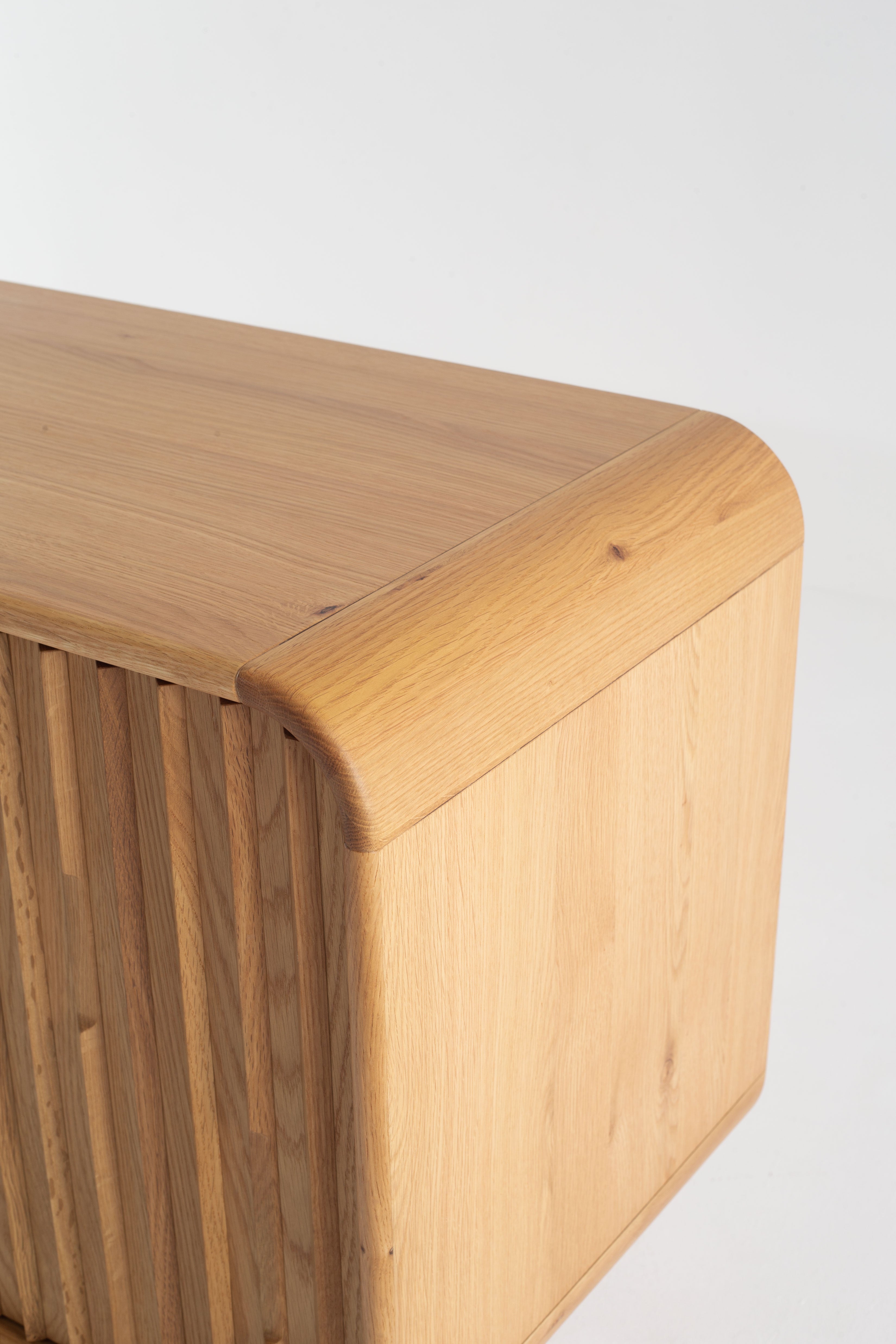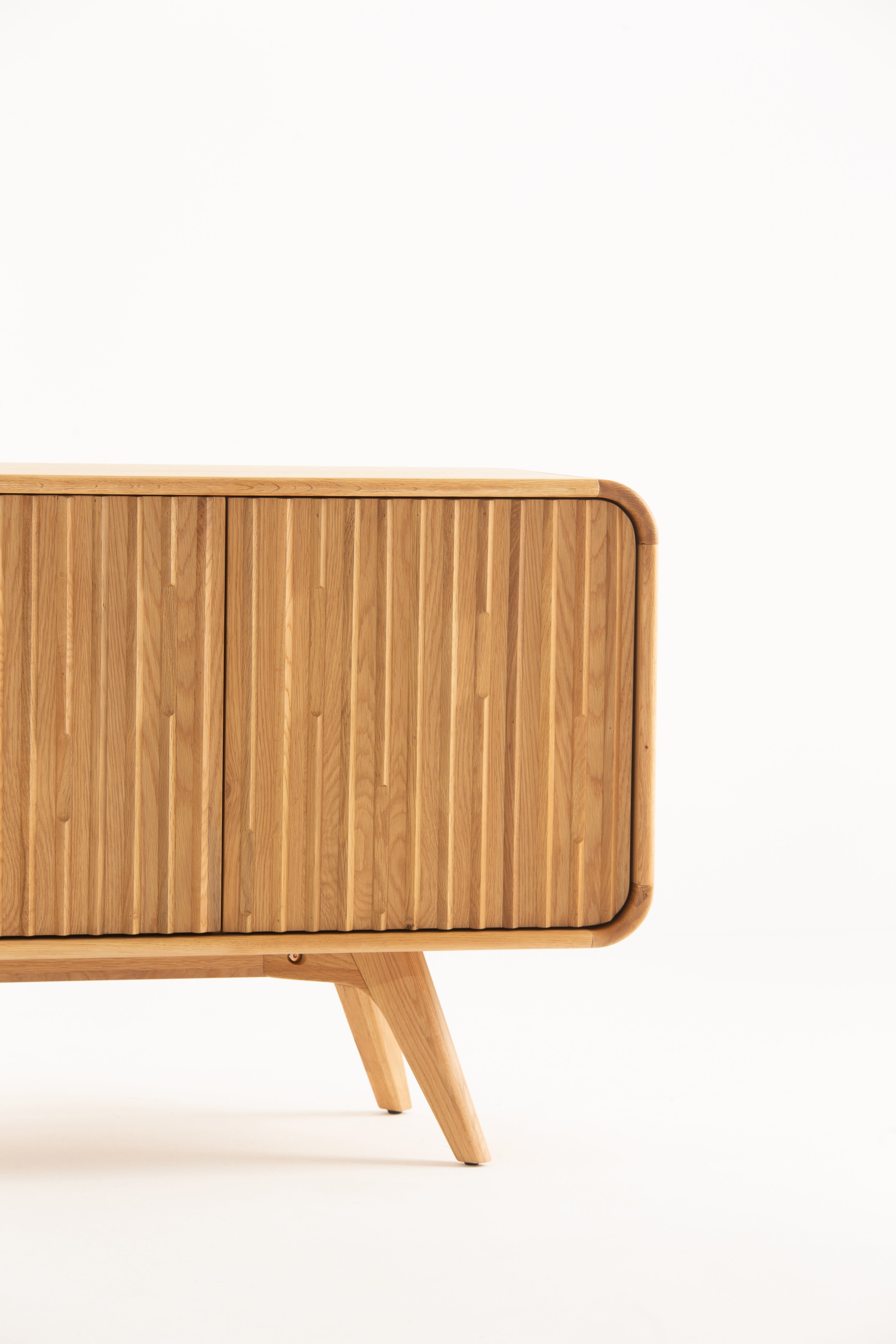 Your space deserves a statement piece that balances functionality and style. Crafted from oak and oak veneer, this sideboard boasts a slatted front that adds depth and texture to its warm, natural wood finish. Softly rounded edges enhance its organic aesthetic, while sturdy tapered legs offer mid-century charm. Behind the sleek push-to-open doors, ample storage awaits to keep your essentials neatly tucked away. Whether placed in the dining area, living room, or entryway, it blends modern sophistication with timeless craftsmanship.