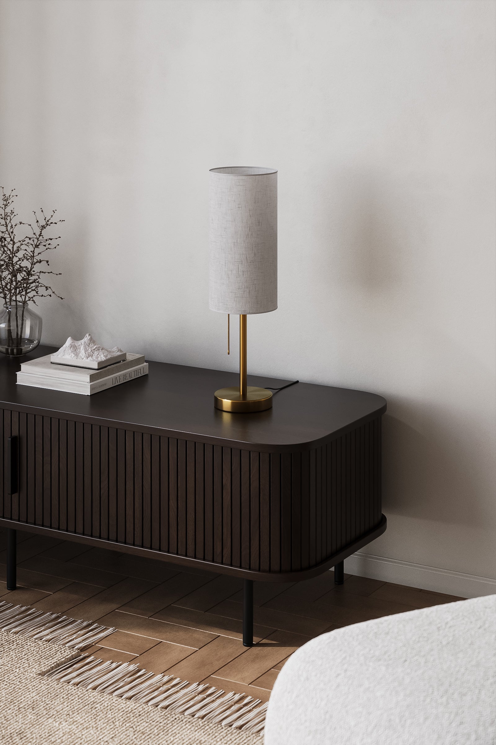 Crafted with elegance, this table lamp features a sleek cylindrical fabric shade in a soft off-white hue, diffusing a warm glow for a cozy ambiance. The brushed gold base adds a touch of modern sophistication, complementing both classic and contemporary interiors. Its tall, slender profile makes it a perfect accent for bedside tables, consoles, or workspaces, while the pull-chain switch enhances convenience. Whether illuminating your reading nook or elevating your decor, this lamp blends functionality with timeless design.