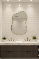 This mirror features a flowing irregular shape framed in a slim gold border that adds warmth and subtle shine. The reflective surface enhances light and depth, while its organic outline introduces movement that complements bedrooms, living areas, or entryways. The metallic edging contrasts elegantly with the glass, turning a functional piece into a refined accent suited to modern and contemporary interiors.