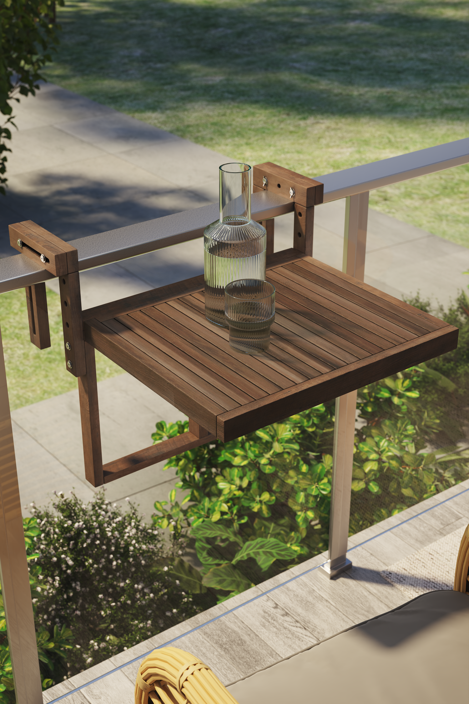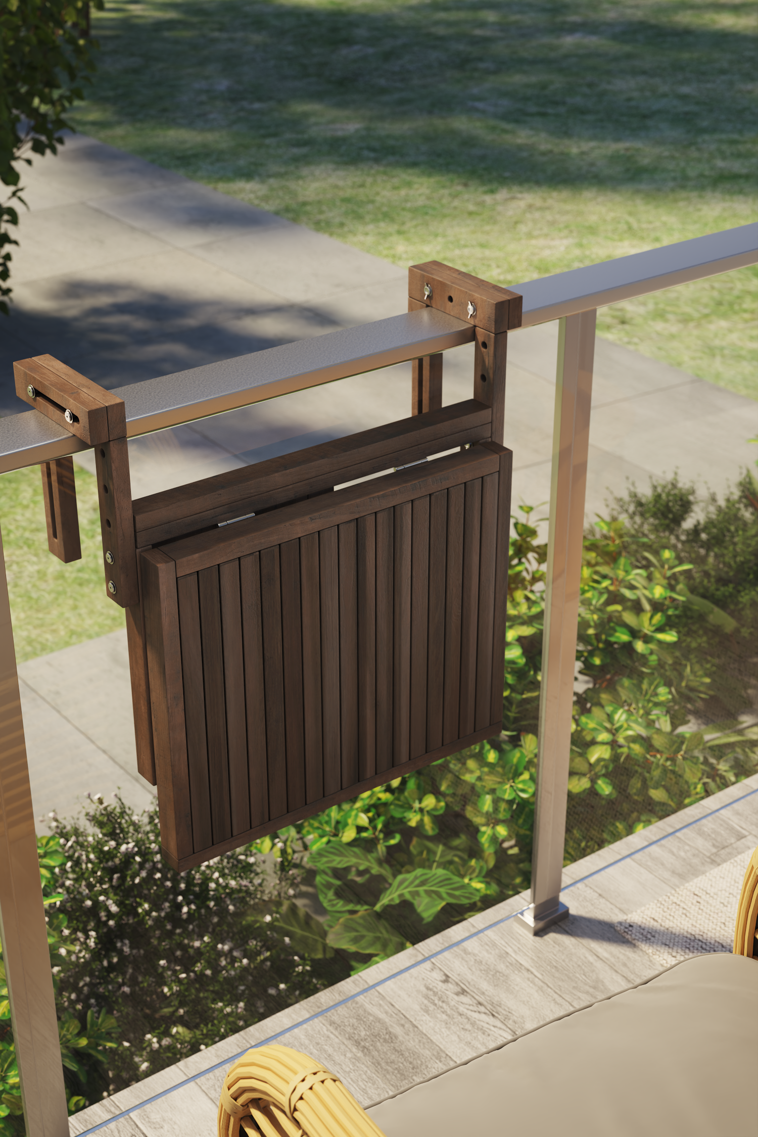 Transform your balcony into a relaxing retreat with this elegant folding outdoor table crafted from rich espresso wood. The smooth slatted surface exudes a natural warmth, while the deep espresso tone adds a refined, modern charm that complements any outdoor décor. Designed to mount securely on most railings, its adjustable metal brackets provide a sturdy and flexible fit. The foldable design lets you create an intimate spot for morning coffee or evening drinks, then tuck it away effortlessly when not in use. The sleek rectangular shape and fine wood grain texture give it a handcrafted, luxurious appeal, making every moment outdoors feel like a serene escape. Perfect for small balconies, patios, or urban terraces, this table blends practicality with timeless style.