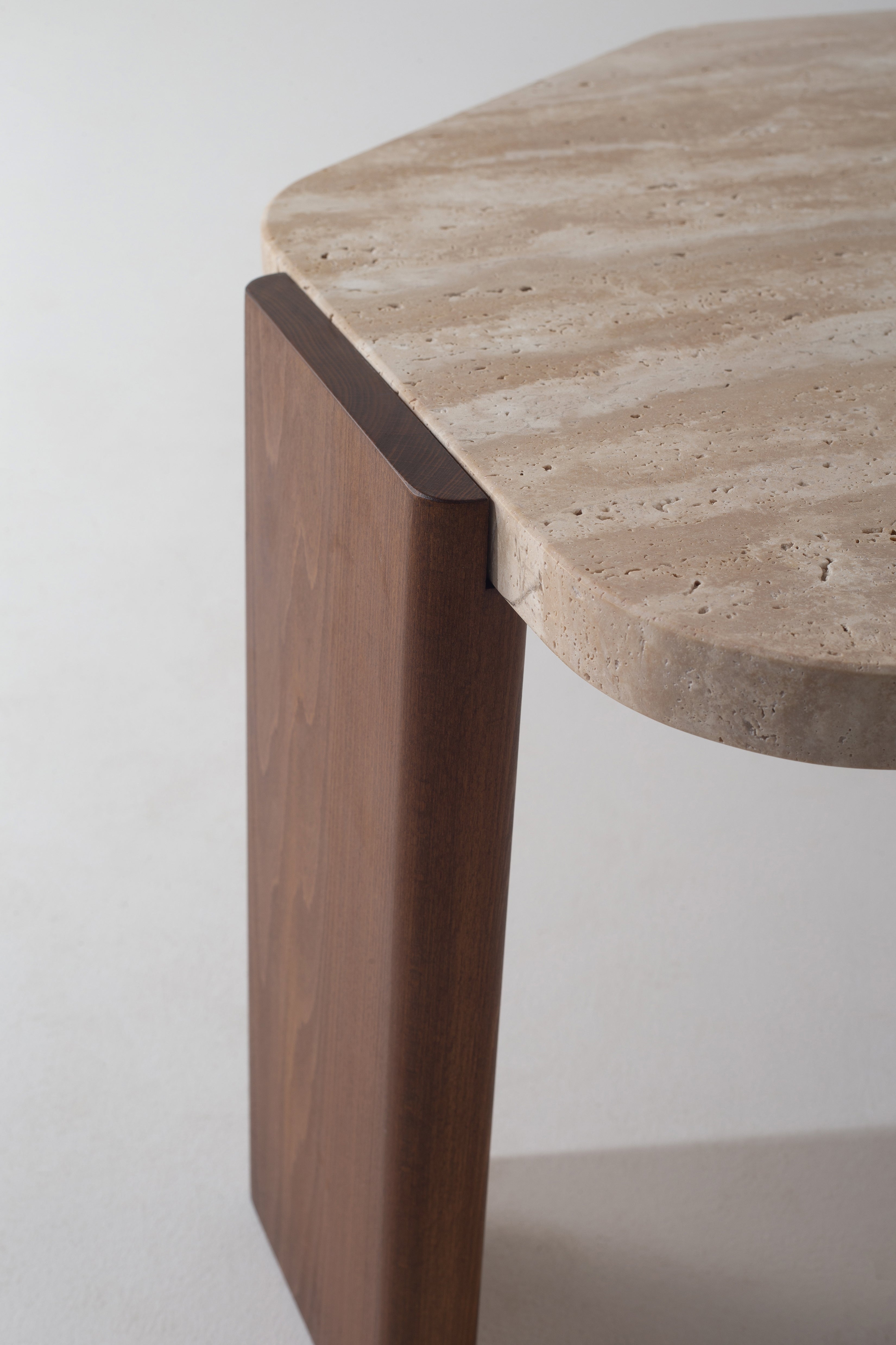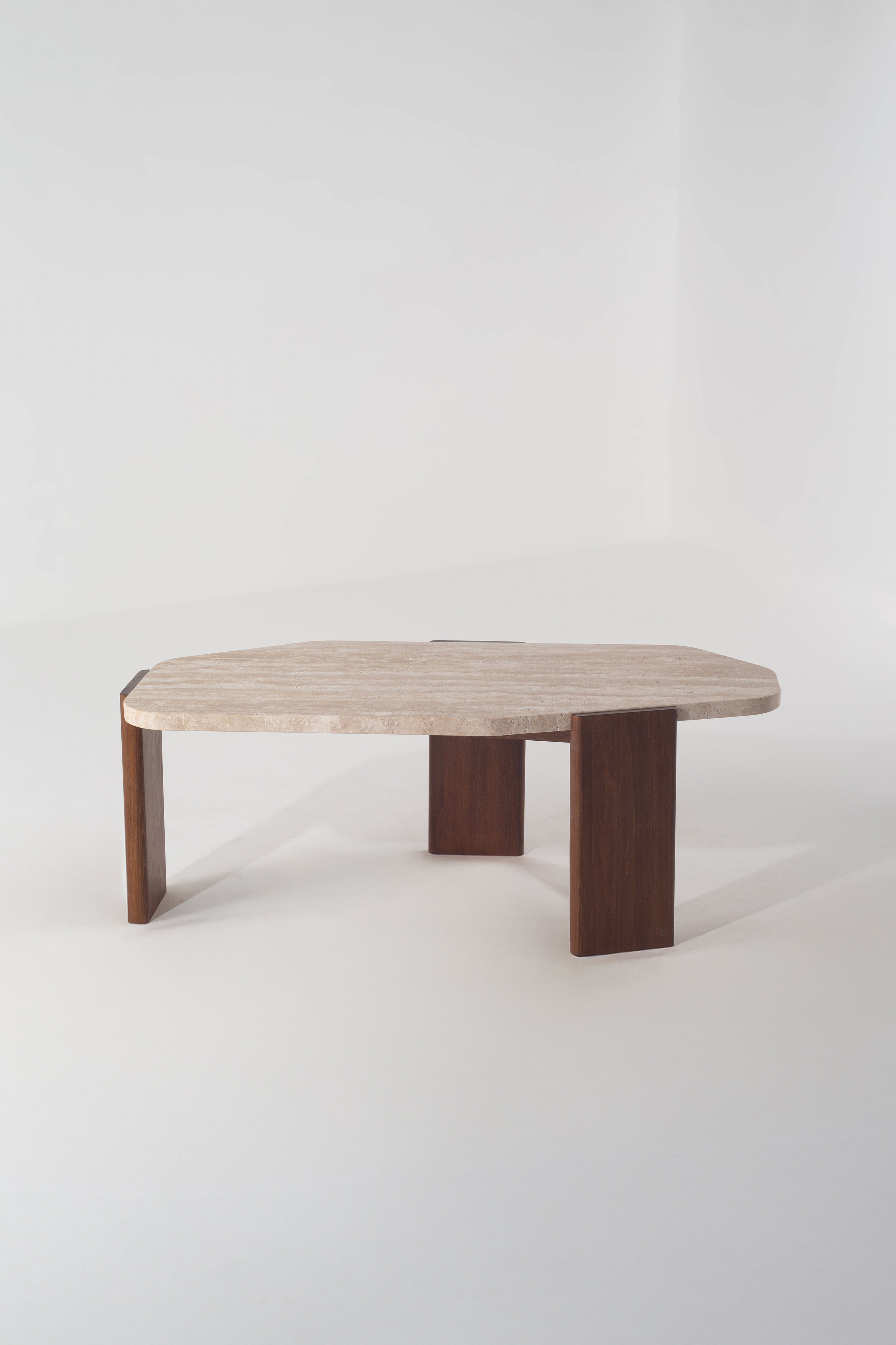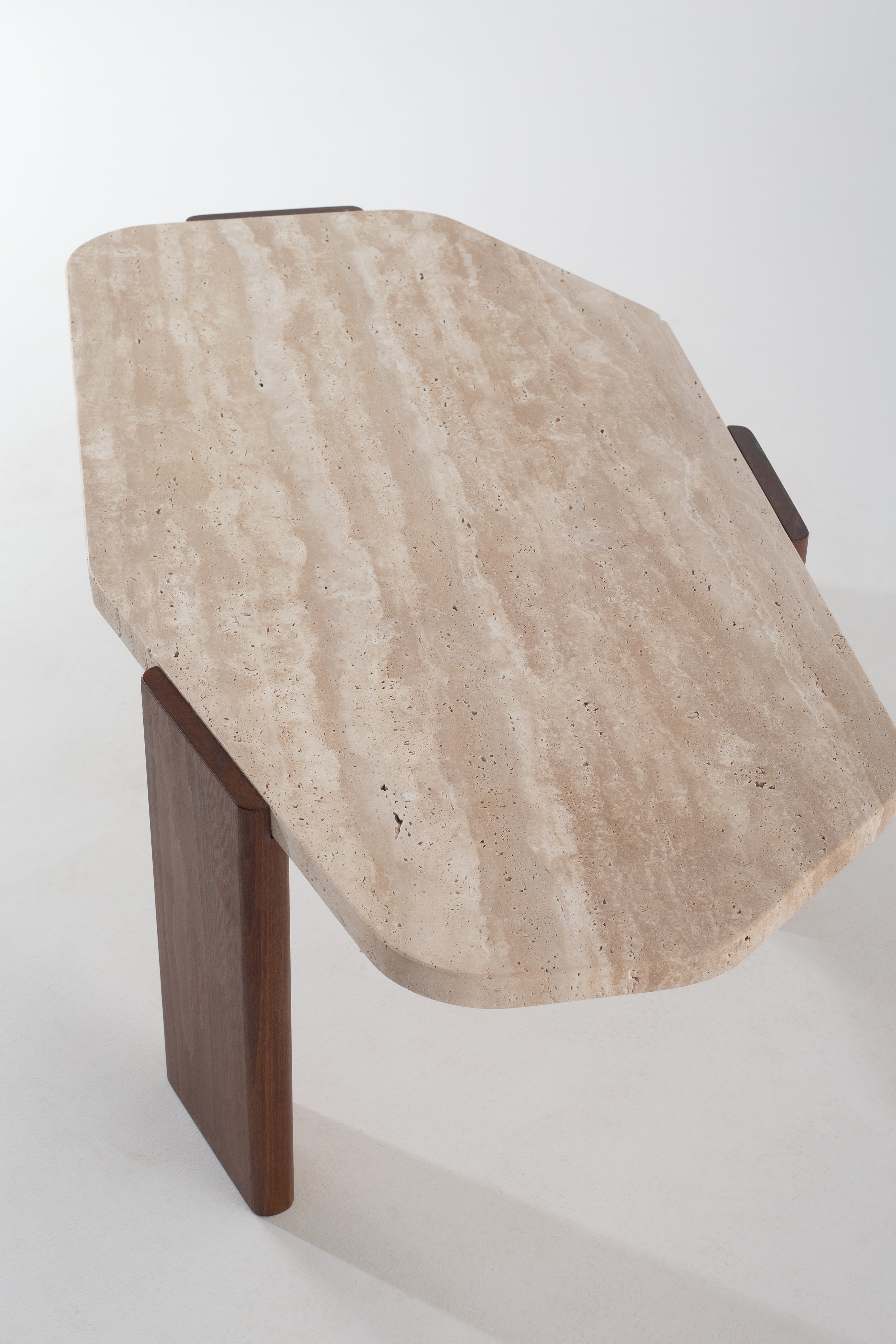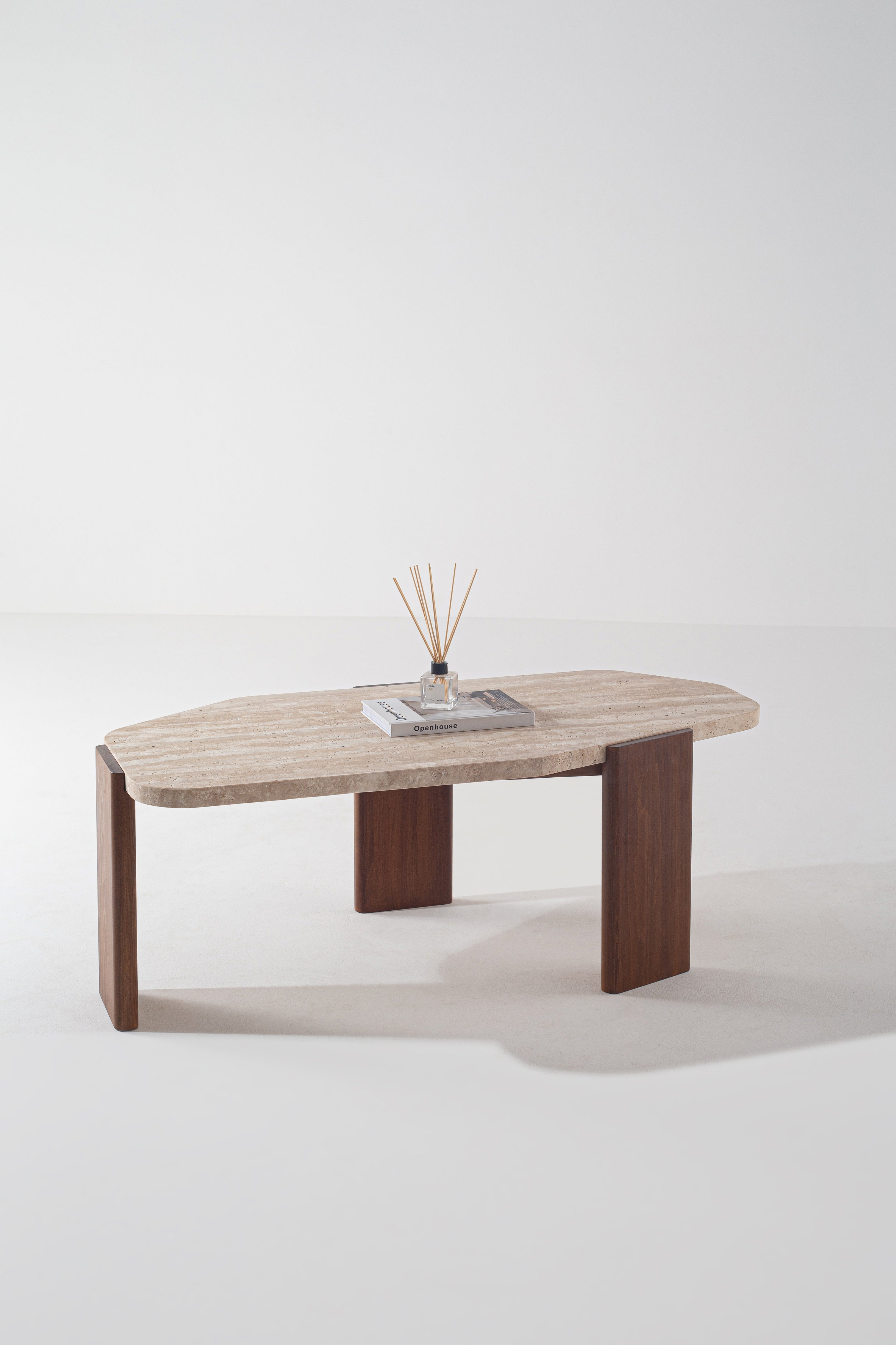 An artful balance of organic beauty and geometric structure, this travertine coffee table brings sculptural elegance to your space. The faceted travertine top showcases natural textures and earthy tones, while the solid walnut-finished wooden legs provide a bold, architectural foundation. Its asymmetrical shape adds a modern edge, making it a true statement piece for contemporary interiors. Whether styled with minimal decor or layered with accents, this luxury coffee table offers a refined yet inviting presence, blending raw stone textures with sleek craftsmanship effortlessly.
