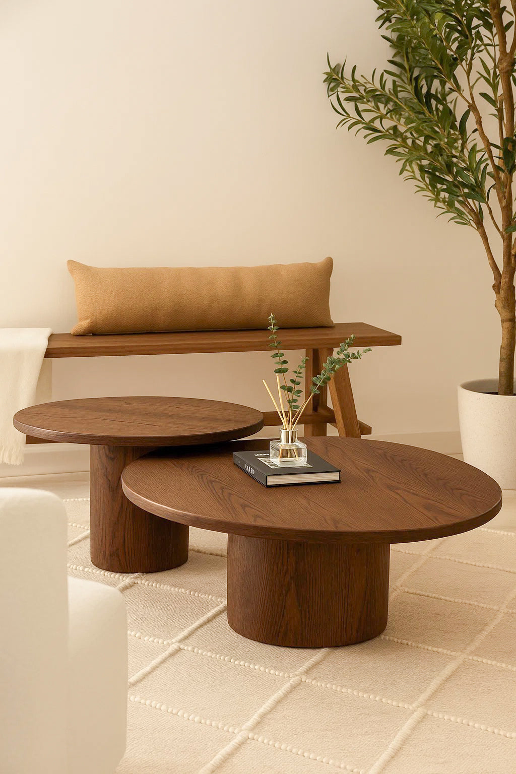 Imagine transforming your living room with a coffee table set that blends style and practicality effortlessly. These nesting tables feature a rich dark brown finish that enhances the natural wood texture, while their smooth circular tops and cylindrical bases create a bold, sculptural silhouette. The versatile design allows you to use them together as a layered centerpiece or separately for added functionality, making them perfect for serving, displaying décor, or anchoring your modern space with timeless elegance.