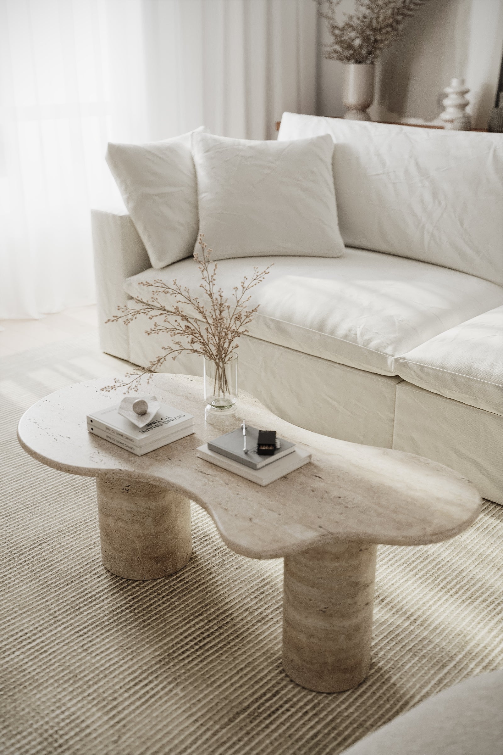 Make your living room a canvas for conversation and unique style with this stunning coffee table, crafted from natural travertine. Showcasing a beautiful porous texture and a soft, earthy beige color, it features a distinct freeform, asymmetrical shape that adds an organic, sculptural element to any space. Two solid cylindrical bases provide stable support for the uniquely shaped tabletop, creating a harmonious balance and timeless elegance. Perfect as both a functional surface and a statement piece, its flowing design inspires memorable moments and elevates the character of your living room.