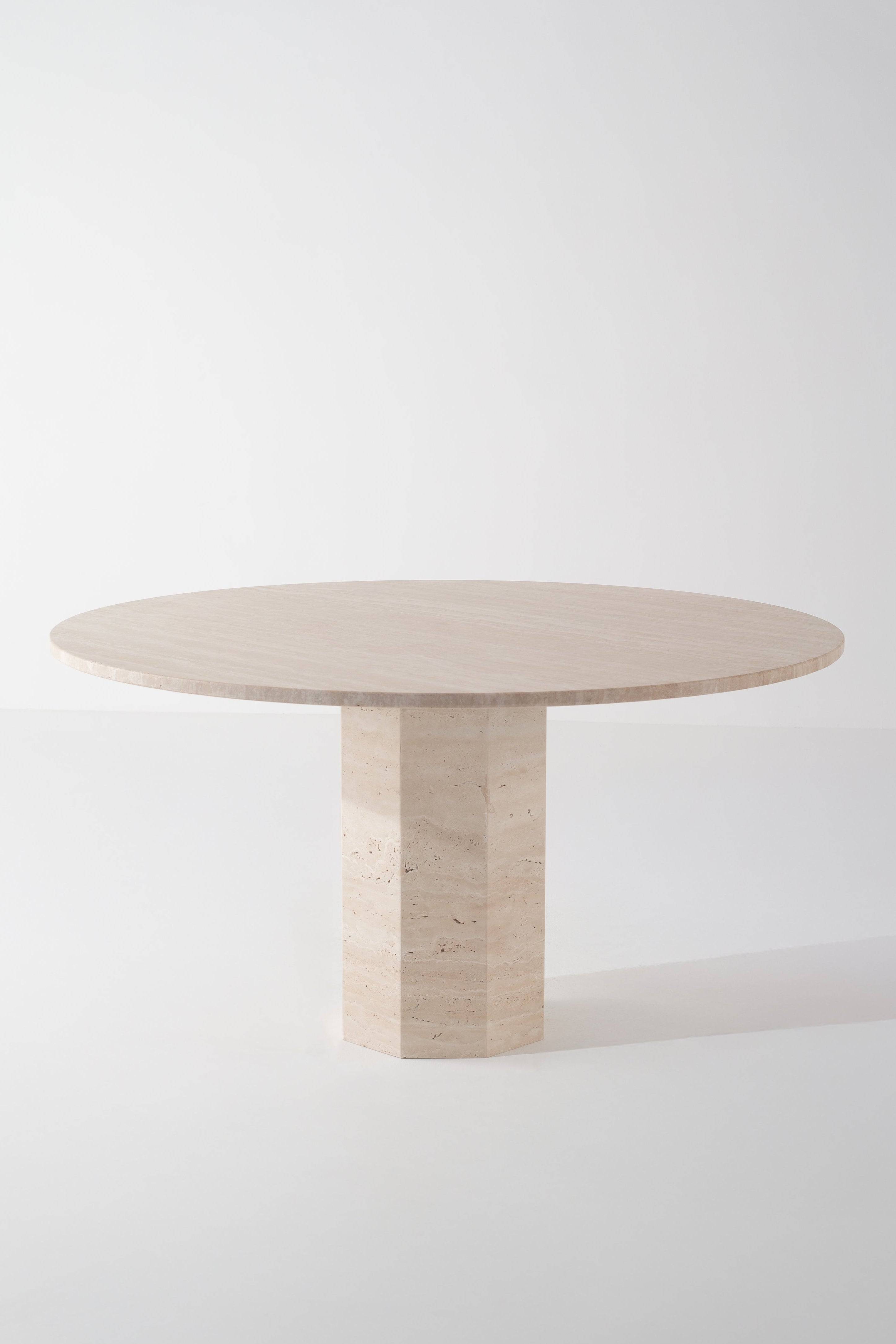 The moment you step into your dining space, your eyes are drawn to the striking hexagonal base, carved from light beige travertine, grounding the room with its sculptural presence. Your fingertips glide across the smooth, warm beige top, tracing the organic veins that make each piece unique. Whether hosting or enjoying a quiet moment, this table transforms your space into an elegant retreat, where timeless design meets natural beauty.