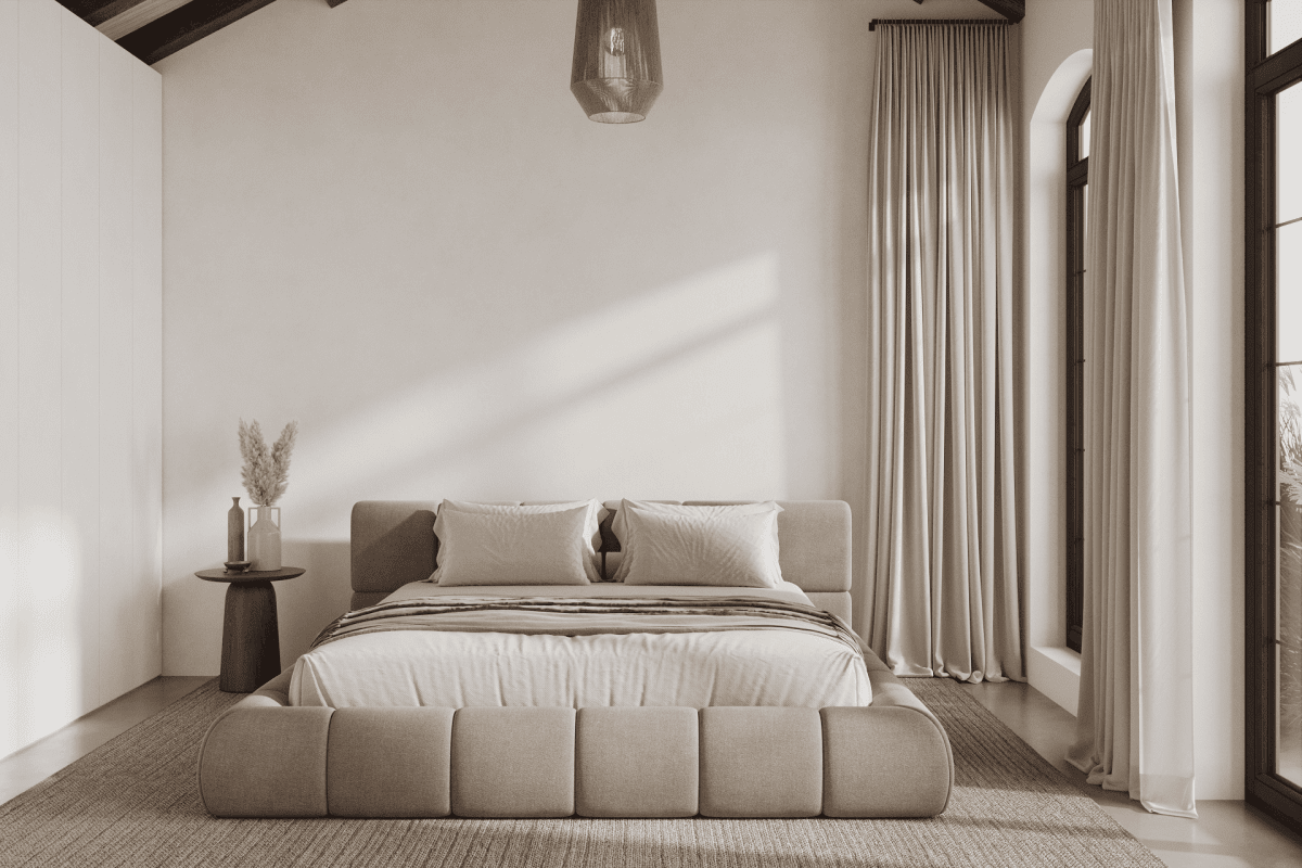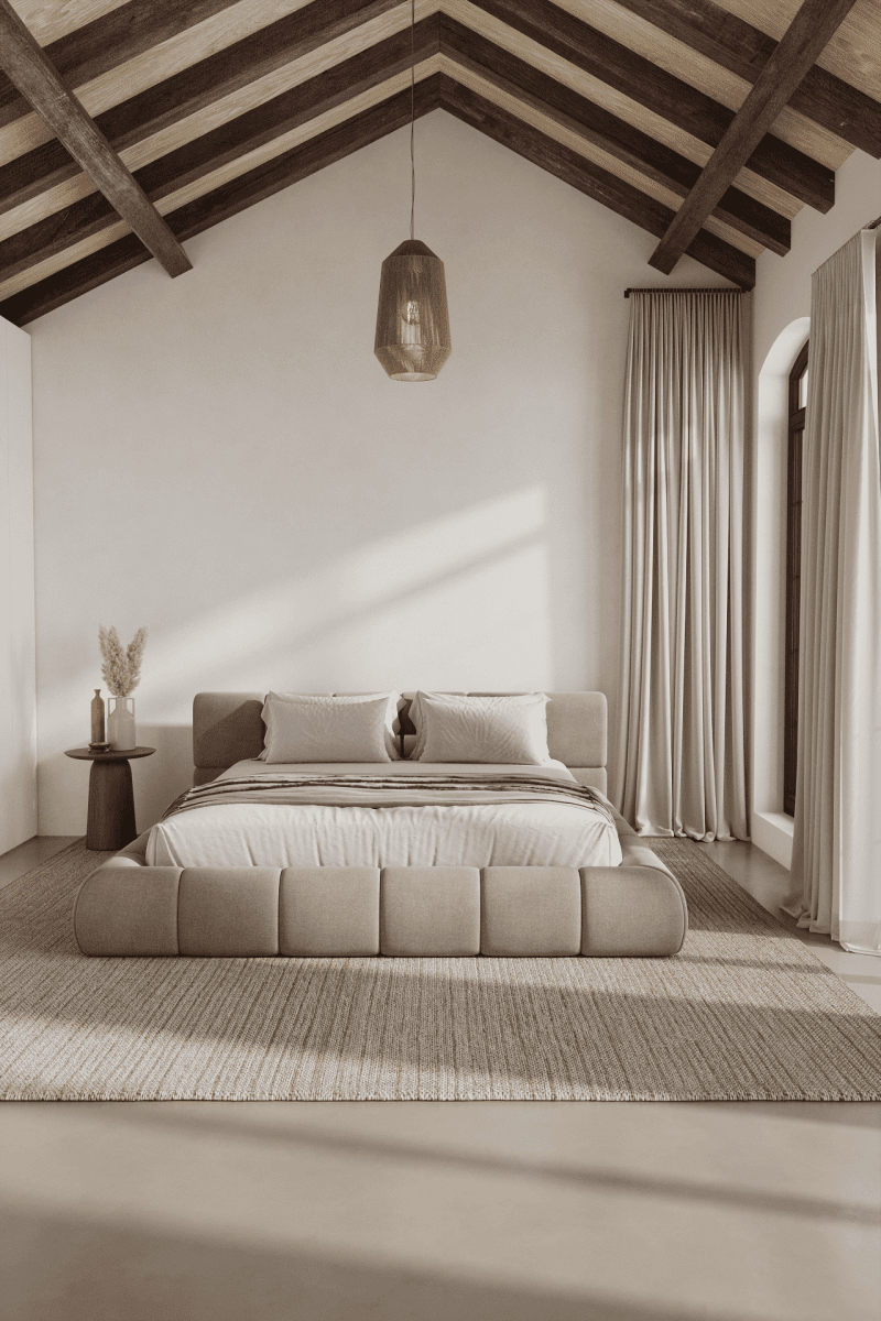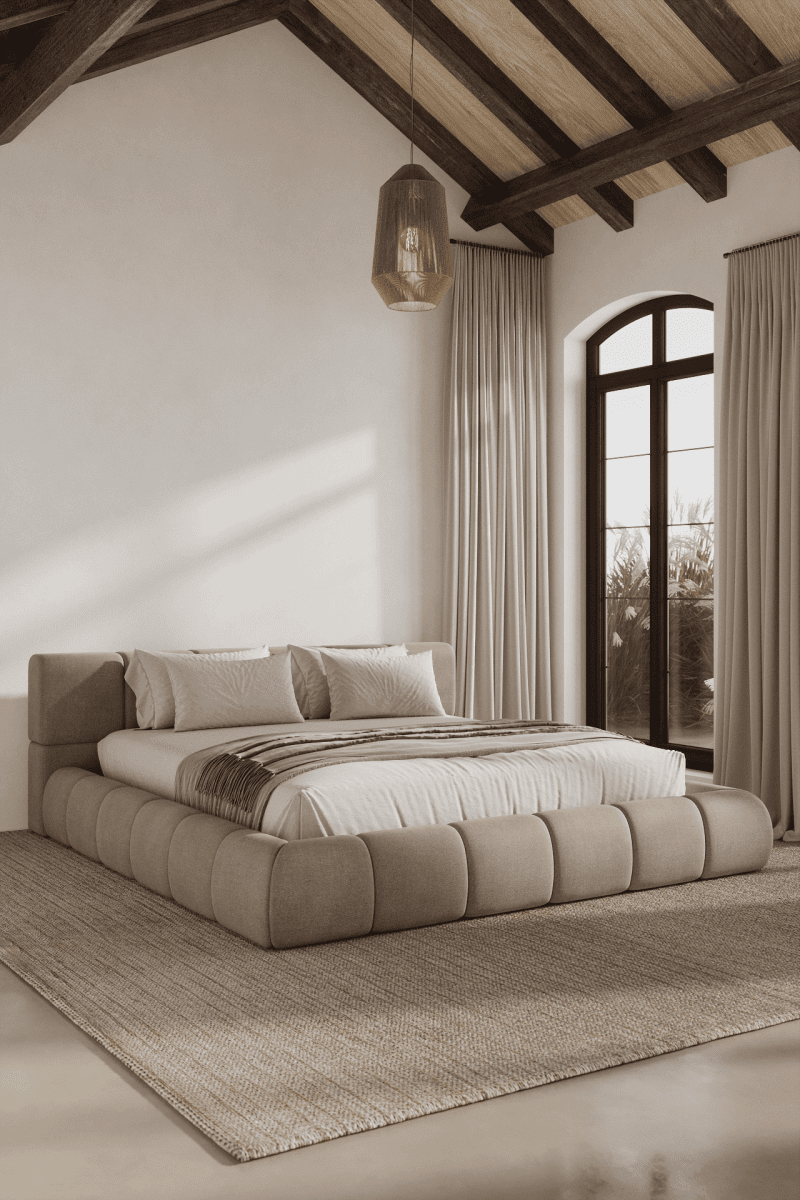 This Bed is crafted with a plush upholstered frame finished in champagne beige, bringing a soft, refined presence to your bedroom. Its low-profile platform silhouette and generously padded design create an inviting sense of comfort while maintaining a minimalist aesthetic. Smooth fabric texture paired with tailored stitching highlights craftsmanship, making it a versatile piece that complements modern, contemporary, and serene interiors. A centerpiece that blends elegance with everyday comfort.