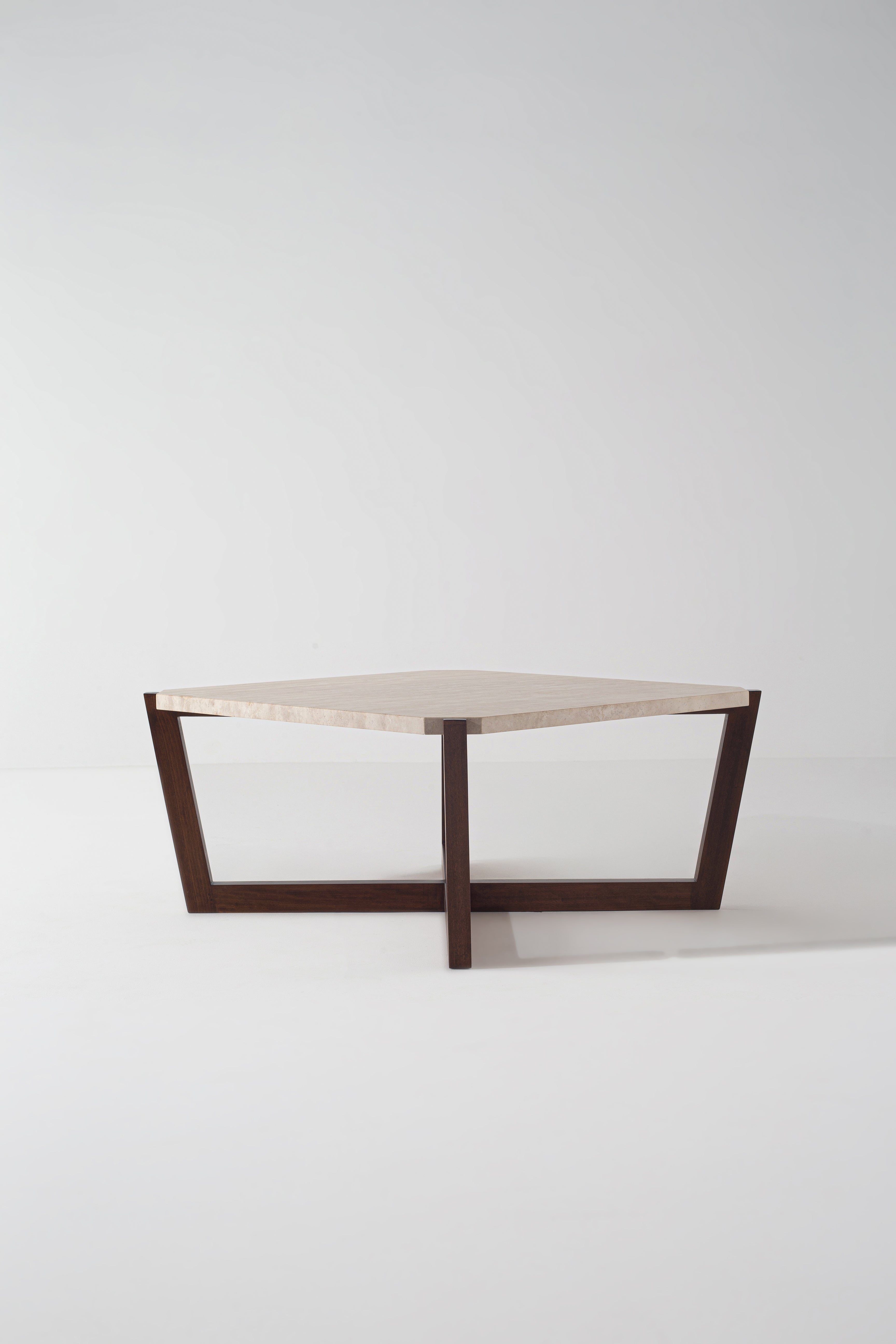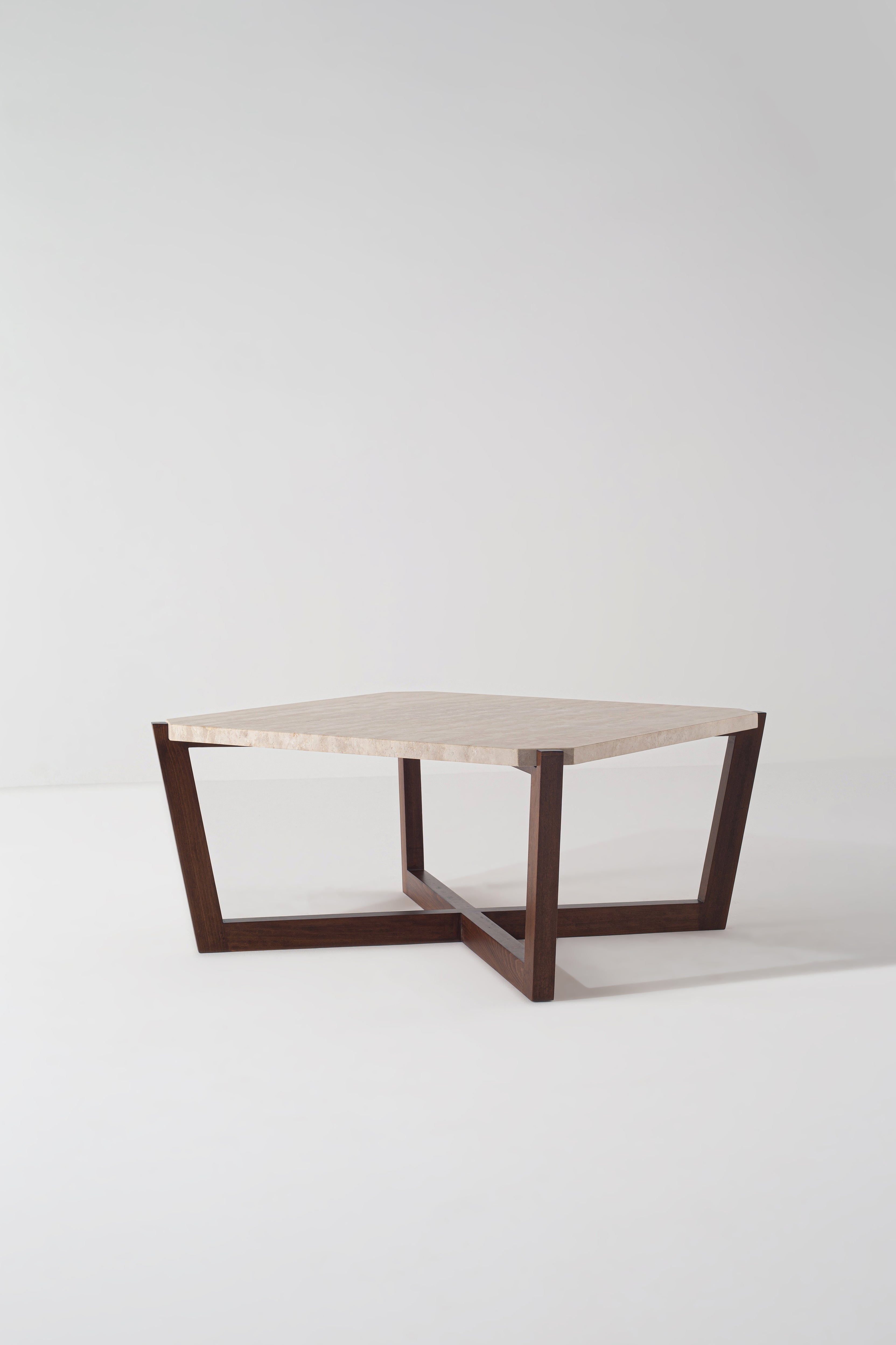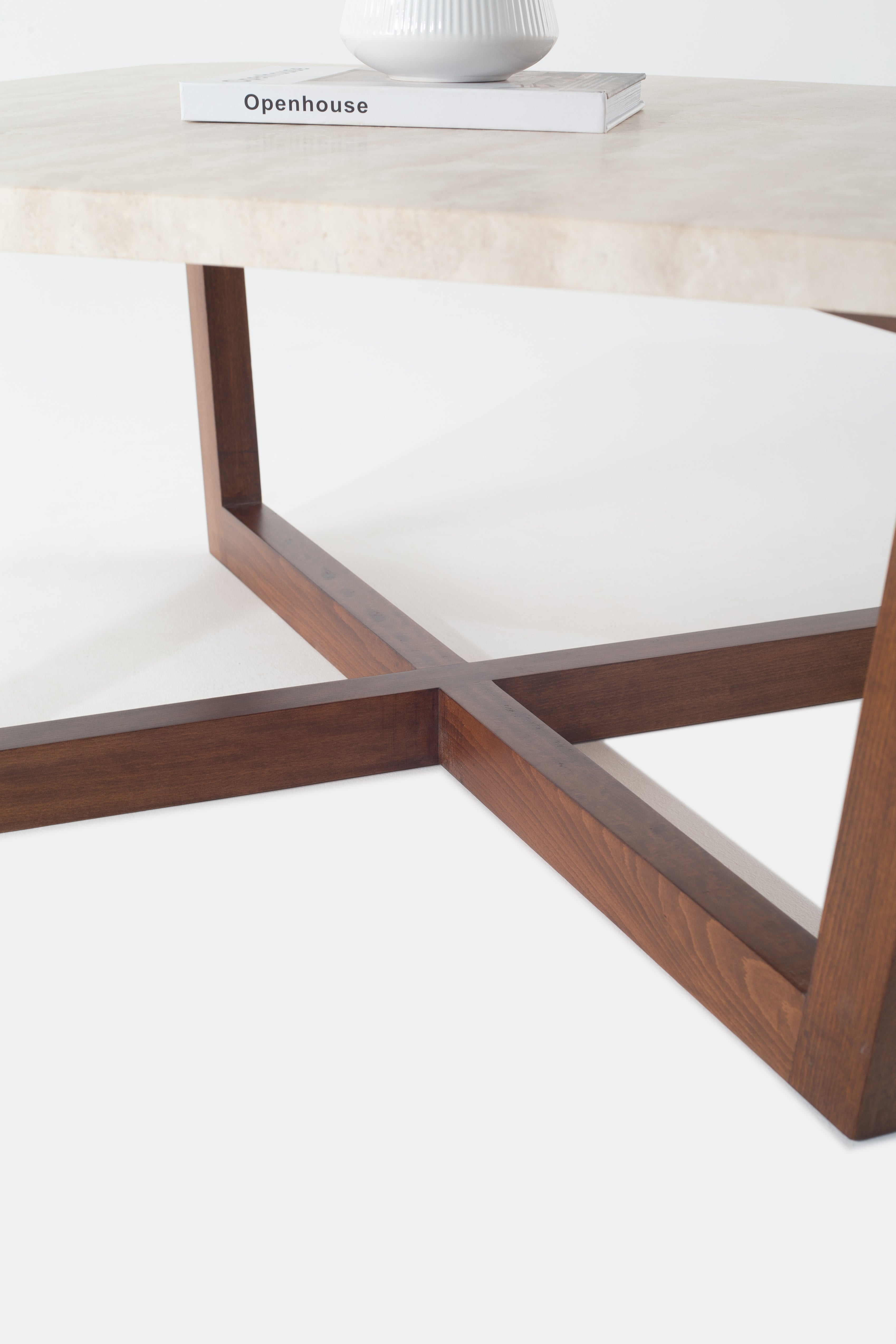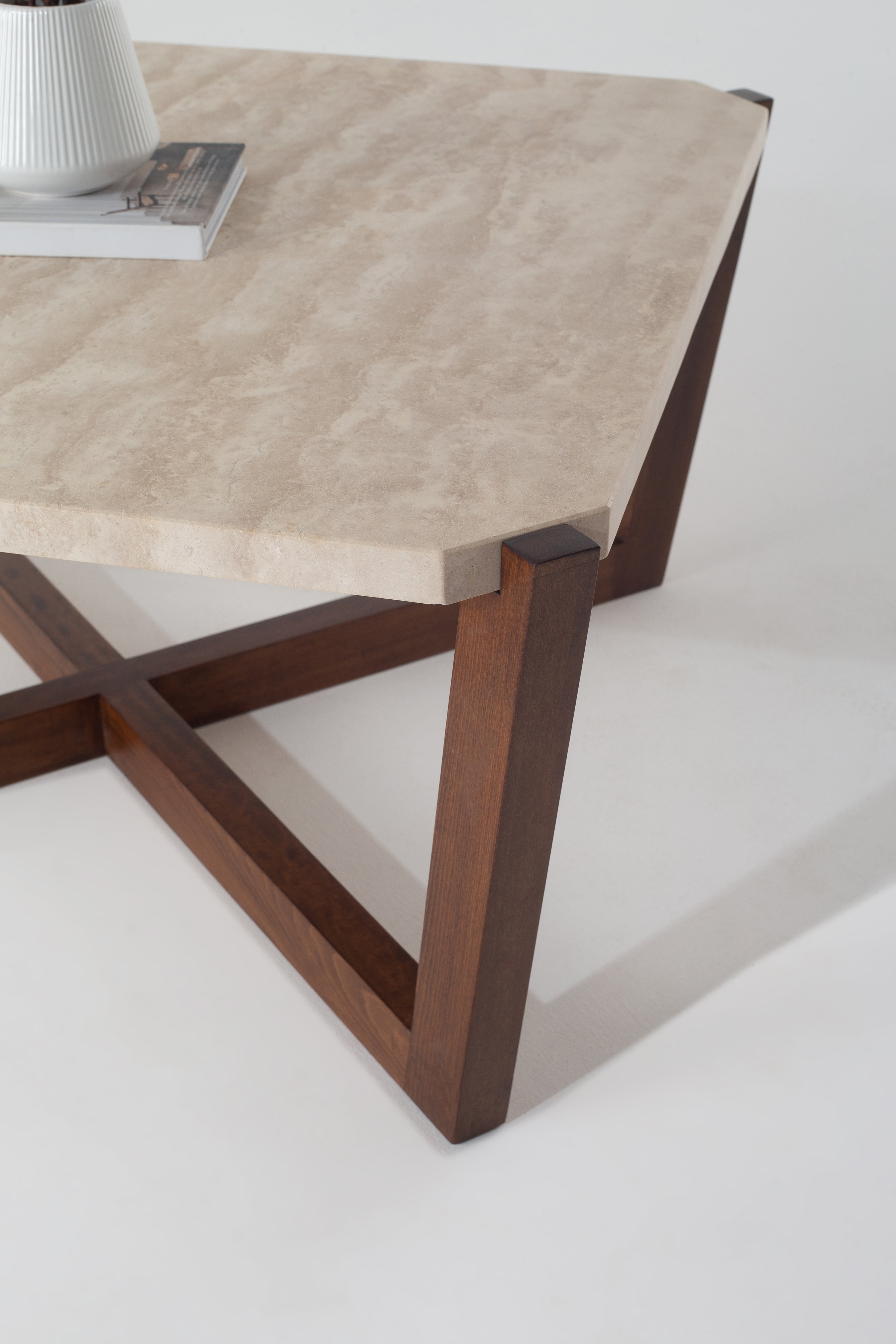 A bold fusion of natural elegance and architectural design, this travertine coffee table features a square stone top with soft beveled edges, highlighting its organic texture and warm neutral hues. The solid walnut-finished wooden base forms a geometric silhouette, adding depth while keeping the design open and airy. A perfect centerpiece for modern, rustic, or minimalist interiors, this luxury coffee table blends timeless materials with contemporary craftsmanship for a refined yet inviting look.