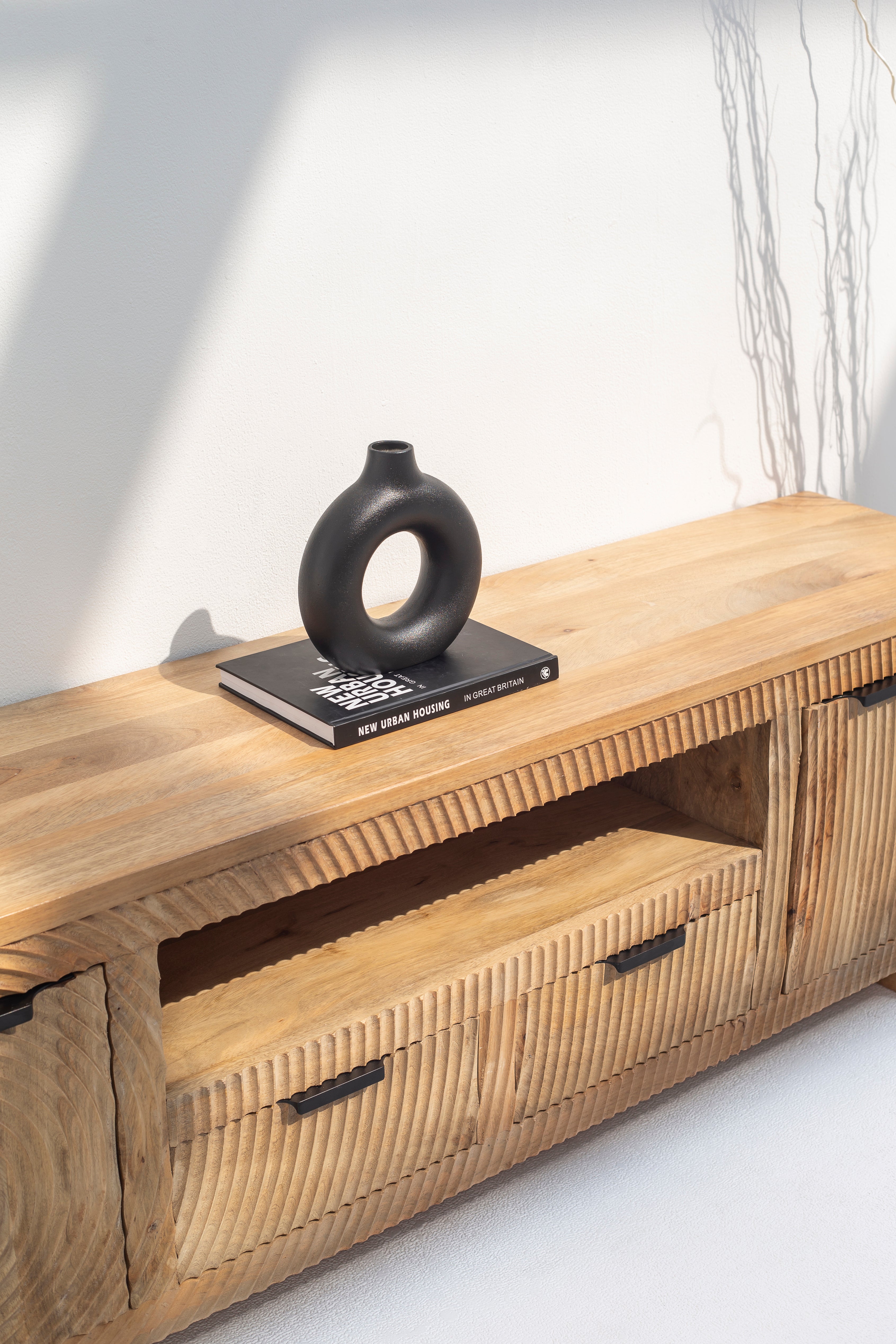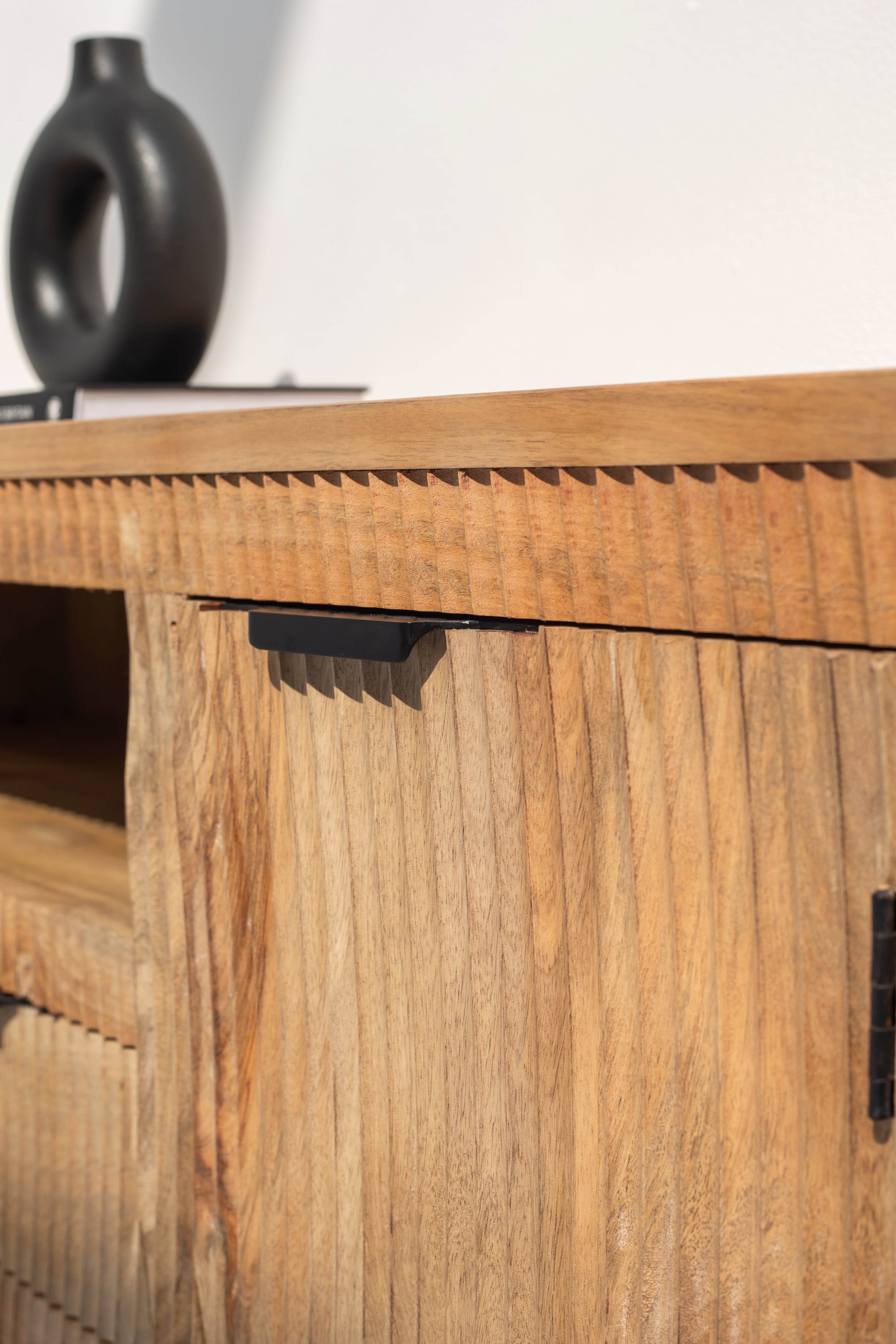 The Nicole Wooden TV Unit boasts a clean rectangular silhouette crafted from premium mango wood, exuding a natural grain texture with a warm honey-toned finish. Its minimalist design features intricately grooved panels and contrasting black hardware, adding a subtle industrial touch. This tv unit provides both style and functionality with spacious shelving and sleek drawers for storage. Perfect for contemporary or rustic interiors, this piece complements various décor styles, offering a blend of modern aesthetics and timeless craftsmanship.
