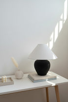 Brighten your home with the understated elegance of the Noemi Black Table Lamp. This contemporary lamp features a sleek, matte black ceramic base with a smooth texture and a tapered, round shape, beautifully contrasted by a classic white or off-white fabric conical lampshade. The soft, diffused light it emits creates a warm and inviting ambiance. Imagine yourself settling down with a book or creating a cozy atmosphere, as this versatile accent lamp provides both functional illumination and stylish decor. Perfect for your bedside table, living room side table, or office desk, this modern black lamp adds a touch of minimalist sophistication and ambient lighting to any interior, enhancing your personal space.