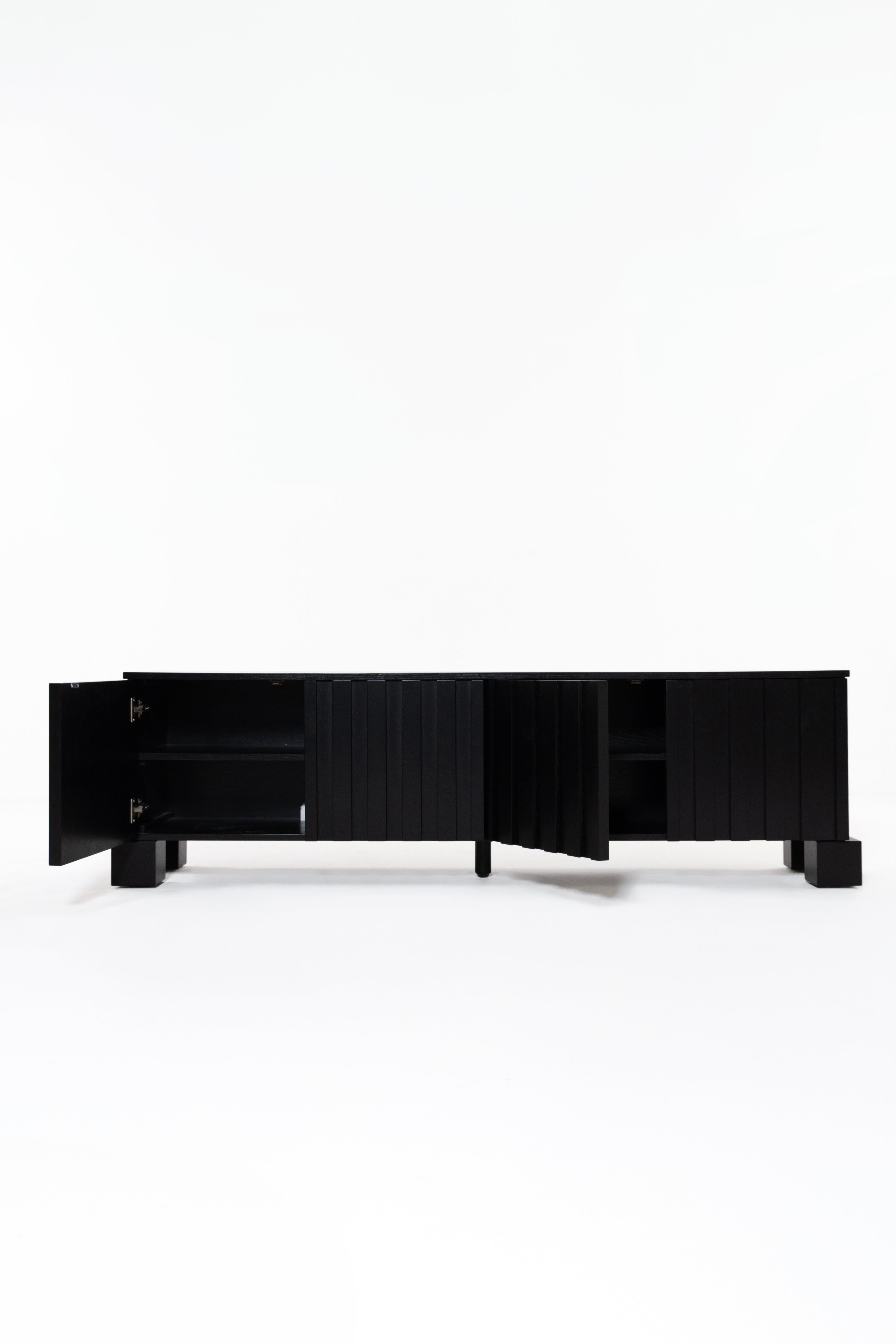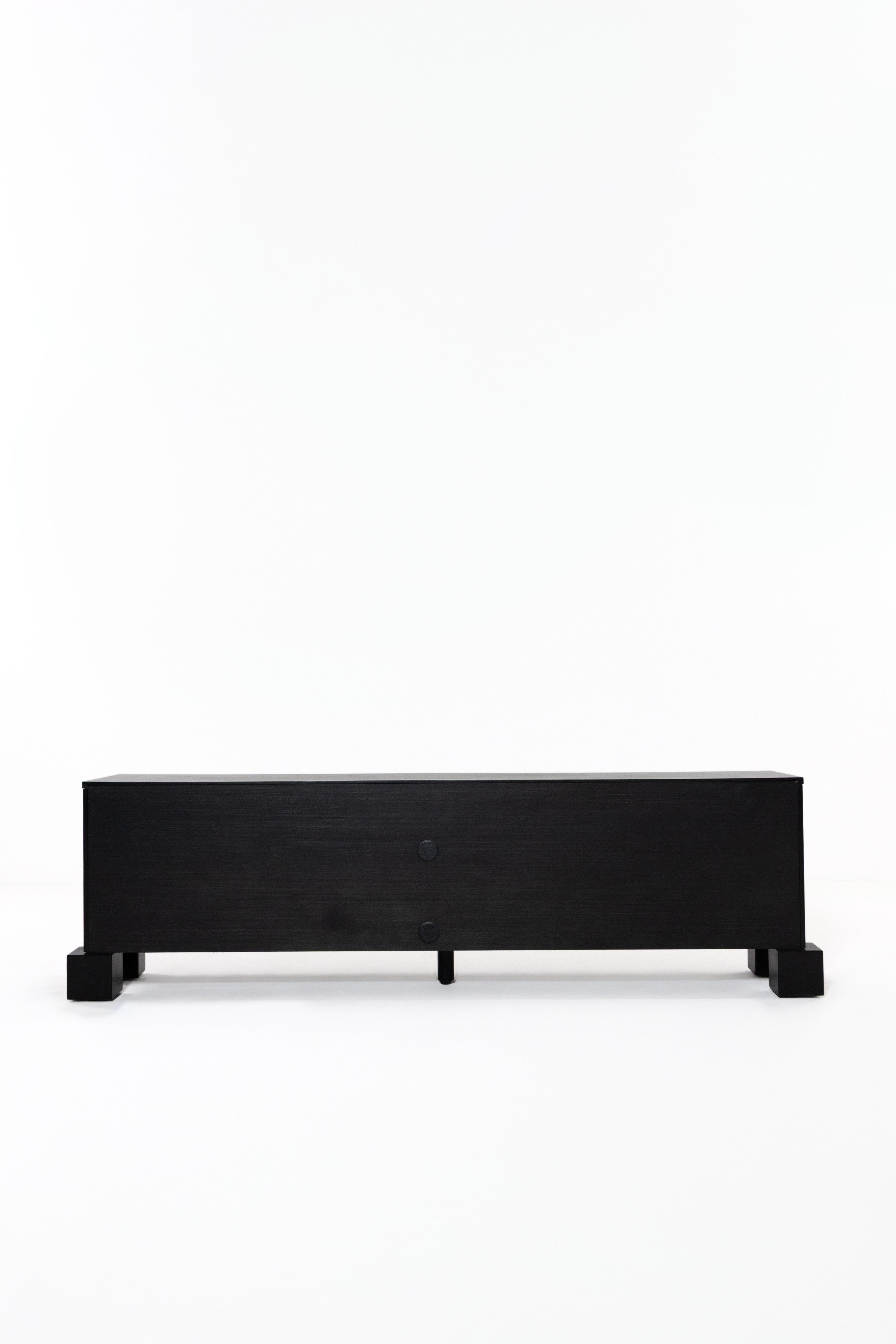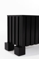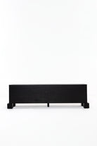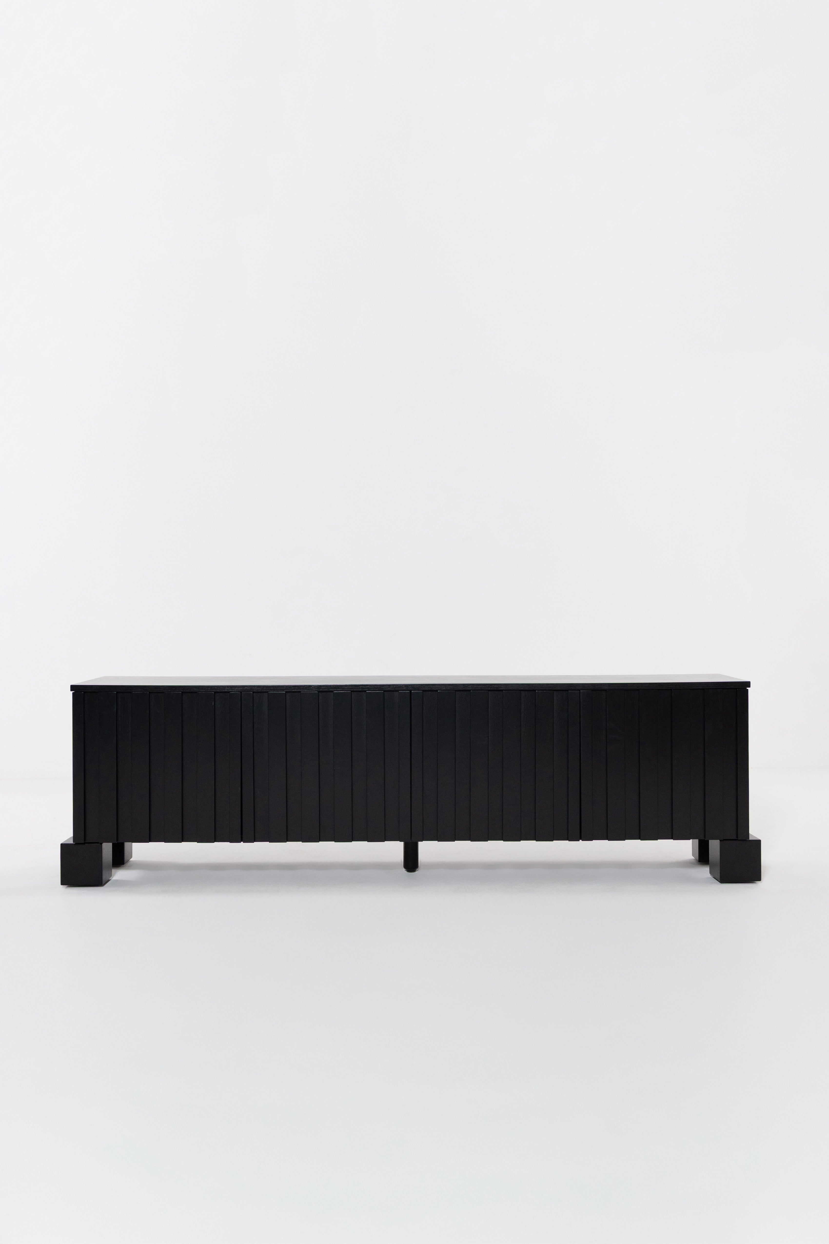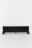 Transform your living space with the bold sophistication of this black wooden TV unit, crafted from premium oakwood. The sleek slatted design adds refined texture, while the deep black finish accentuates the natural wood grain for a dramatic, elegant look. Behind its soft-close doors lies generous hidden storage, keeping your media essentials organized and out of sight. Resting on sturdy block legs, it seamlessly combines modern functionality with timeless design, making it a striking centerpiece for contemporary, minimalist, or mid-century interiors.