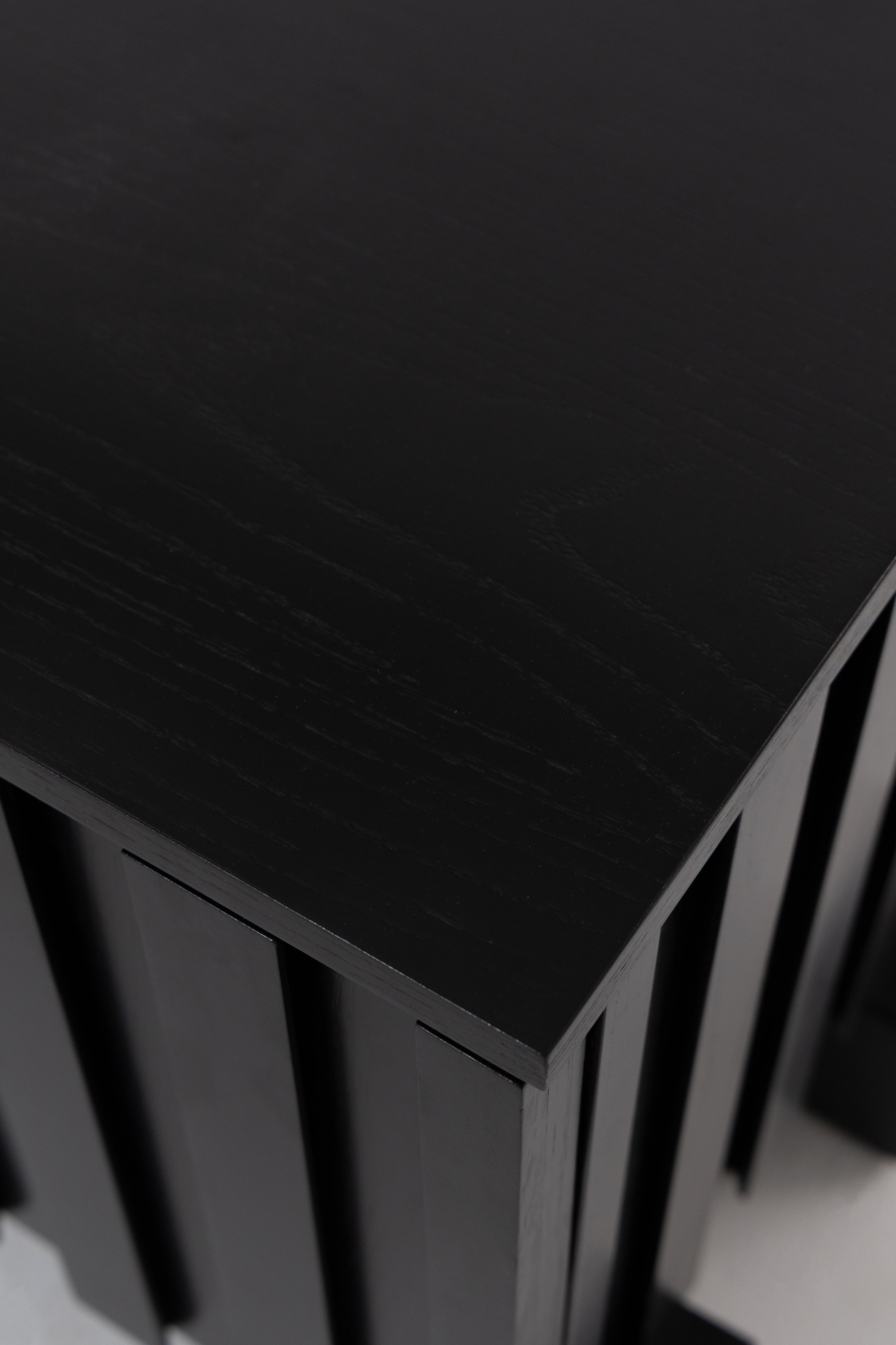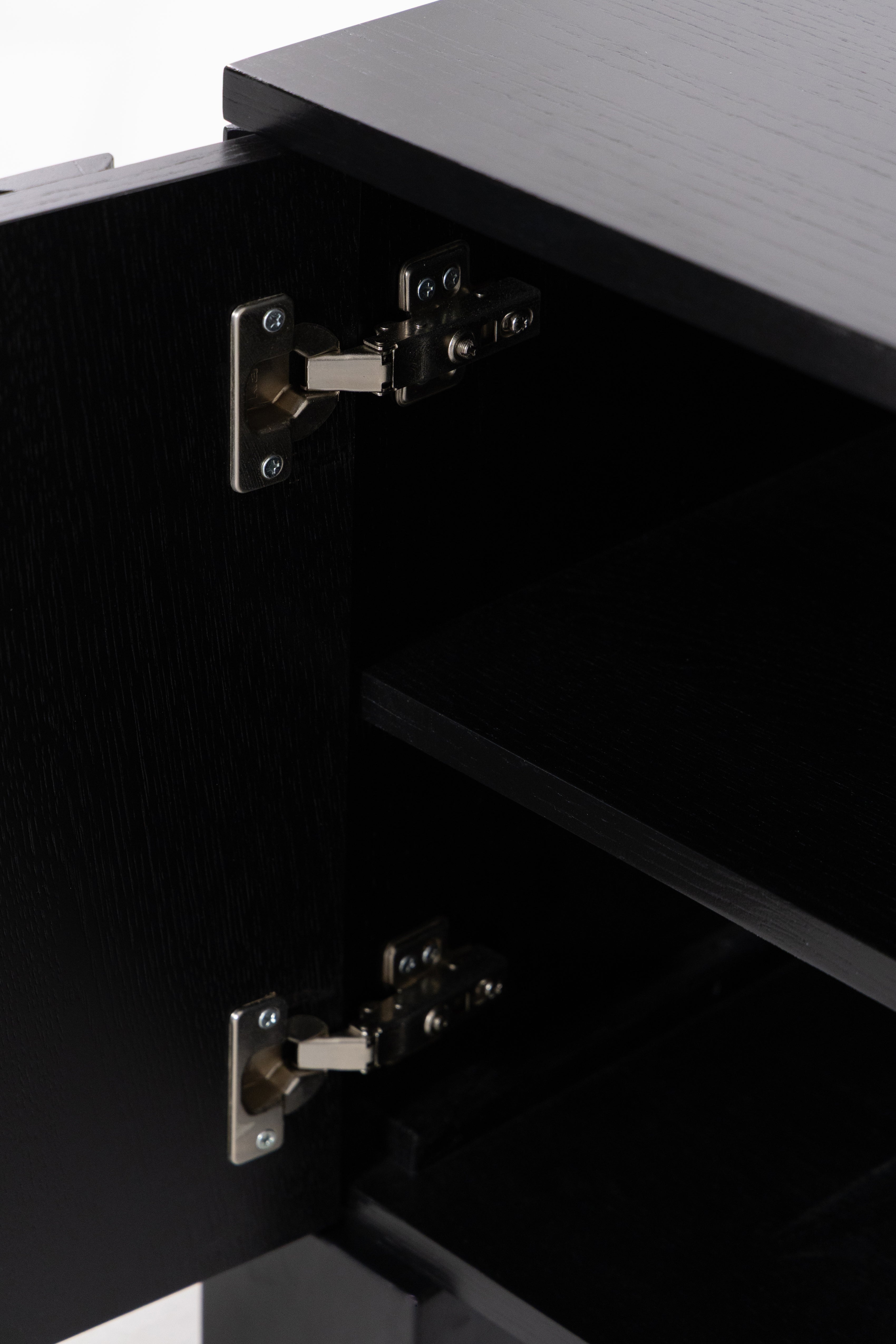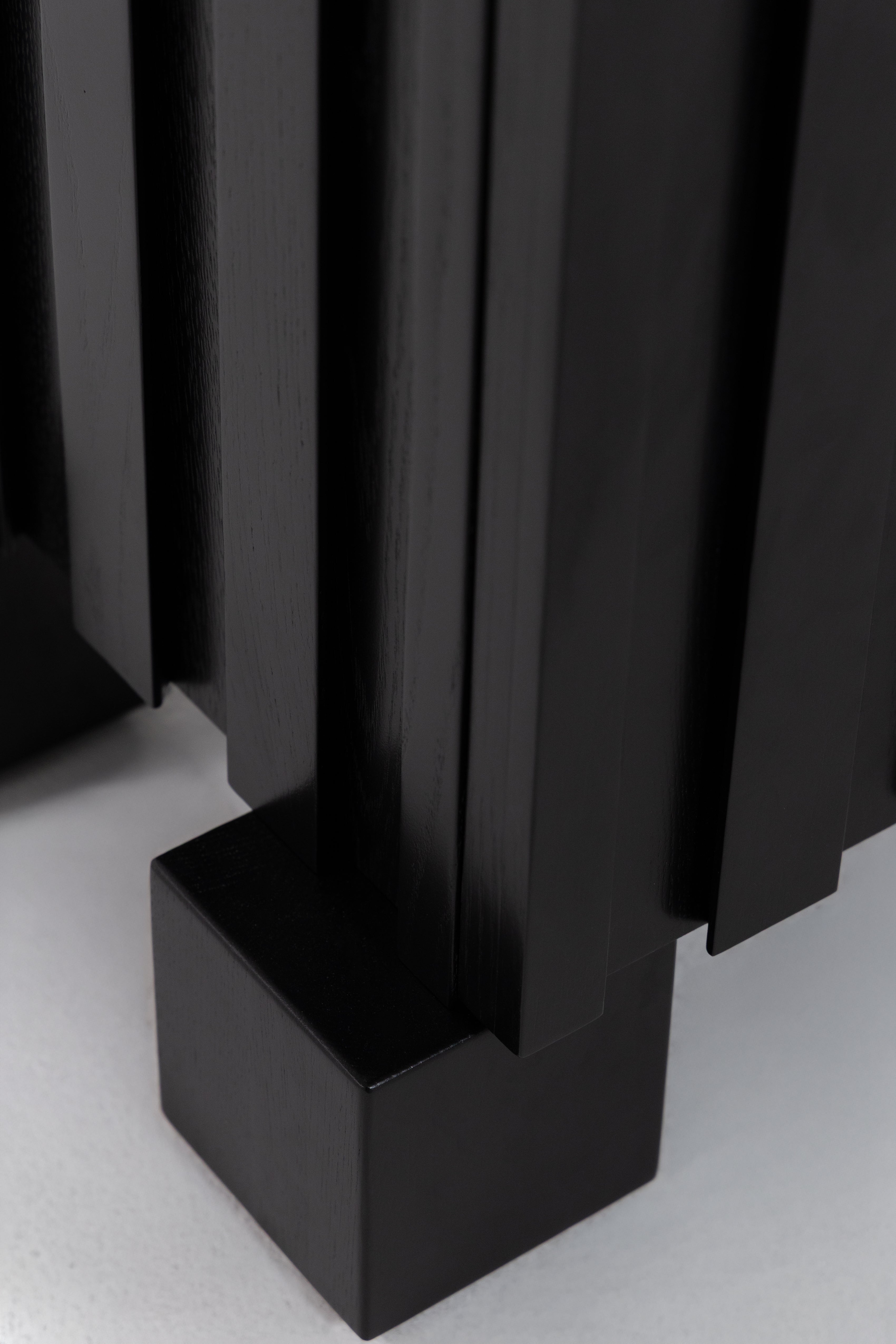 Transform your living space with the bold sophistication of this black wooden TV unit, crafted from premium oakwood. The sleek slatted design adds refined texture, while the deep black finish accentuates the natural wood grain for a dramatic, elegant look. Behind its soft-close doors lies generous hidden storage, keeping your media essentials organized and out of sight. Resting on sturdy block legs, it seamlessly combines modern functionality with timeless design, making it a striking centerpiece for contemporary, minimalist, or mid-century interiors.