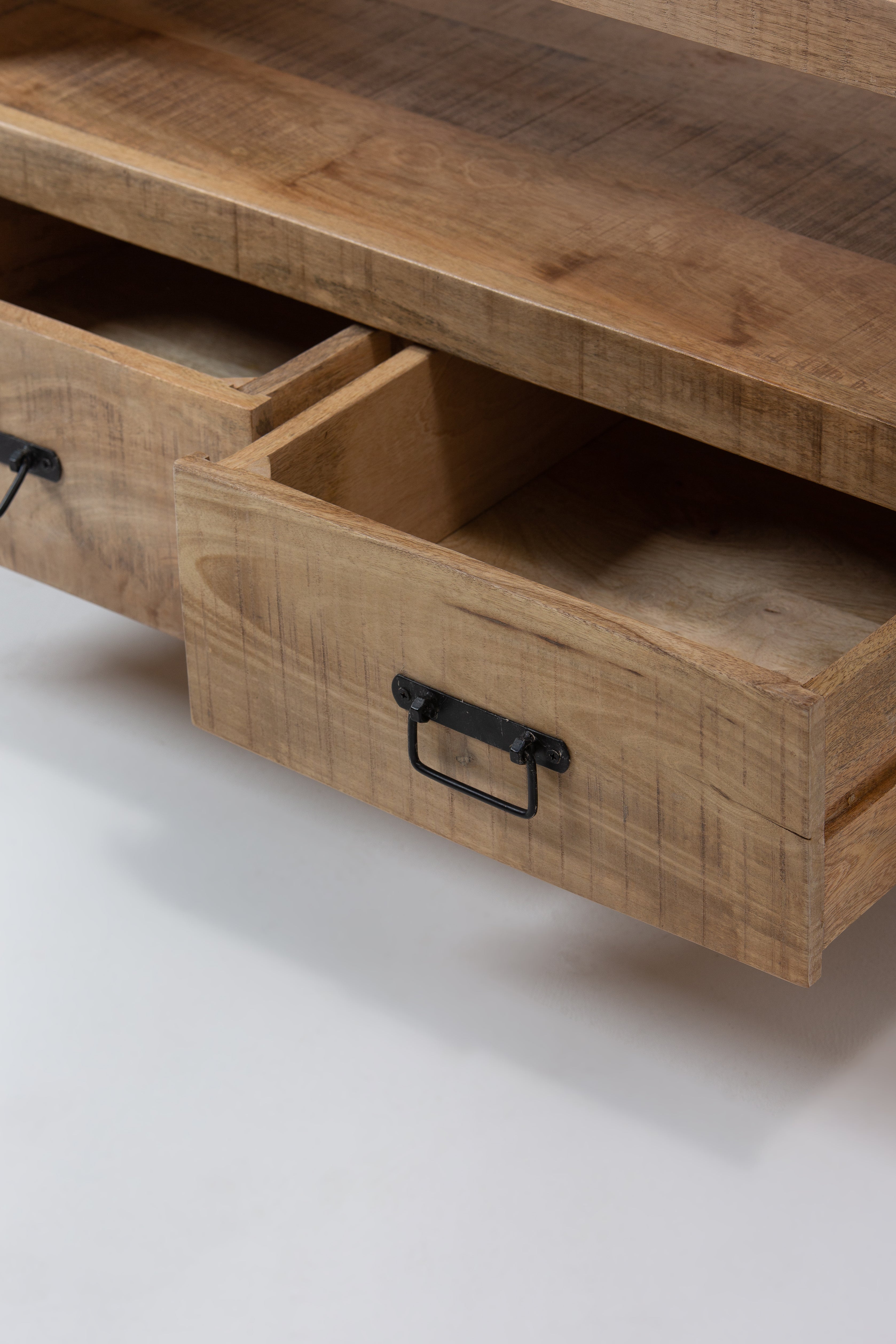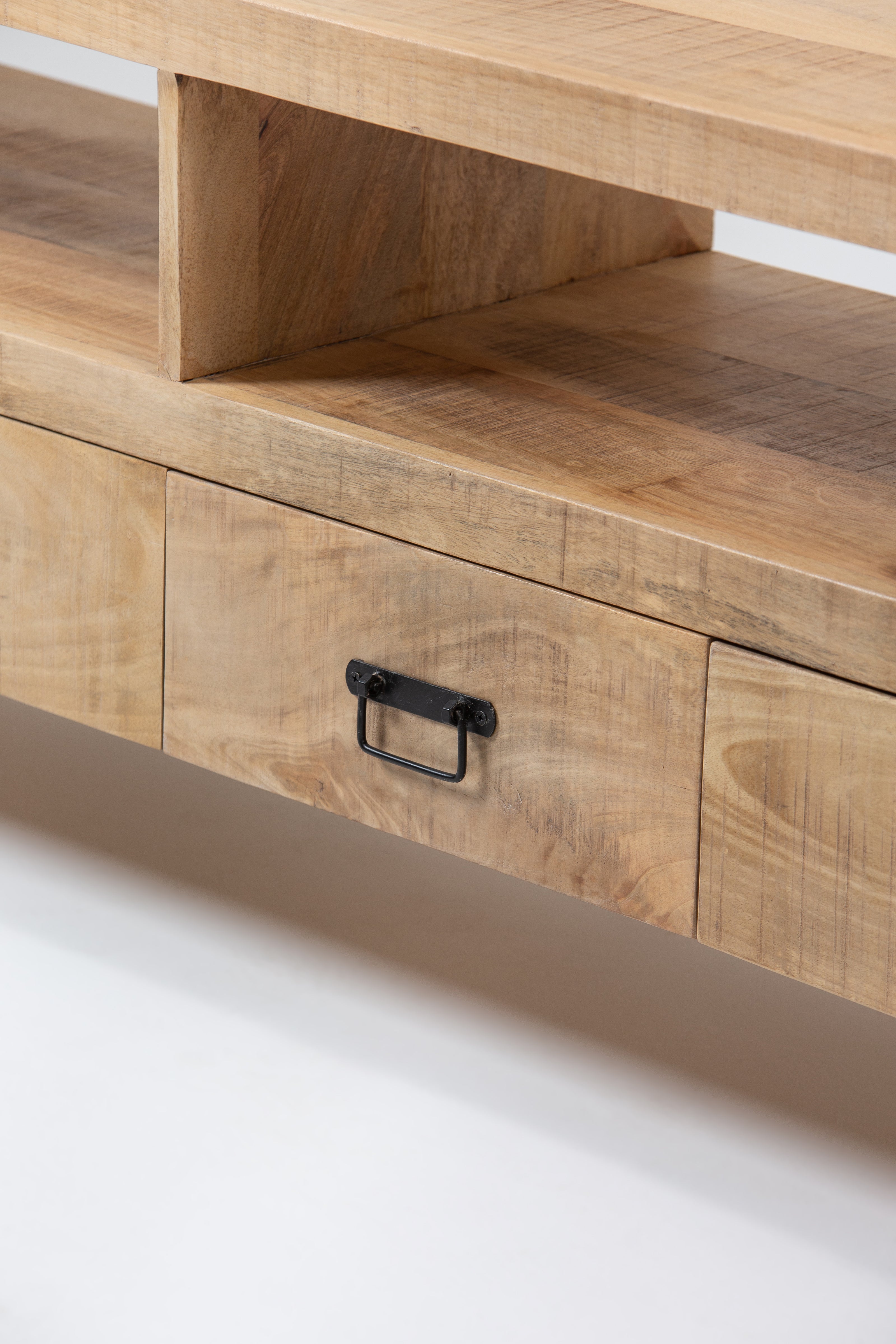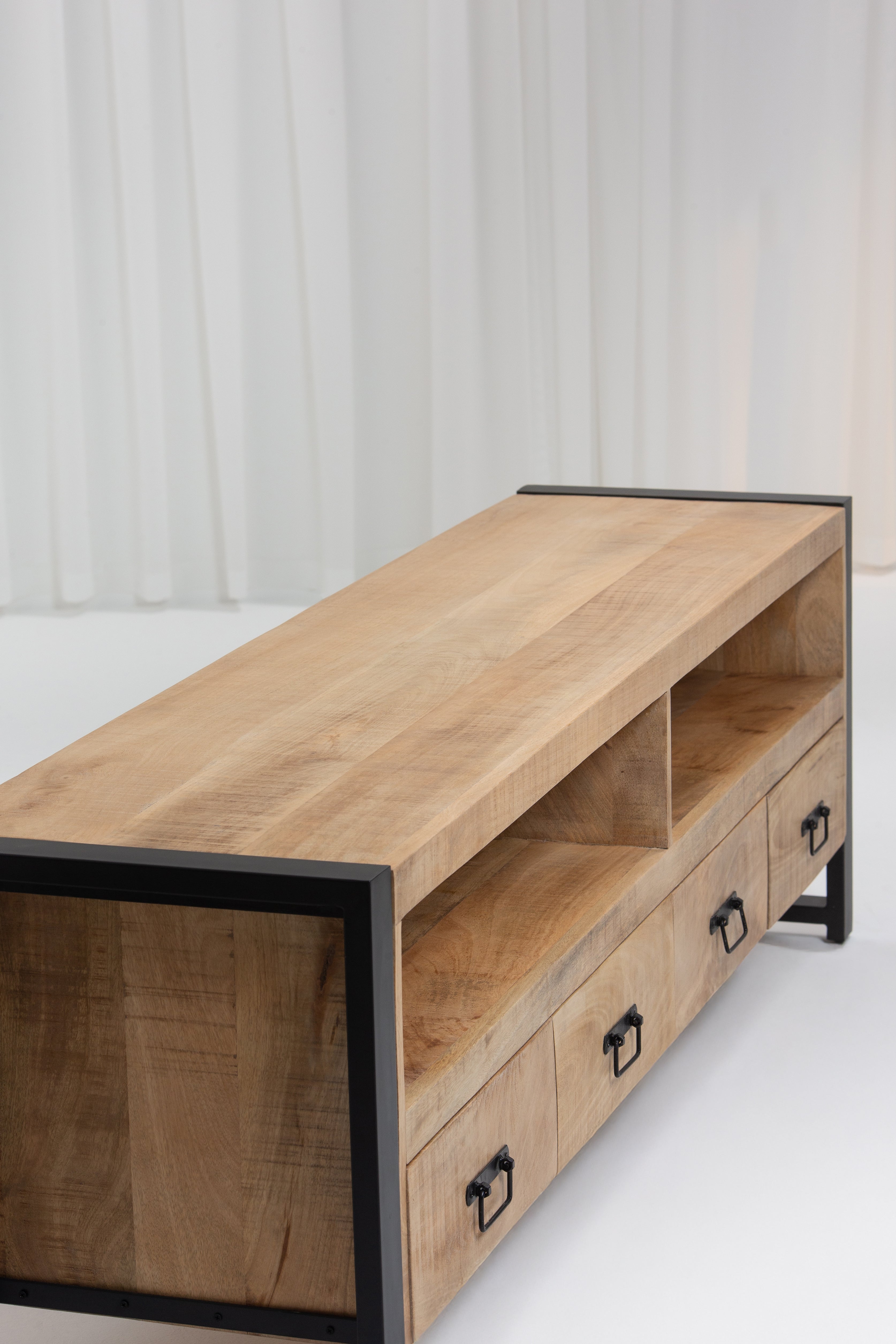 Crafted with industrial flair, the Octavia TV Unit boasts a natural wood finish complemented by robust black metal framing. Its open shelves and spacious drawers provide ample storage for electronics and decor, blending functionality with a rustic aesthetic. Perfect for contemporary or industrial interiors.