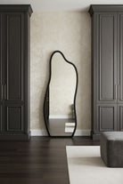 This mirror showcases an irregular freeform outline edged with a slim black PVC frame that sharpens its organic curves. The tall reflective surface expands light and space, while the freestanding easel stand provides versatility for placement in bedrooms, dressing areas, or entryways. Its dark-toned edging introduces contrast and definition, turning a functional accessory into a bold accent for modern and contemporary interiors.