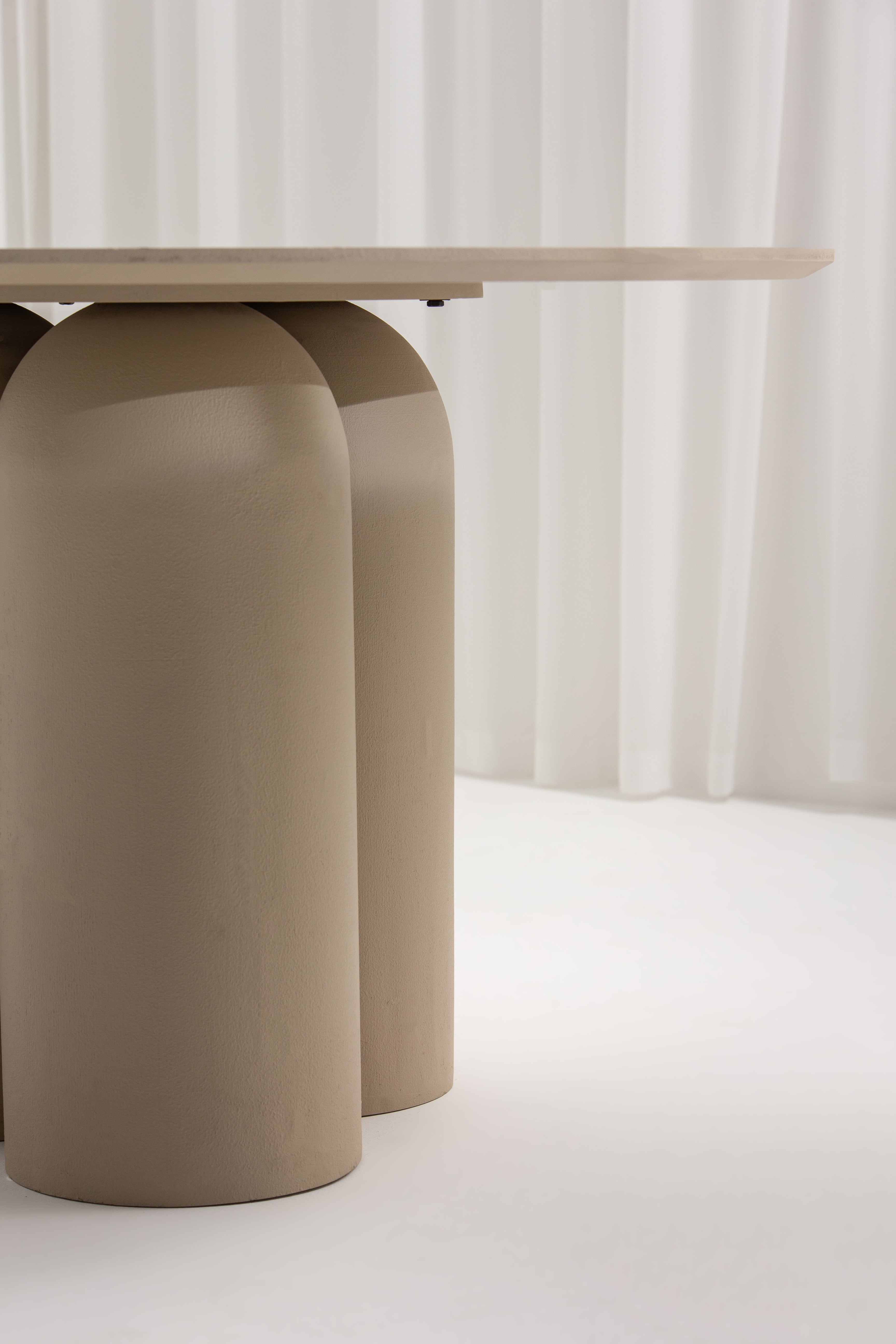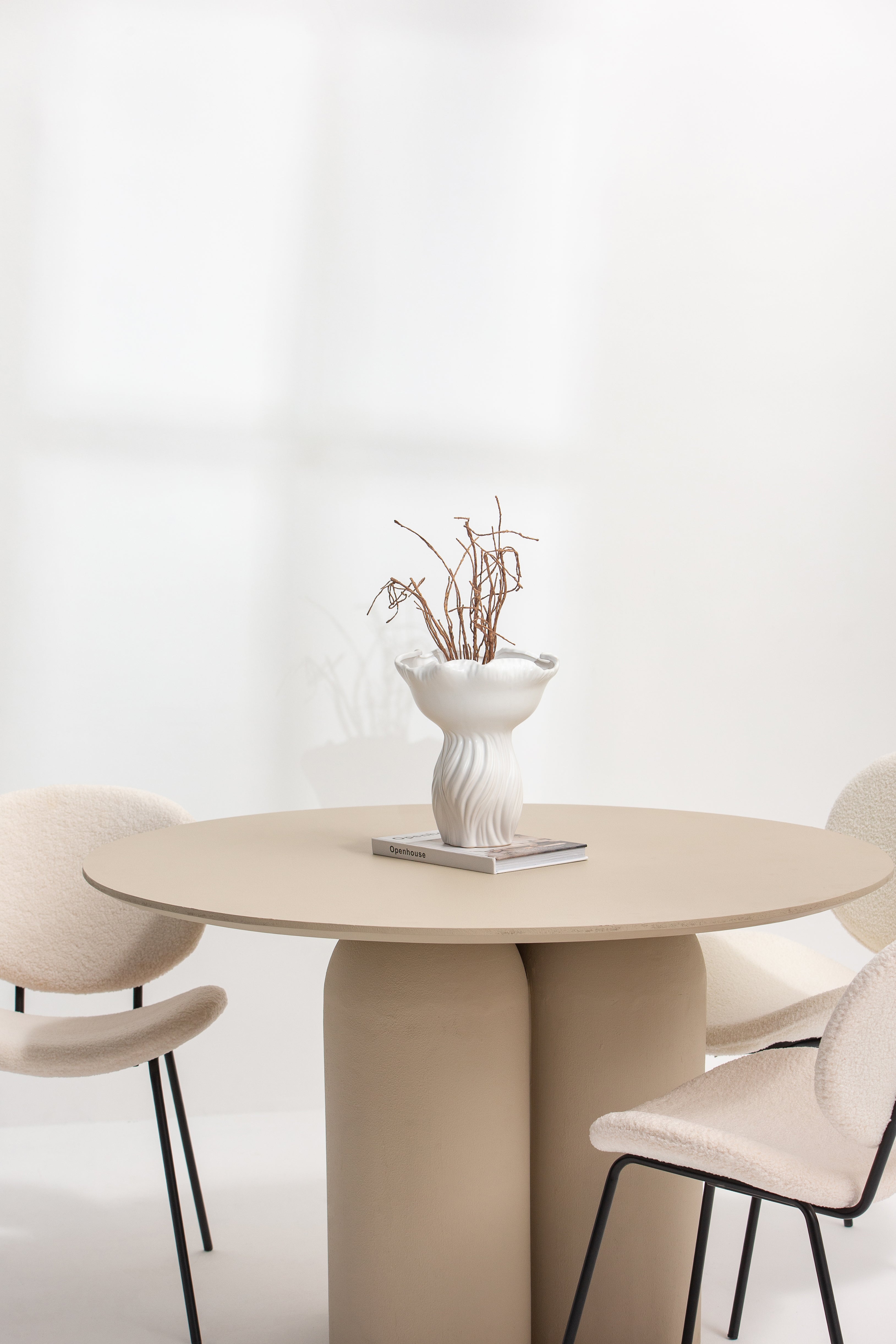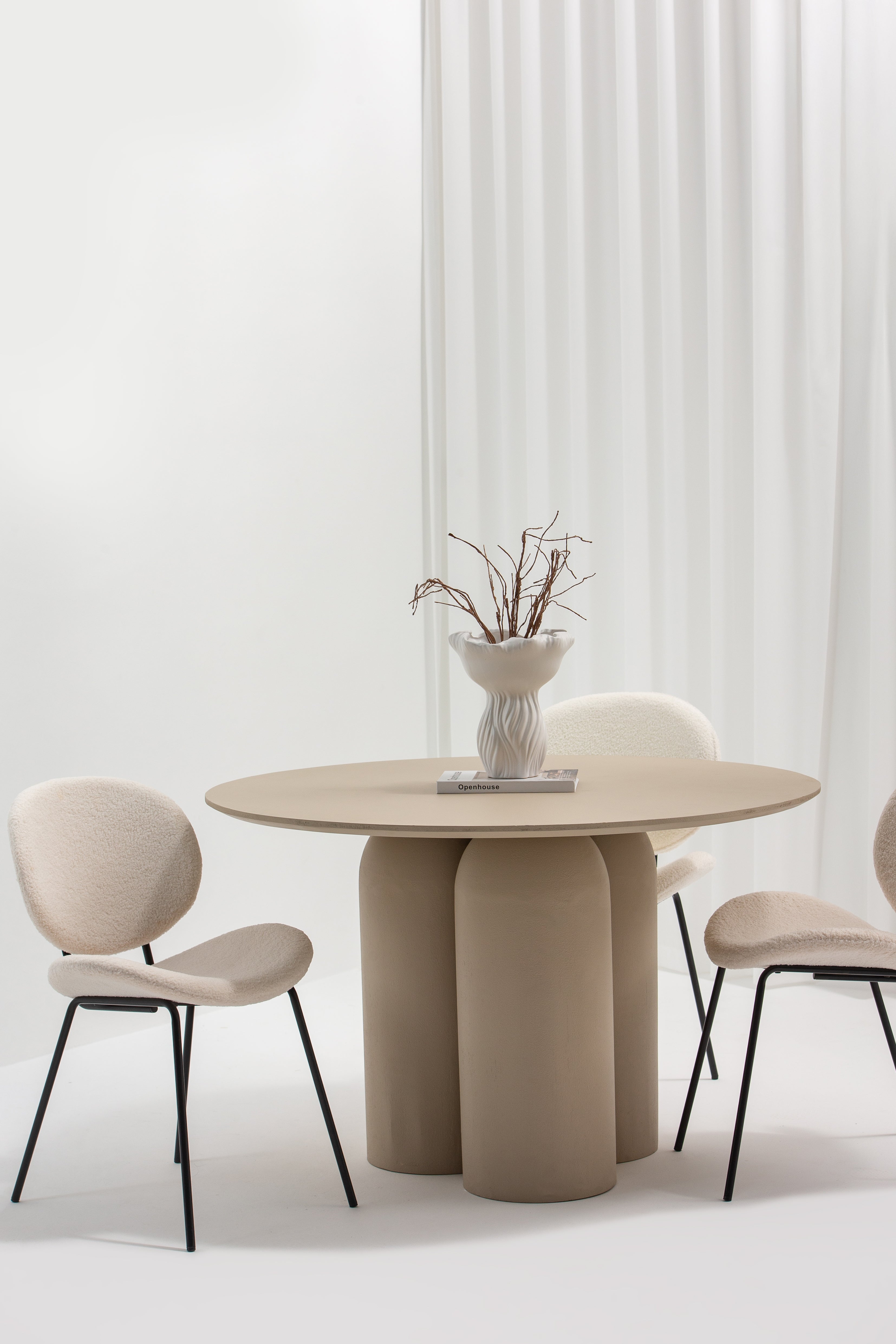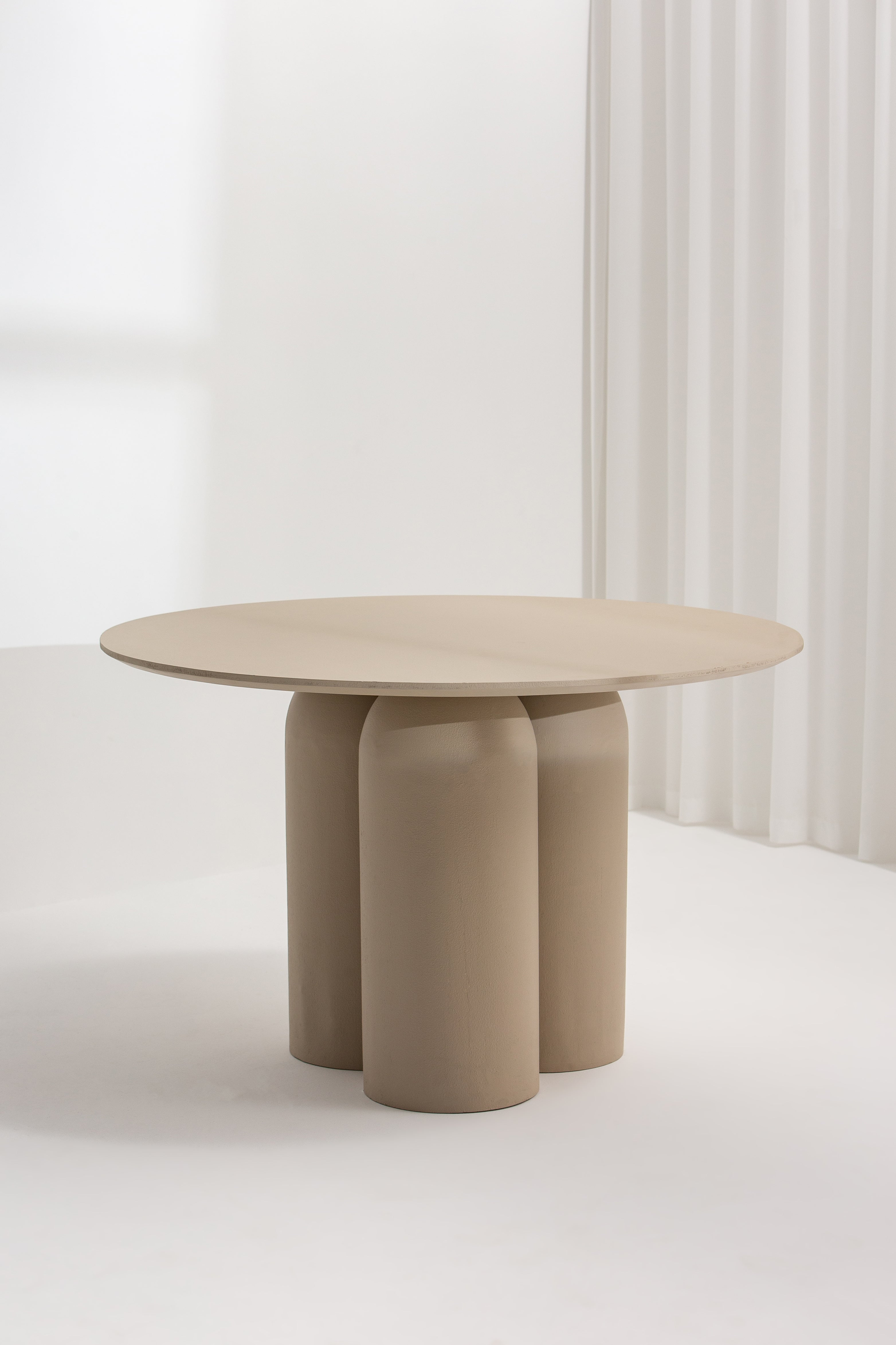 Crafted with modern elegance, this wooden dining table features a soft beige finish and a rounded top supported by a unique trio of curved cylindrical legs. Its minimalist design and neutral tone make it an ideal centerpiece for contemporary dining spaces, effortlessly complementing various decor styles. Perfect for intimate gatherings or stylish dining setups, this table adds a touch of sophistication and warmth to any room.