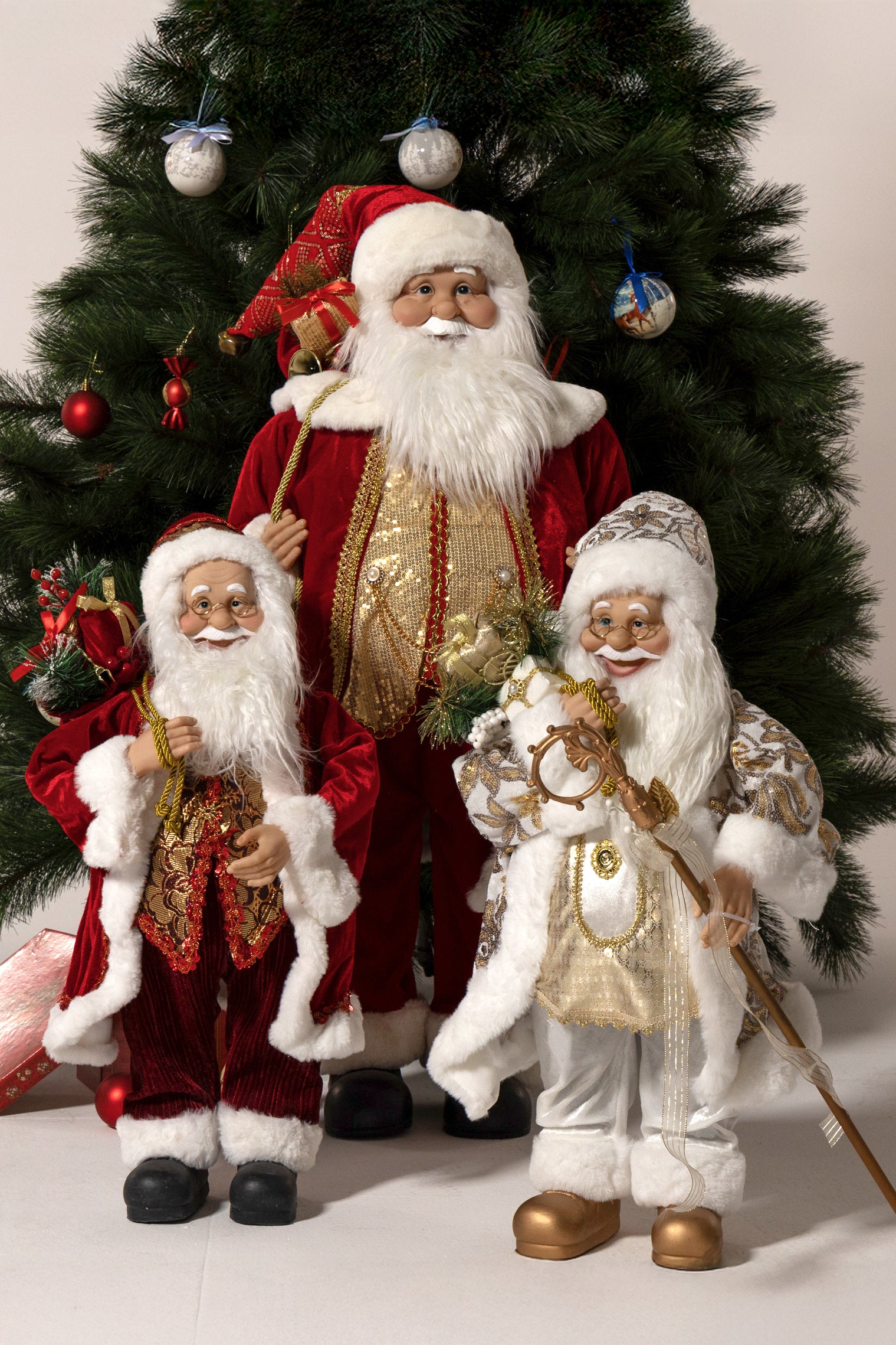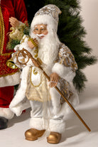 A festive Santa figure in white and gold attire, detailed with faux-fur trims, a golden staff and a ribboned gift sack filled with pine accents. His embroidered coat glimmers softly under light, bringing refined brightness to holiday interiors. Set him on mantels, consoles or beside the tree for a radiant touch that complements metallic ornaments and candles. The sturdy boots keep him steady while the textured fabrics and gentle smile evoke warmth through every festive gathering.