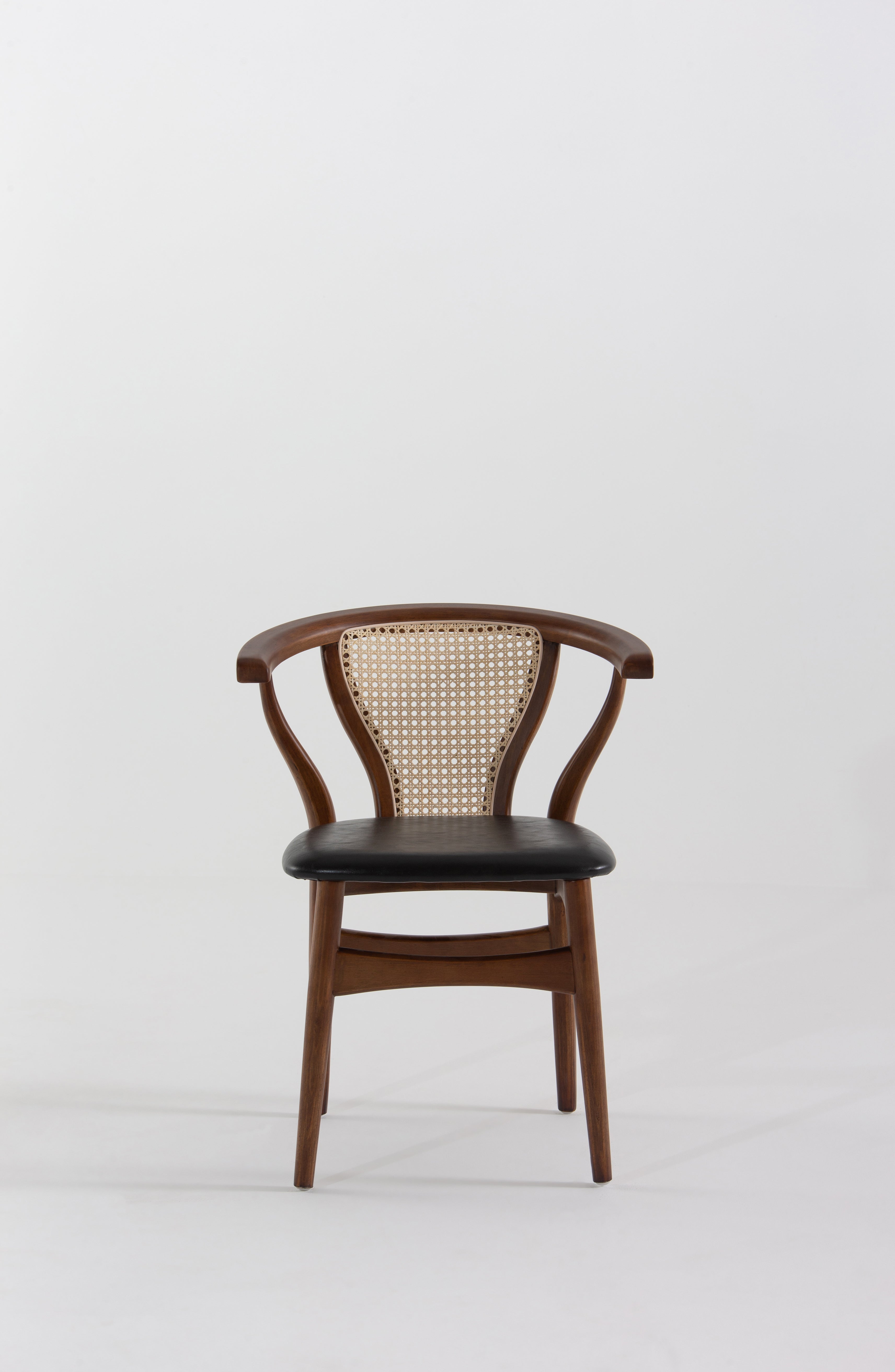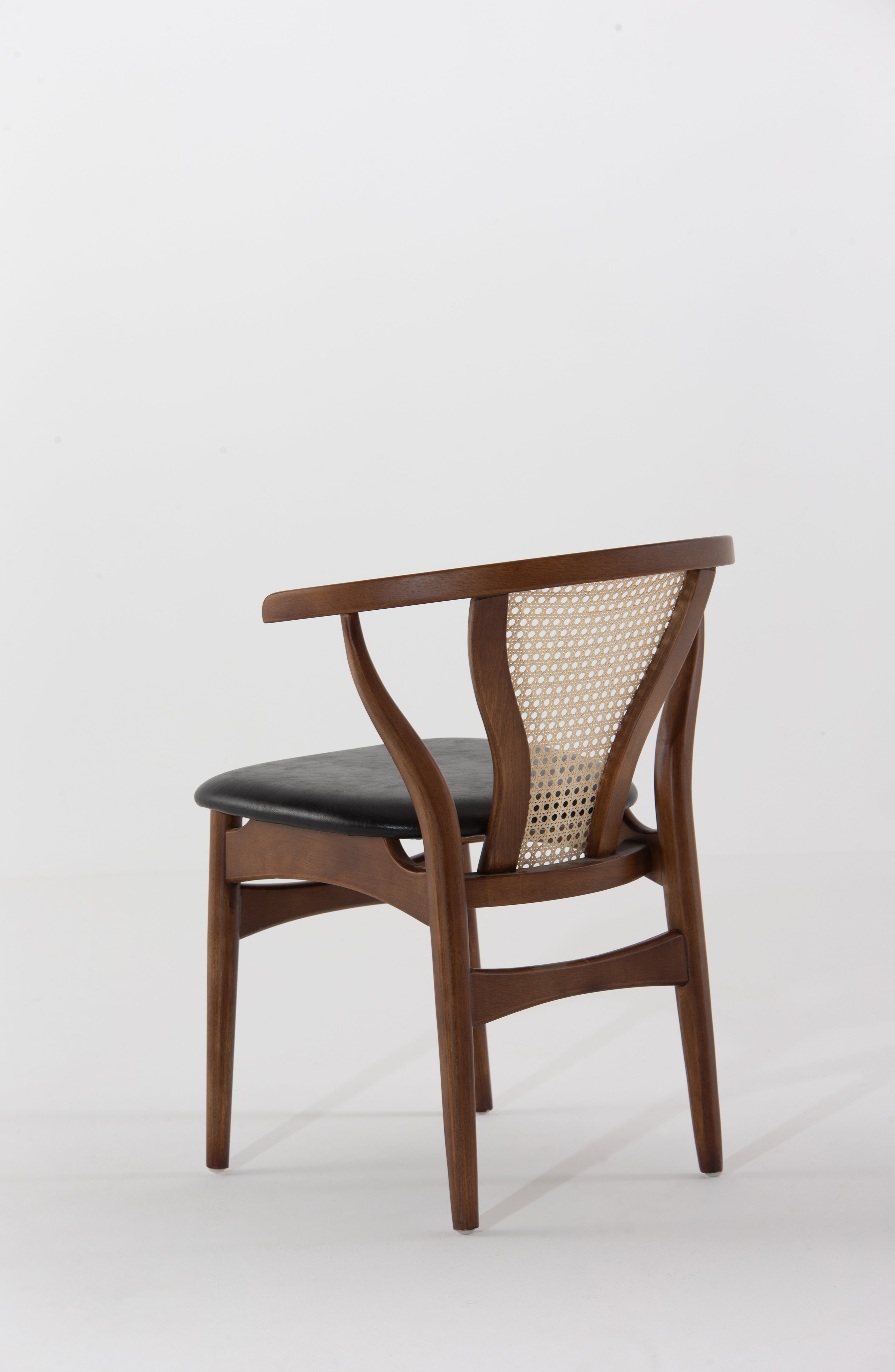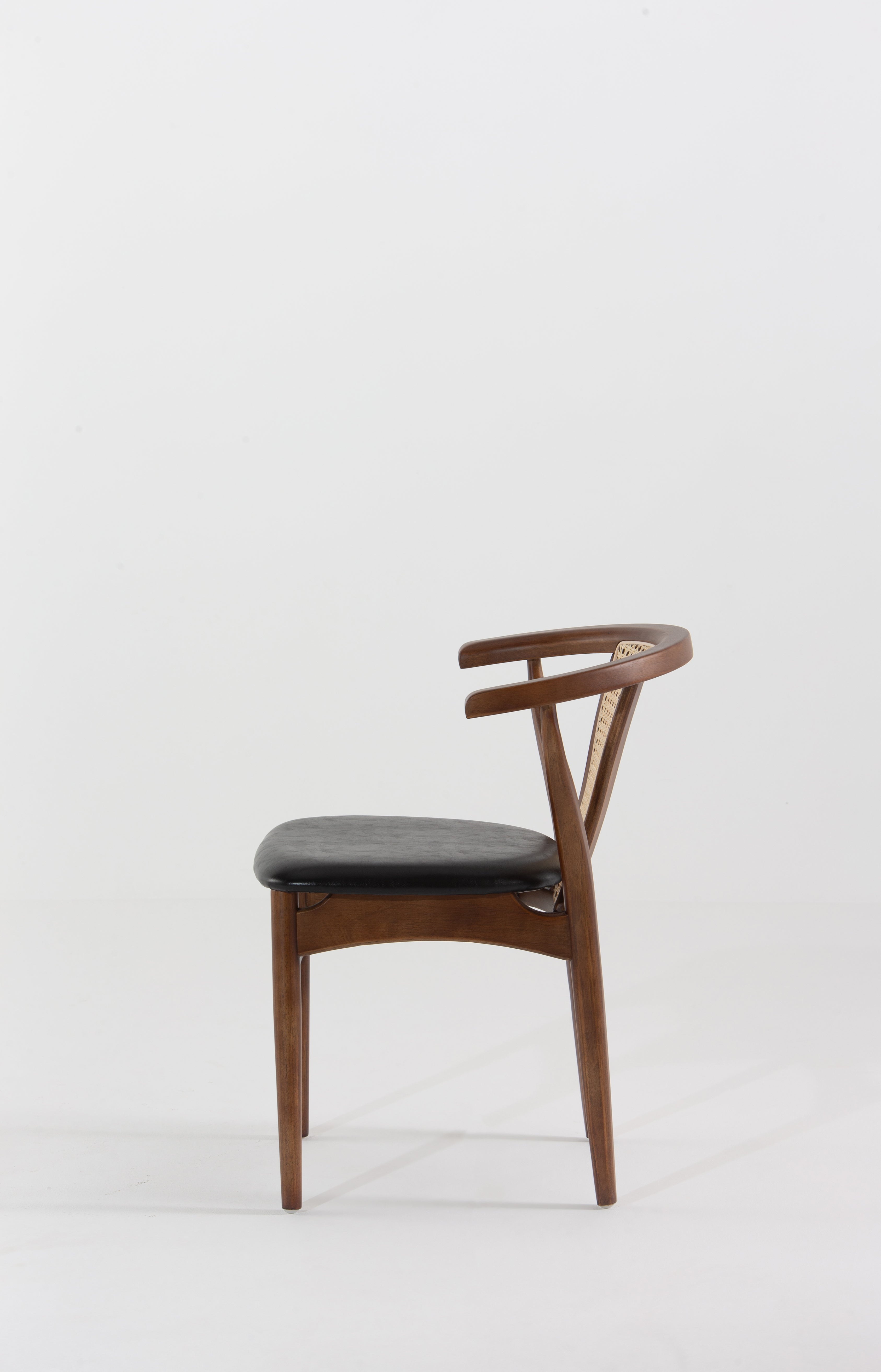 A perfect balance of warmth and texture, this wooden dining chair brings elegance to your space. The curved frame in a rich walnut tone enhances its sculptural appeal, while the woven rattan cane backrest adds a touch of organic charm. The black cushioned seat ensures comfort, making it ideal for modern dining areas, cafes, or statement seating.