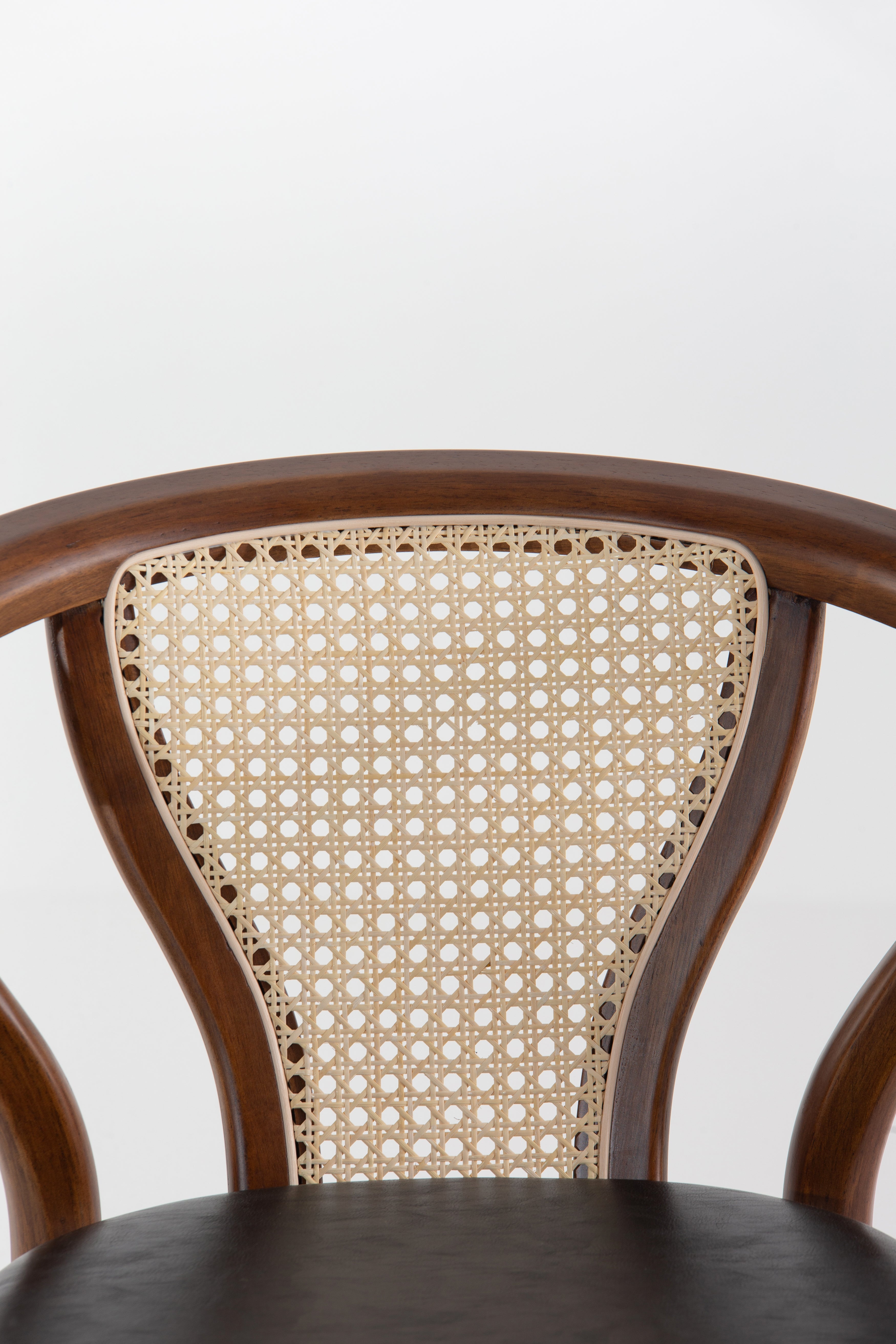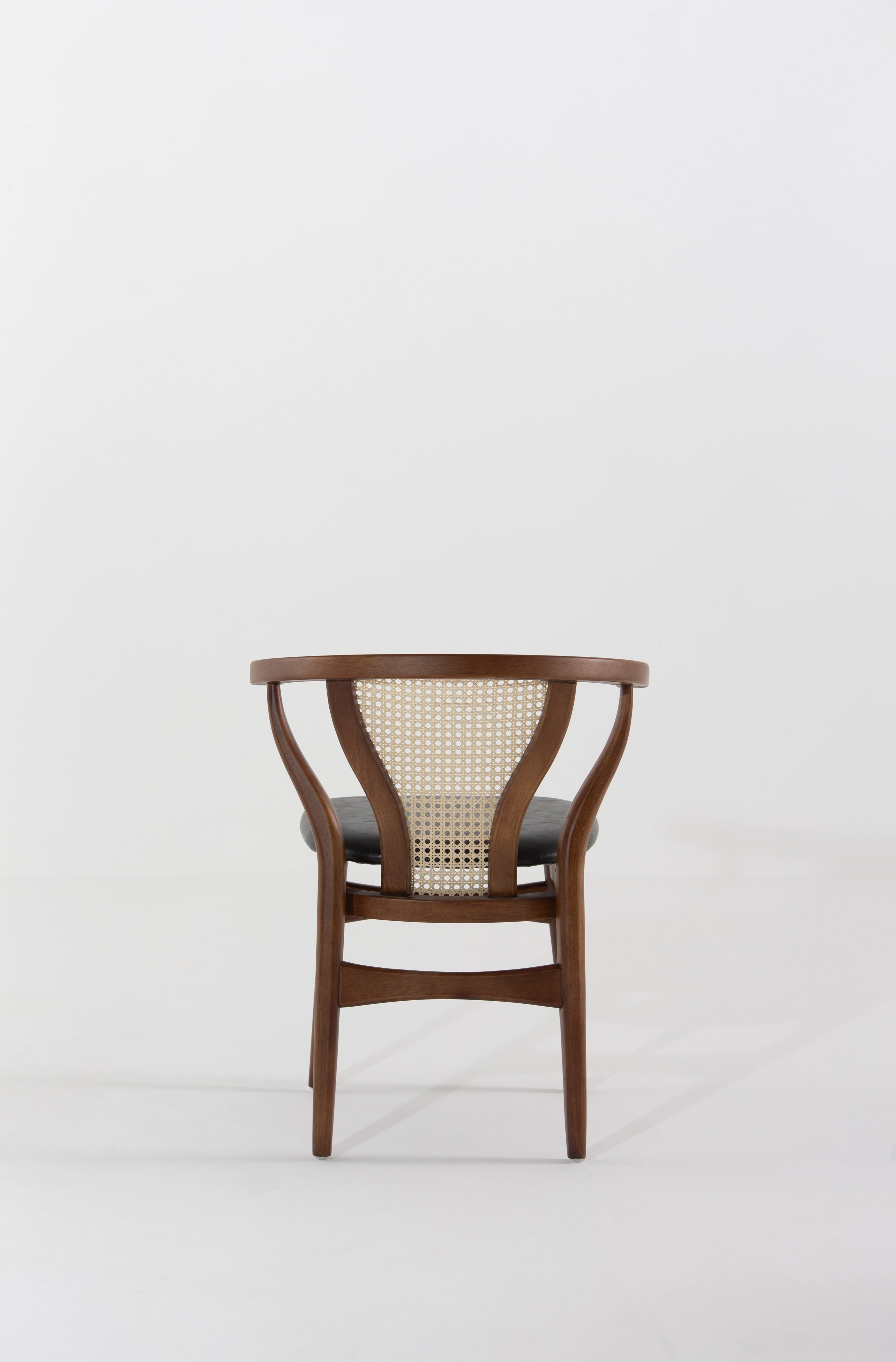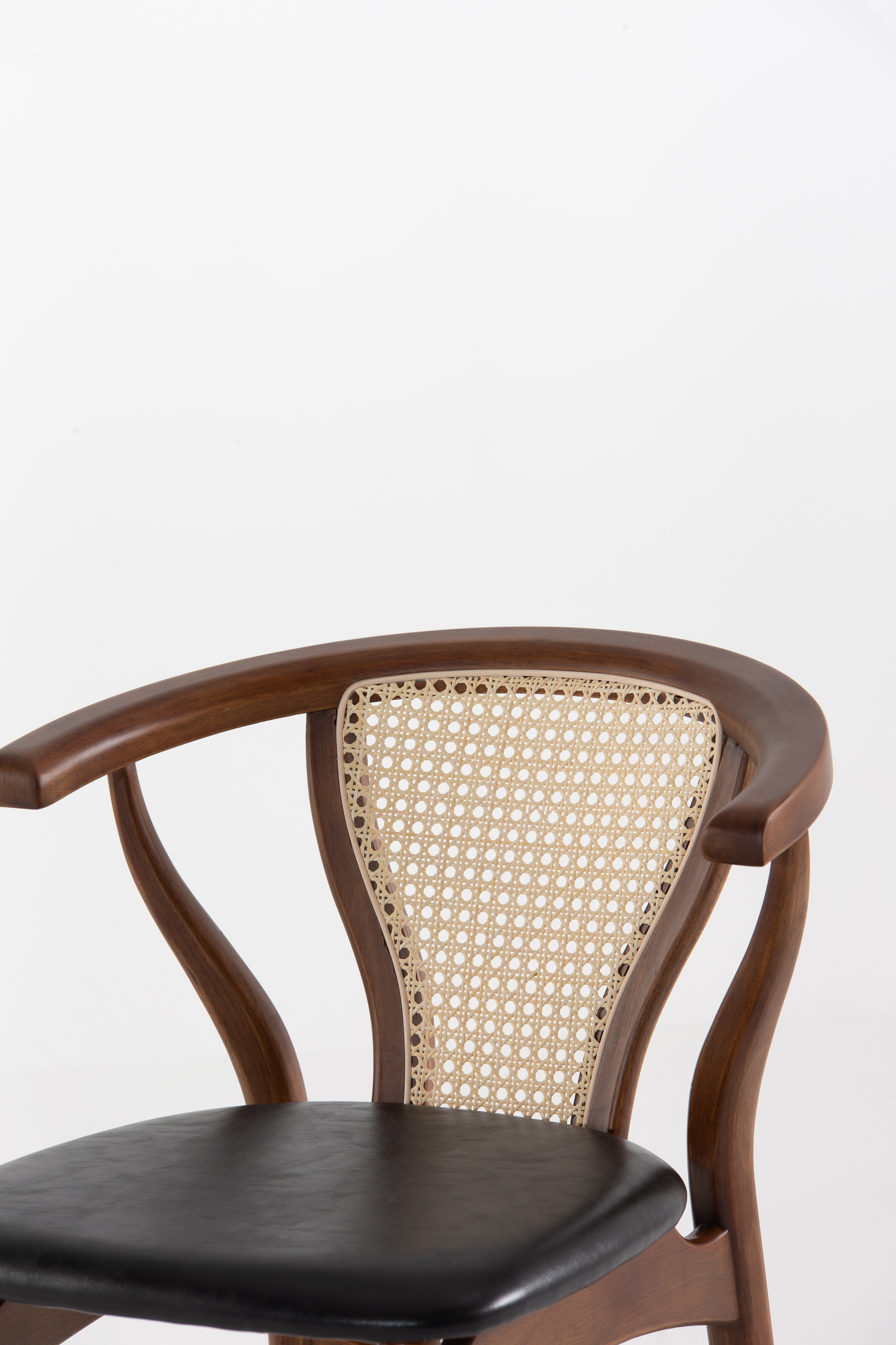 A perfect balance of warmth and texture, this wooden dining chair brings elegance to your space. The curved frame in a rich walnut tone enhances its sculptural appeal, while the woven rattan cane backrest adds a touch of organic charm. The black cushioned seat ensures comfort, making it ideal for modern dining areas, cafes, or statement seating.
