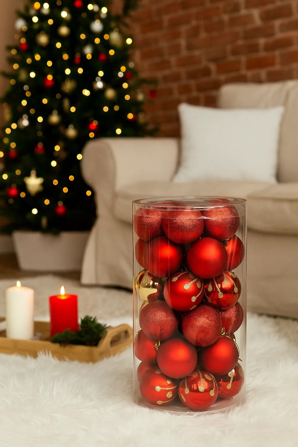 Refresh your tree with a coordinated set of 30 red ornaments in three finishes: matte, satin and glitter. Each 7cm bauble has a gold cap and hanging tie; several feature raised gold teardrop detailing that catches the lights. The saturated tone works with greenery, ribbon and candlelight, adding depth across branches. Style them on trees, wreaths and garlands, or cluster a few in bowls for the table. Shatterproof construction keeps decorating easy year after year with thirty pieces for full coverage.