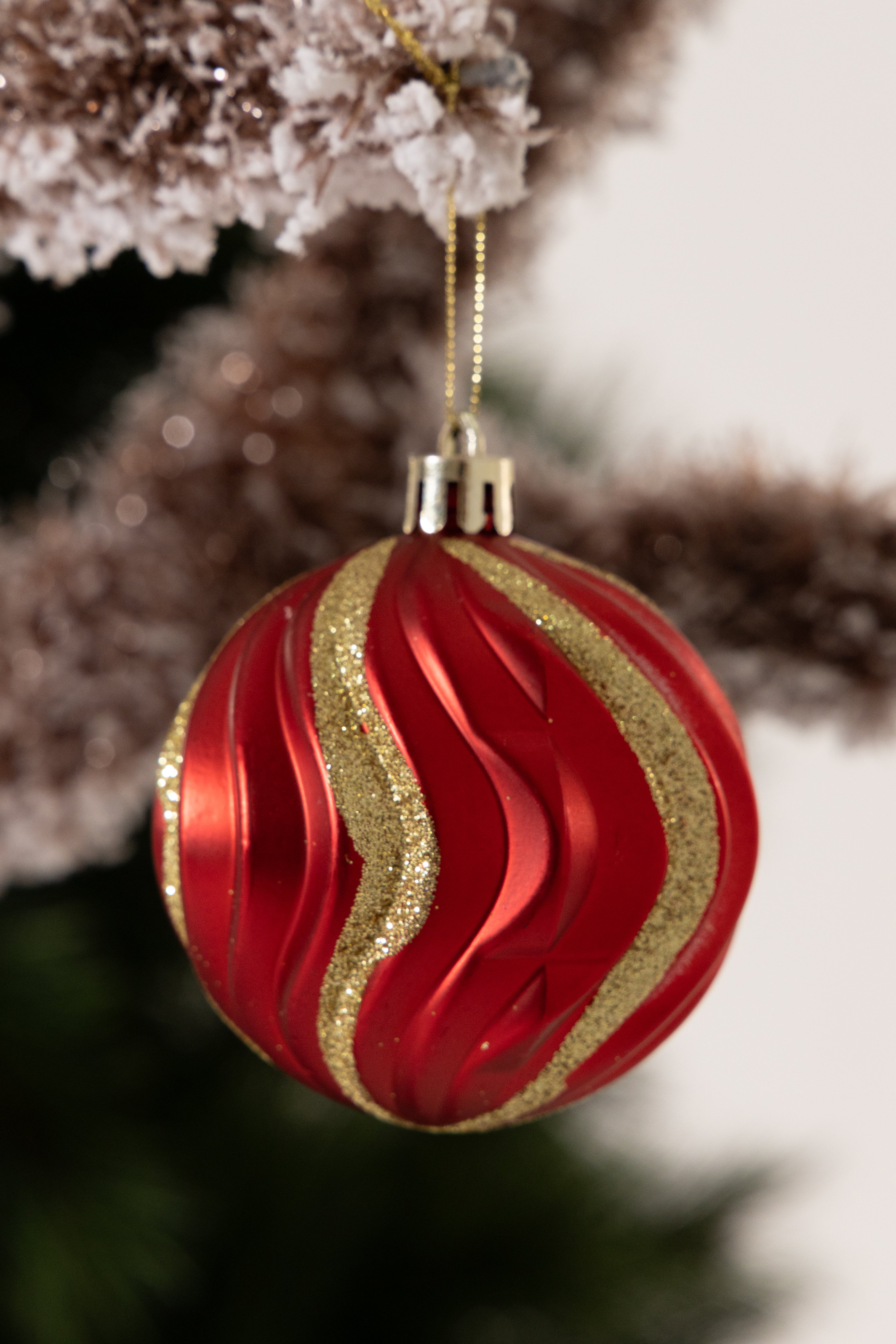 Bring rich festive warmth to your decor with this 30-piece bauble set in ruby red and gold tones. Each 7cm ornament features a striking mix of solid matte gold and red baubles wrapped in glittering gold swirl patterns. The varied textures and lustrous finishes add depth and light reflection to your Christmas tree, wreath, or garland. Perfectly balanced for a classic holiday palette, these shatterproof ornaments come ready to hang for effortless decorating.