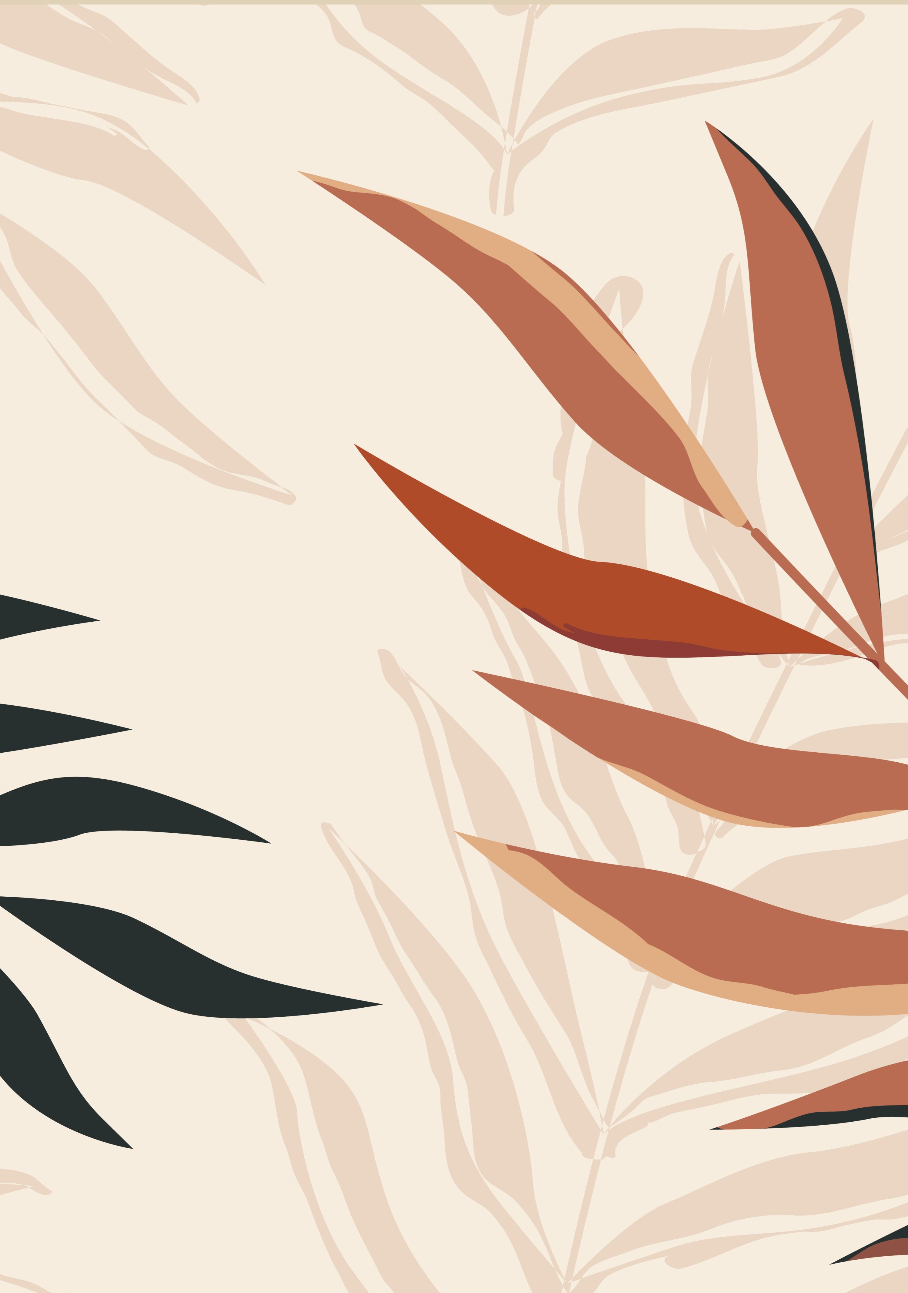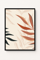 Bring warmth and natural elegance into your home with a modern botanical print that allows you to curate a soothing, earthy atmosphere. Delicate leafy silhouettes in deep green and burnt terracotta flow gracefully across a soft beige background, layered with subtle abstract textures. The matte finish enhances the organic shapes and warm tones, making it versatile for Scandinavian, boho, rustic, or contemporary interiors. Perfect for a living room, bedroom, or office, this artwork adds depth, charm, and timeless natural beauty to your space.