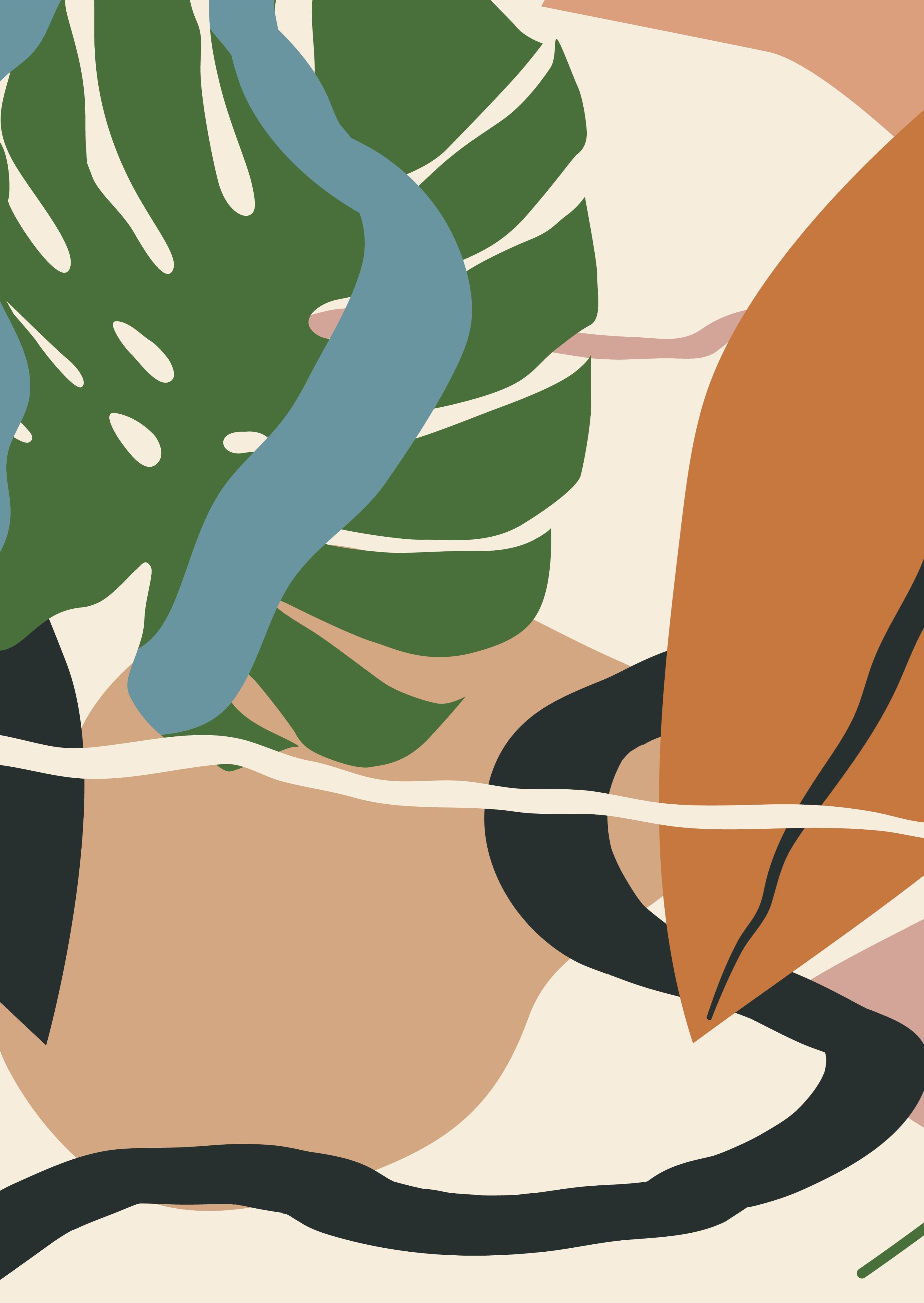 Curate a bold yet natural atmosphere in your home with a modern abstract botanical print that celebrates tropical beauty in earthy tones. Overlapping monstera and banana-inspired leaves in deep green and burnt terracotta flow across a beige backdrop, accented with muted blue and organic black lines for depth and movement. The matte finish enhances the layered shapes and rustic textures, while the warm color palette blends seamlessly with boho, tropical, or contemporary décor. Perfect for a living room, bedroom, or office, this artwork brings nature-inspired sophistication to your walls.