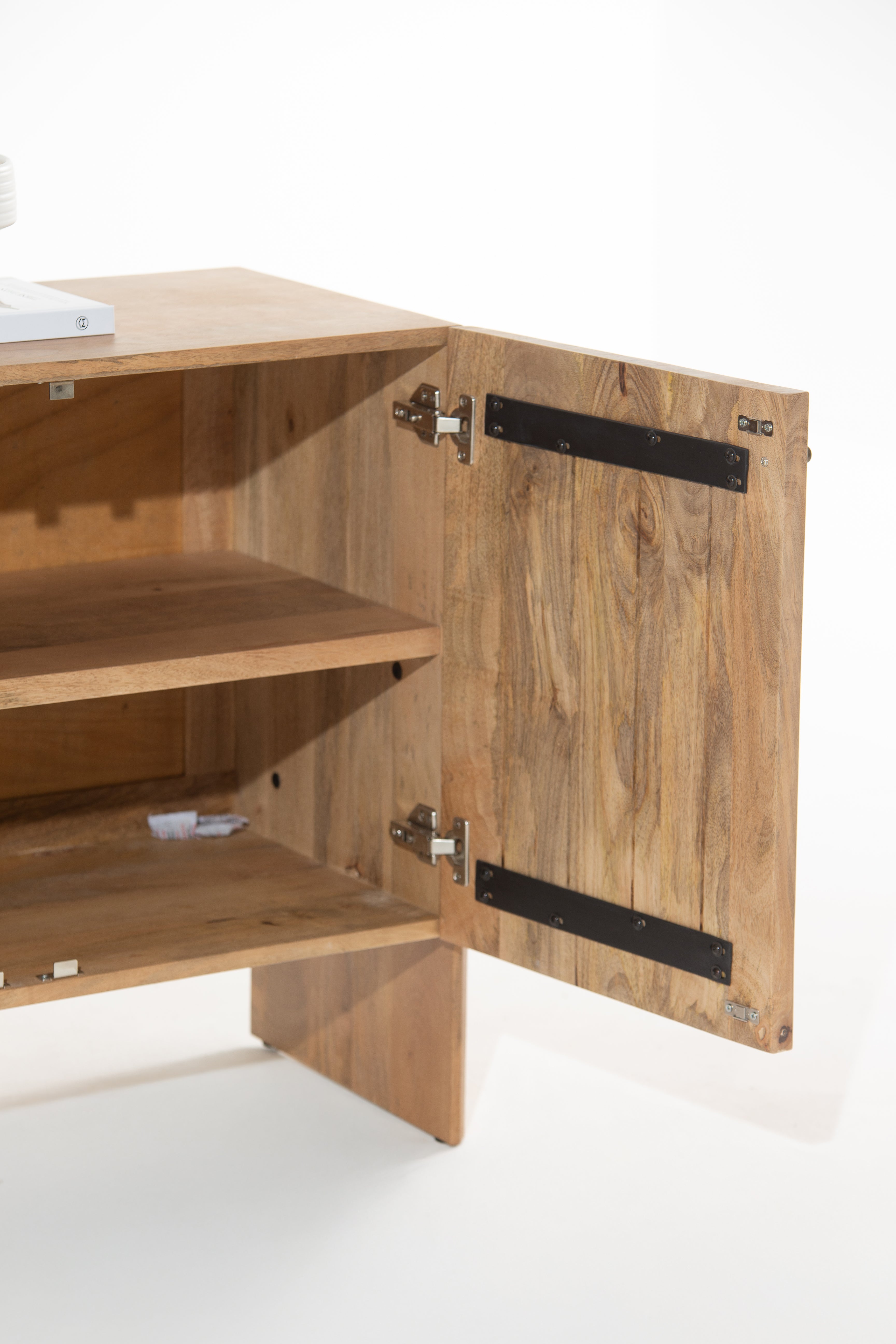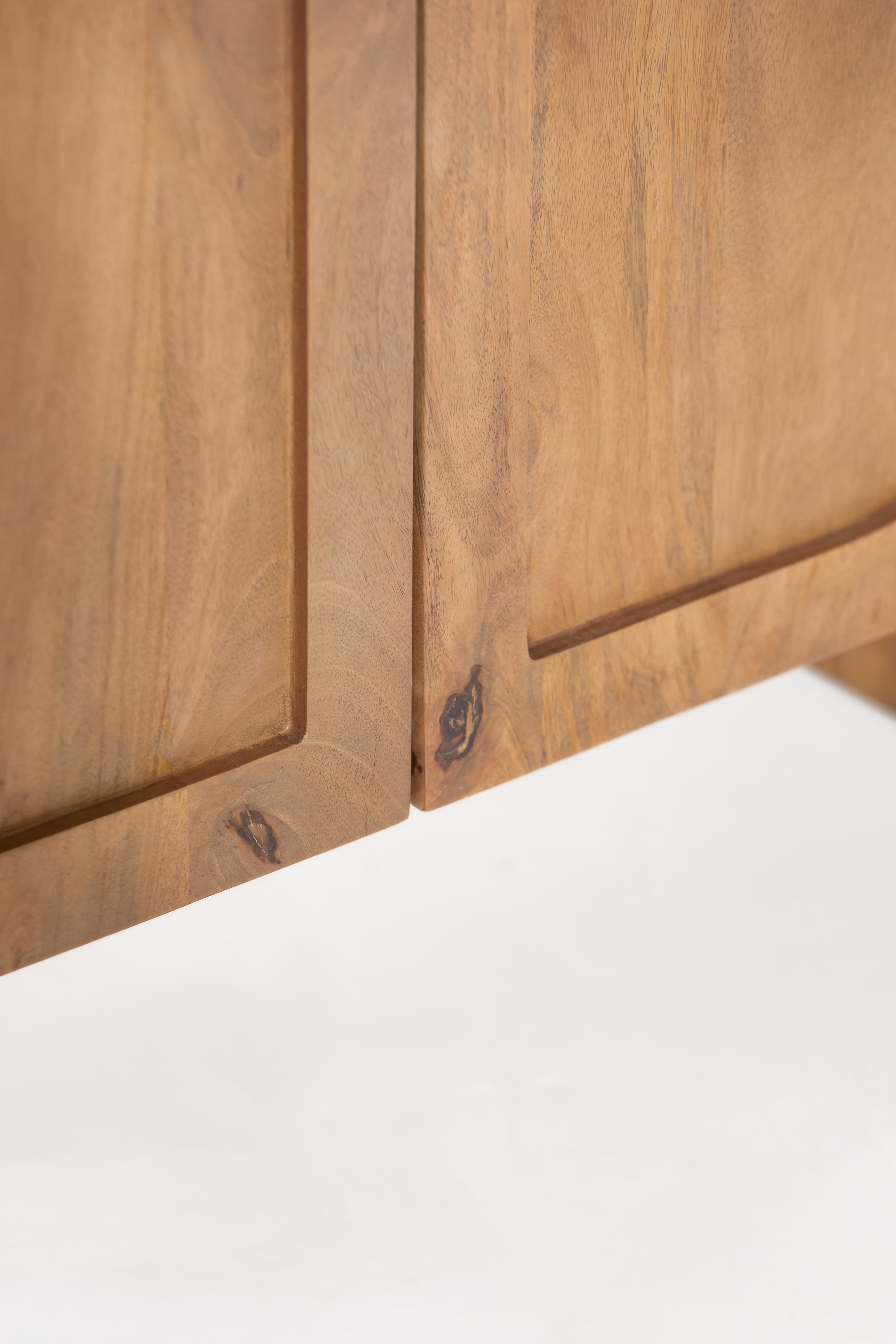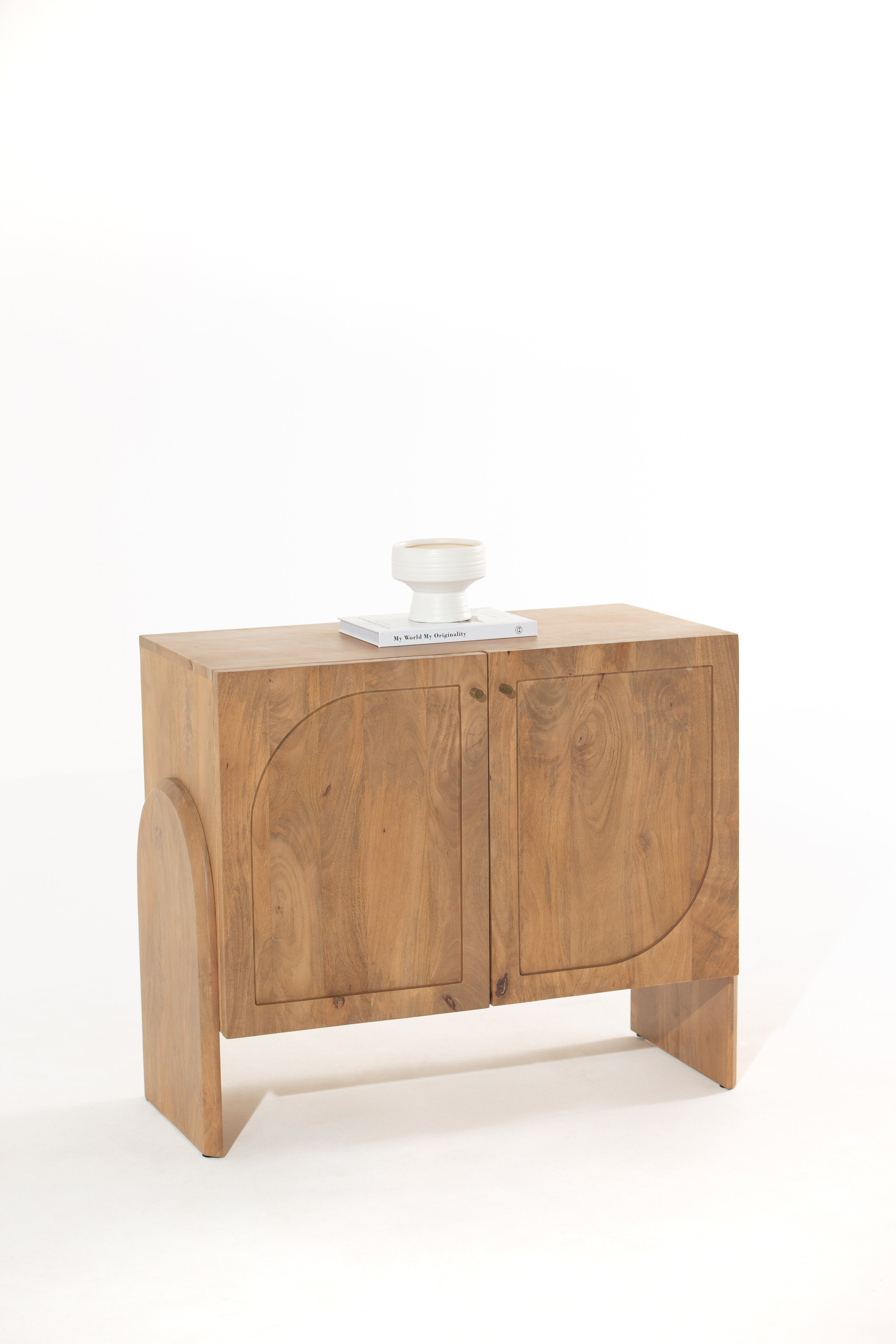 Beautifully crafted from solid Mindi wood, this 2-Door Wooden Sideboard blends timeless craftsmanship with sculptural modern design. The piece features arched inlay detailing on the front panels, bringing subtle visual rhythm to its clean-lined form. Perfectly sized for compact spaces, this sideboard offers versatile storage for a hallway, entryway, or living area. Behind its dual cabinet doors lies ample space to stow away essentials—everything from dinnerware and glassware to books and accessories—while its warm, natural finish highlights the rich grain of the wood.