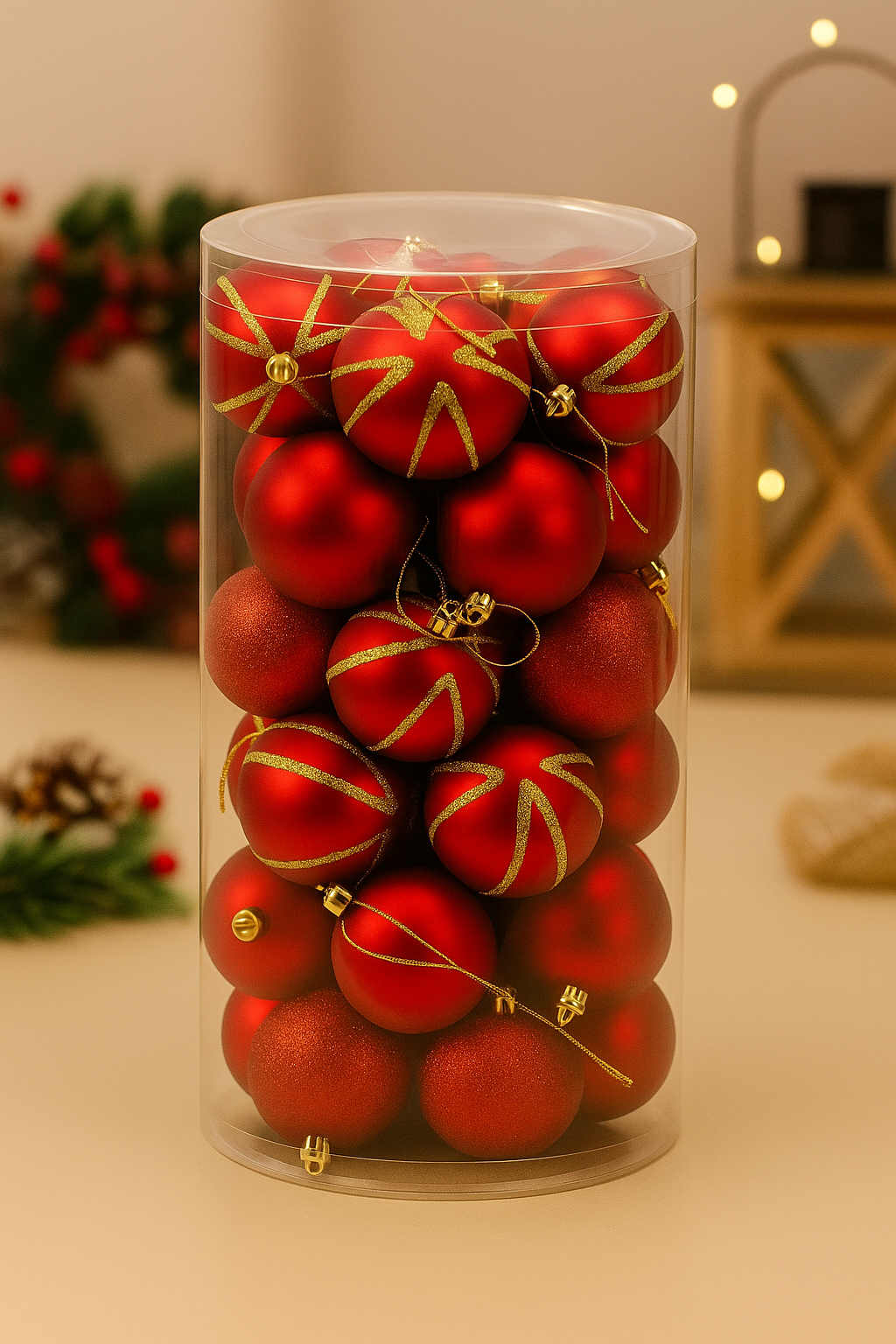 Dress your tree with a coordinated set of 30 red ornaments that mix matte, satin and glitter finishes for depth and sparkle. Gold caps and hanging ties catch the lights, while the classic tone pairs easily with greenery, ribbon and candles. Style them across branches for a balanced look, cluster a few at the tips for highlights, or scatter through bowls and garlands. Durable and lightweight, they’re easy to place and store, ready to refresh wreaths, centrepieces and festive corners each year anew!