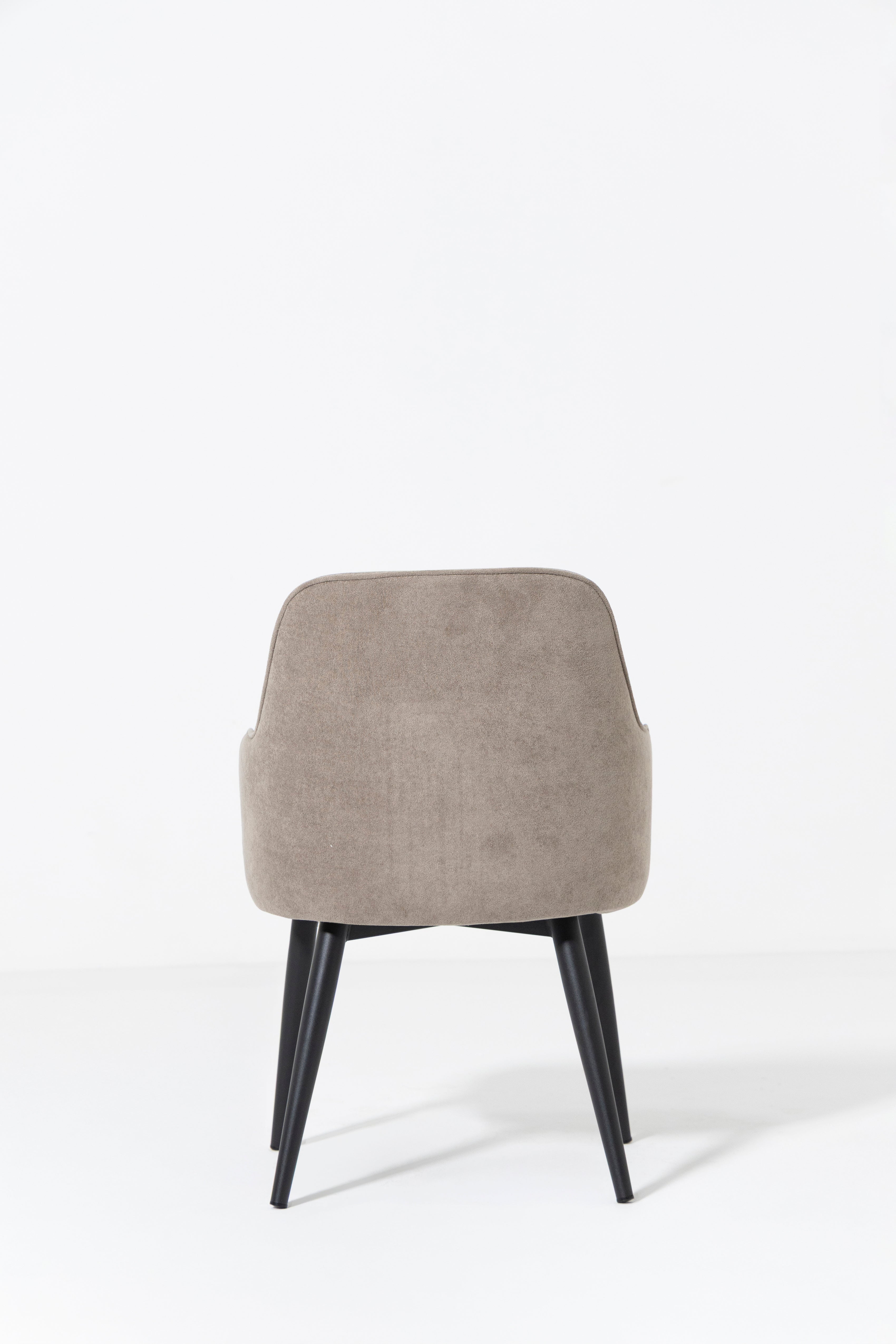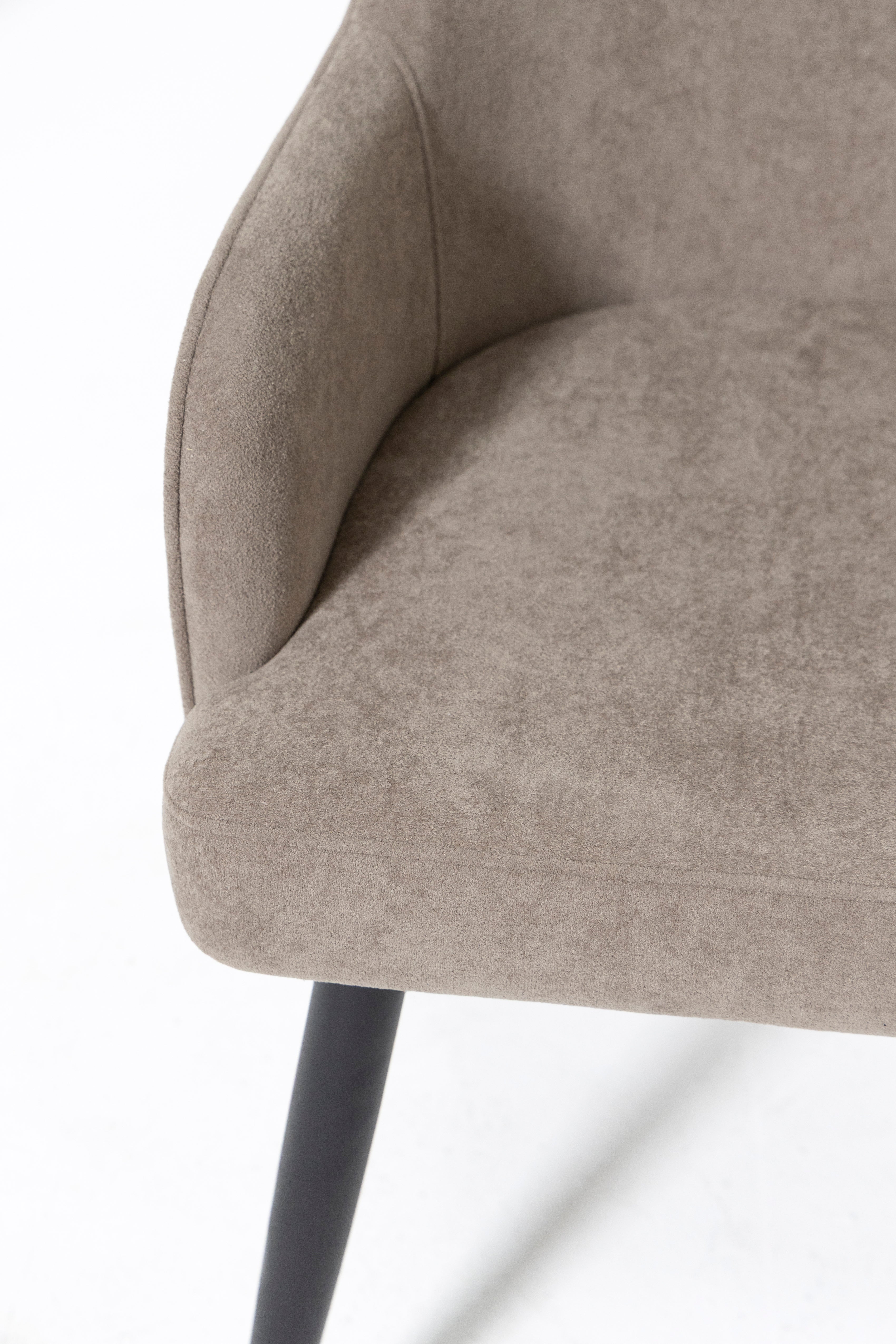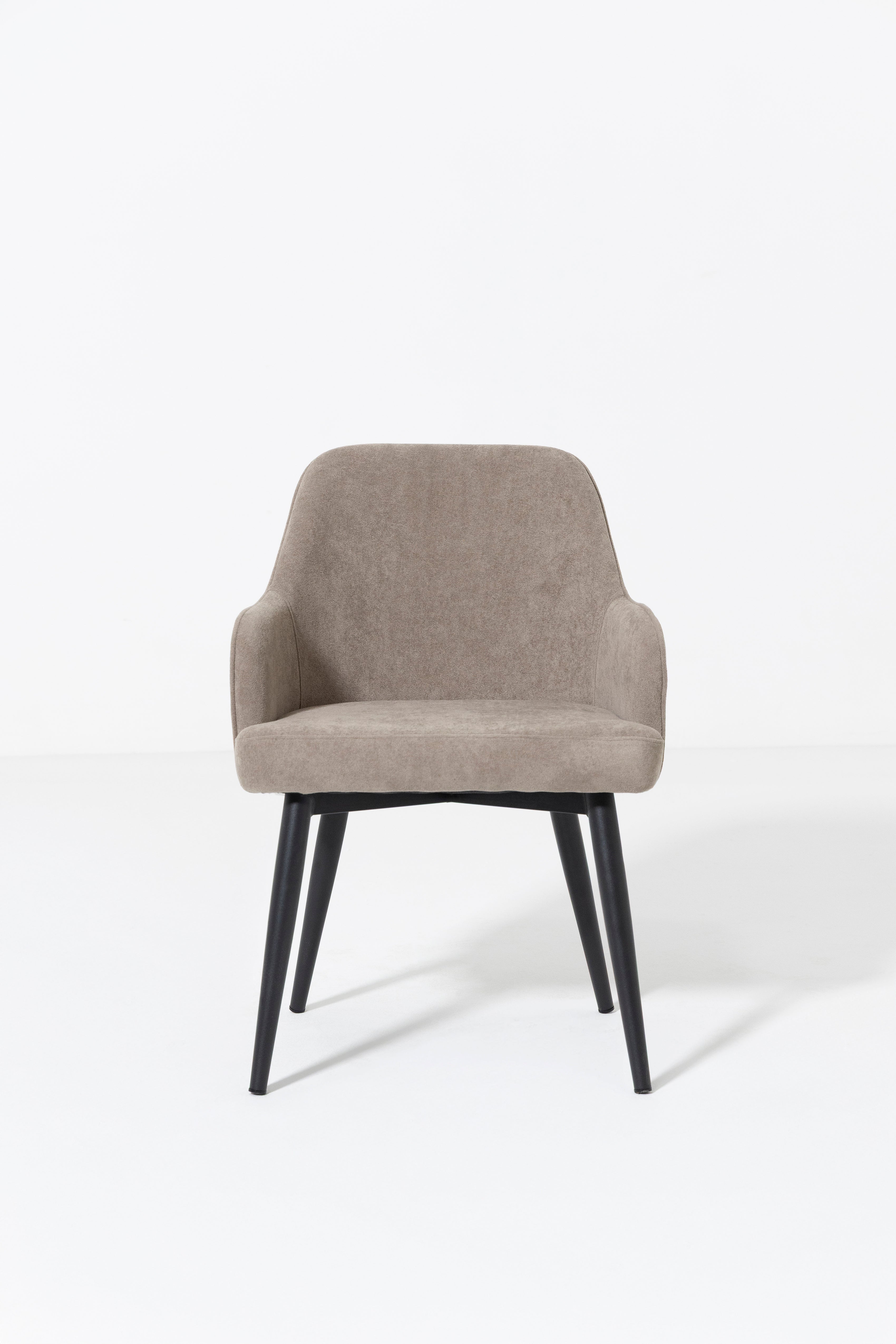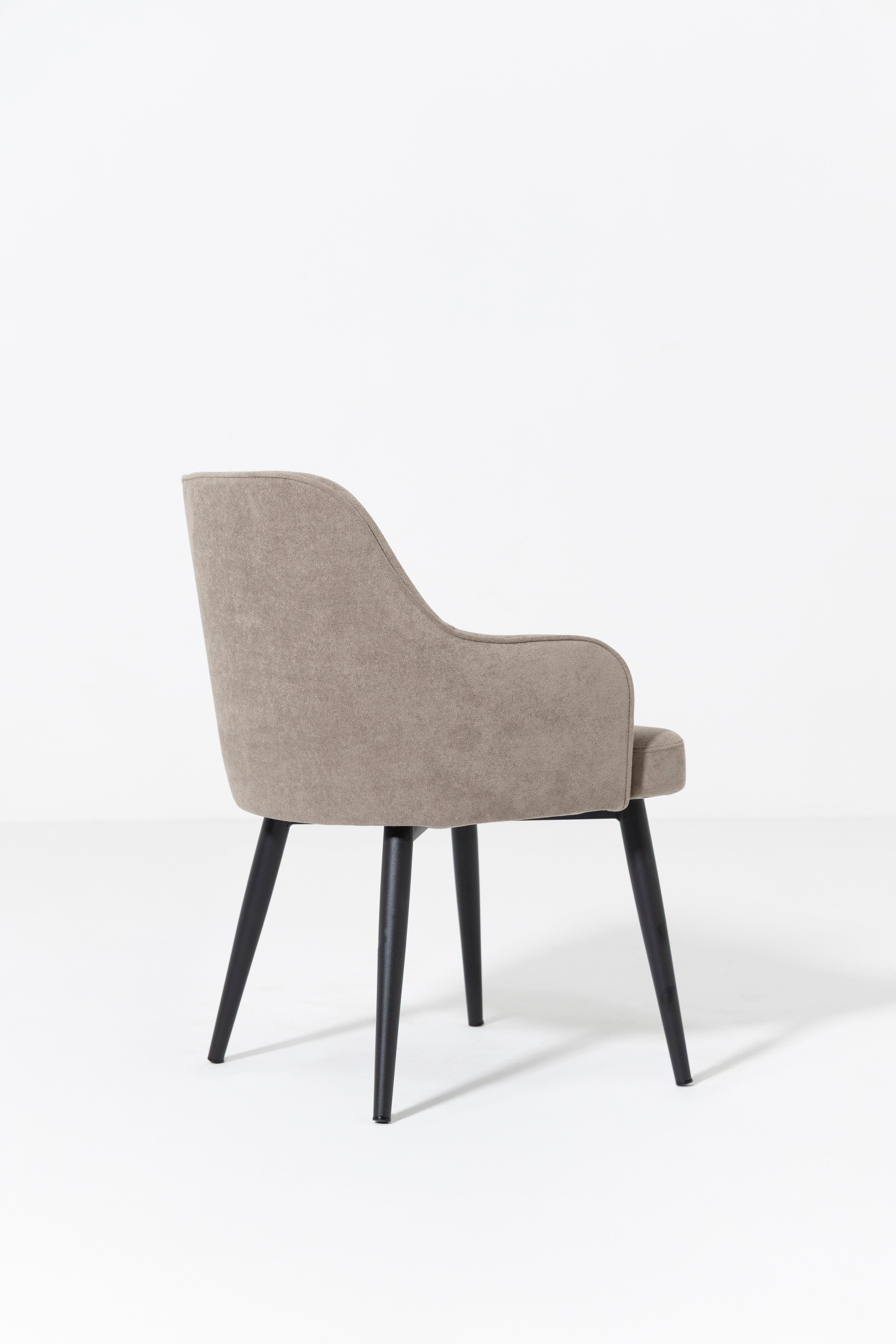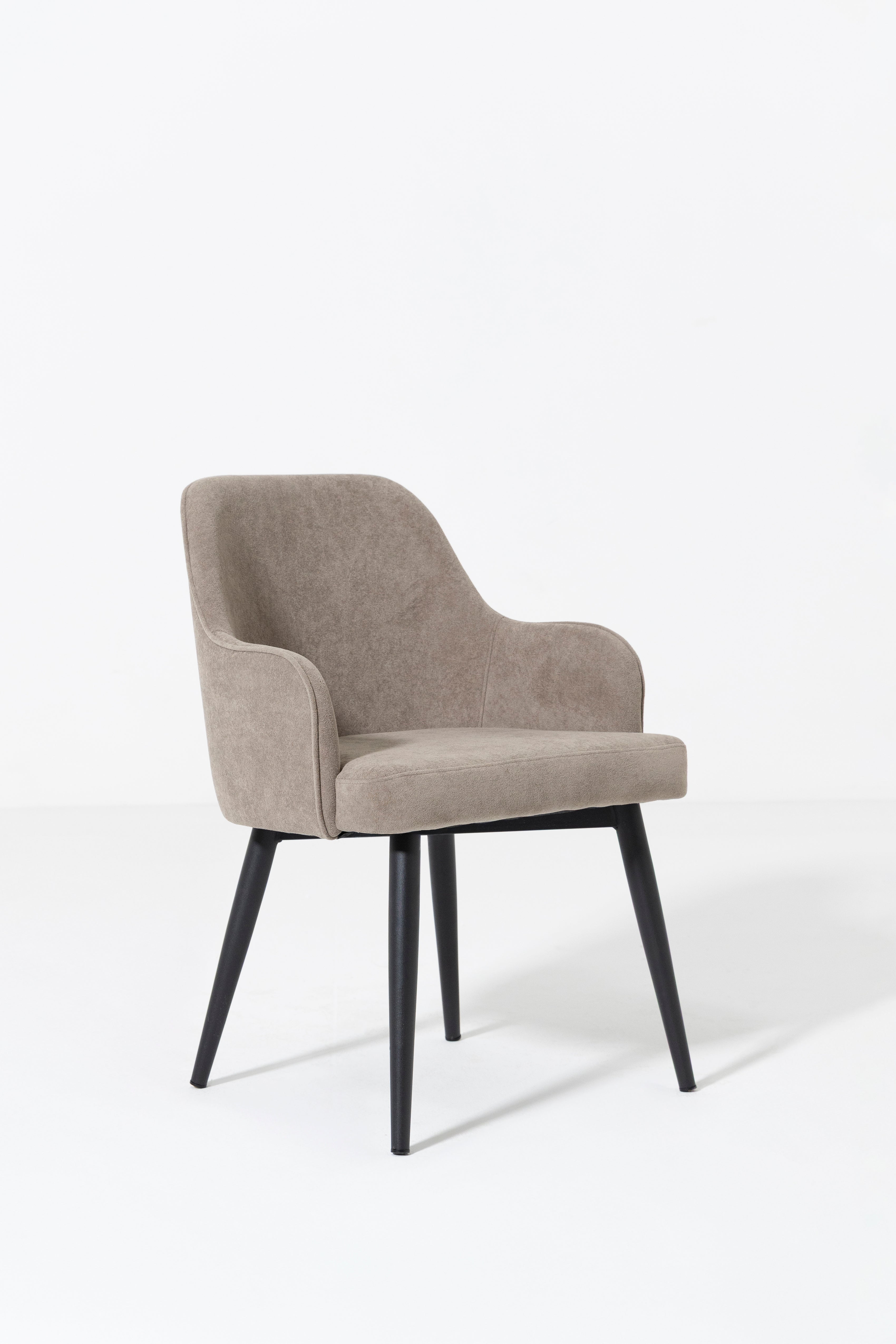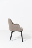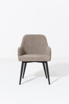 Upgrade your dining experience with this stylish dining chair, designed to offer both comfort and contemporary elegance. It features a curved, ergonomic seat and backrest with integrated armrests, all upholstered in a soft, textured Stone Beige fabric that brings brightness, warmth, and a refined neutral tone to your space. The subtly angled black metal legs provide striking contrast and sturdy support, creating a balanced blend of modern design and everyday functionality. Whether you’re enjoying long meals or engaging conversations, this chair offers inviting comfort while enhancing dining rooms, kitchens, or even living areas with its mid-century modern, Scandinavian, or transitional appeal.