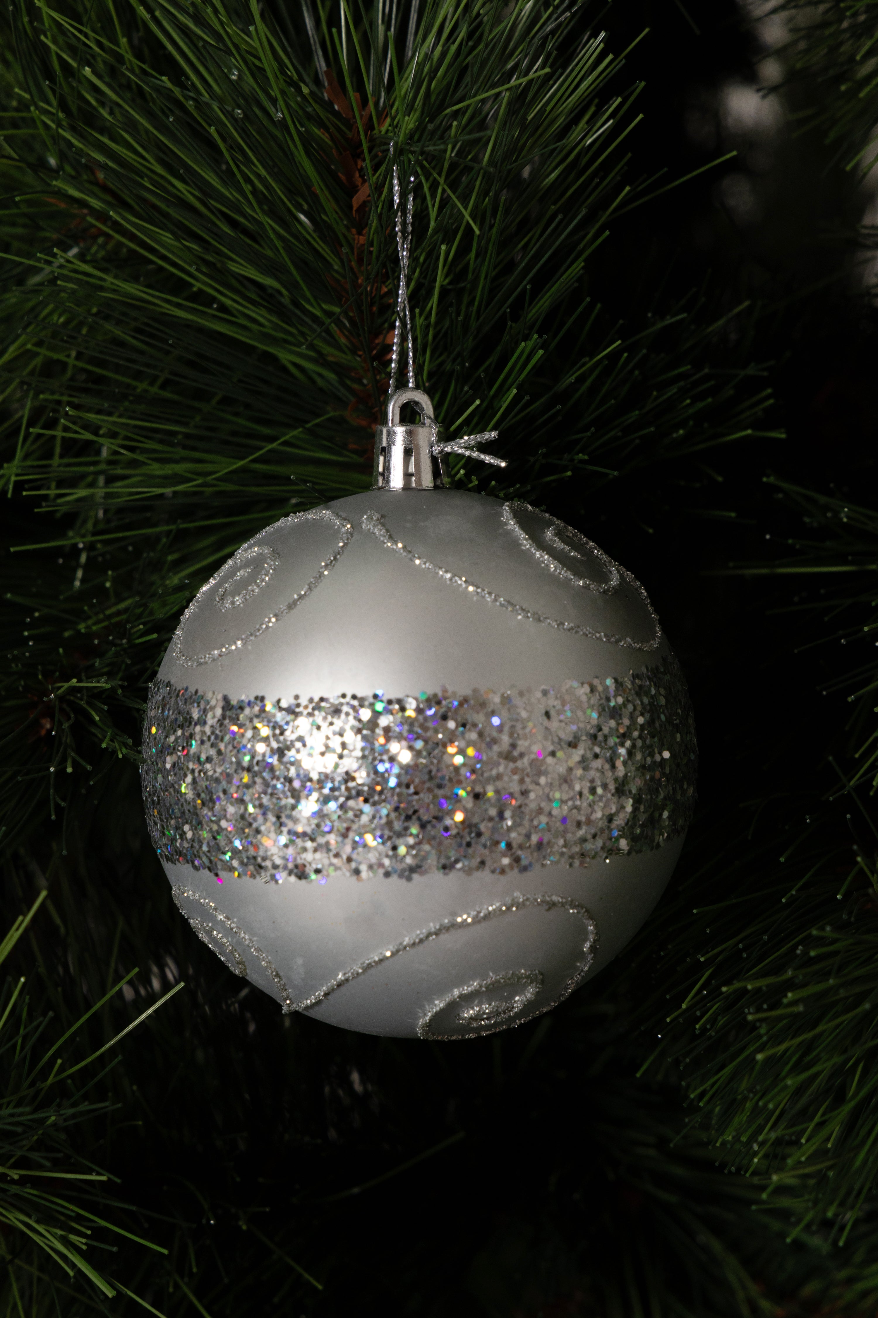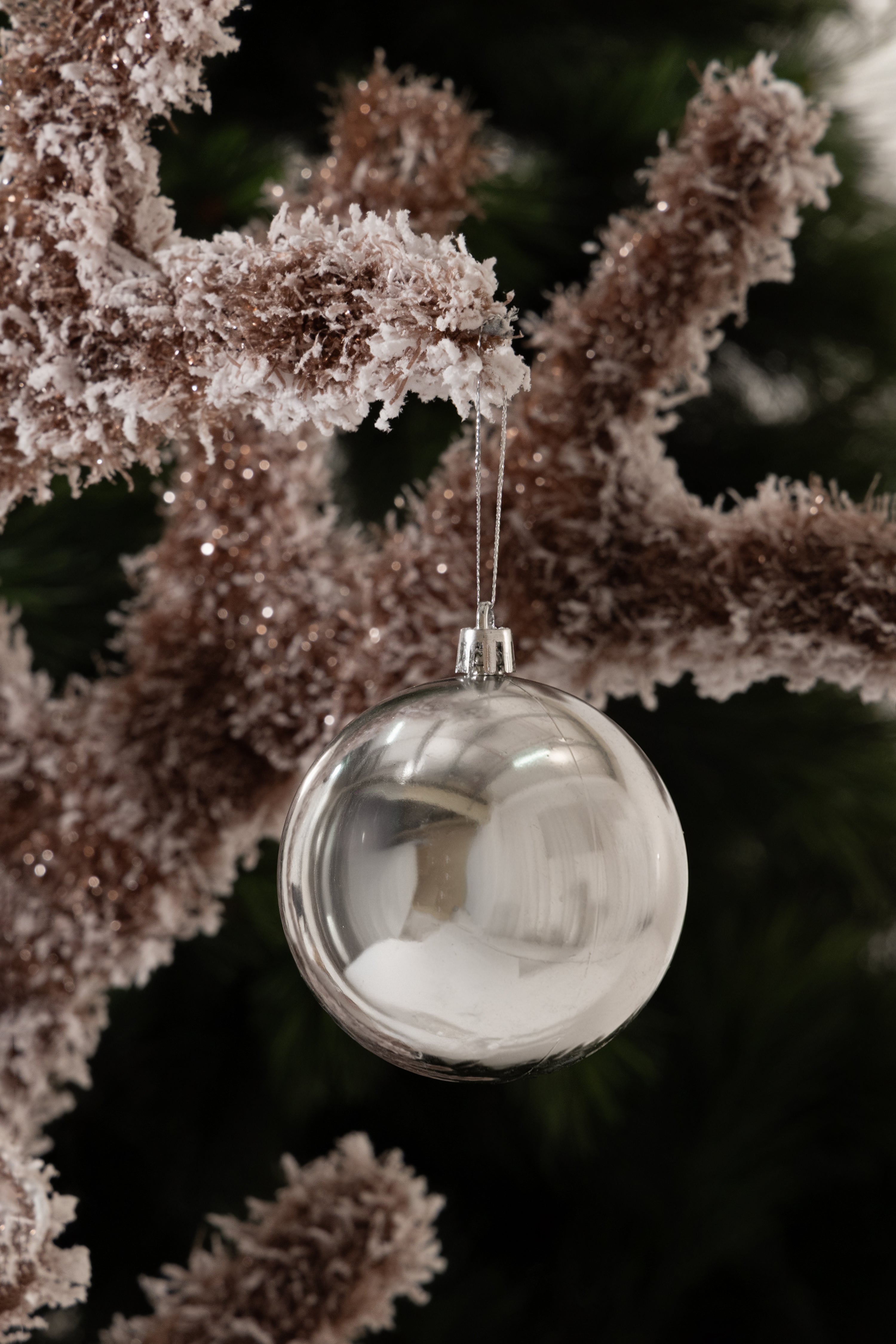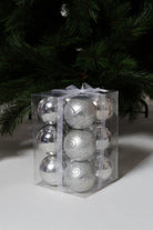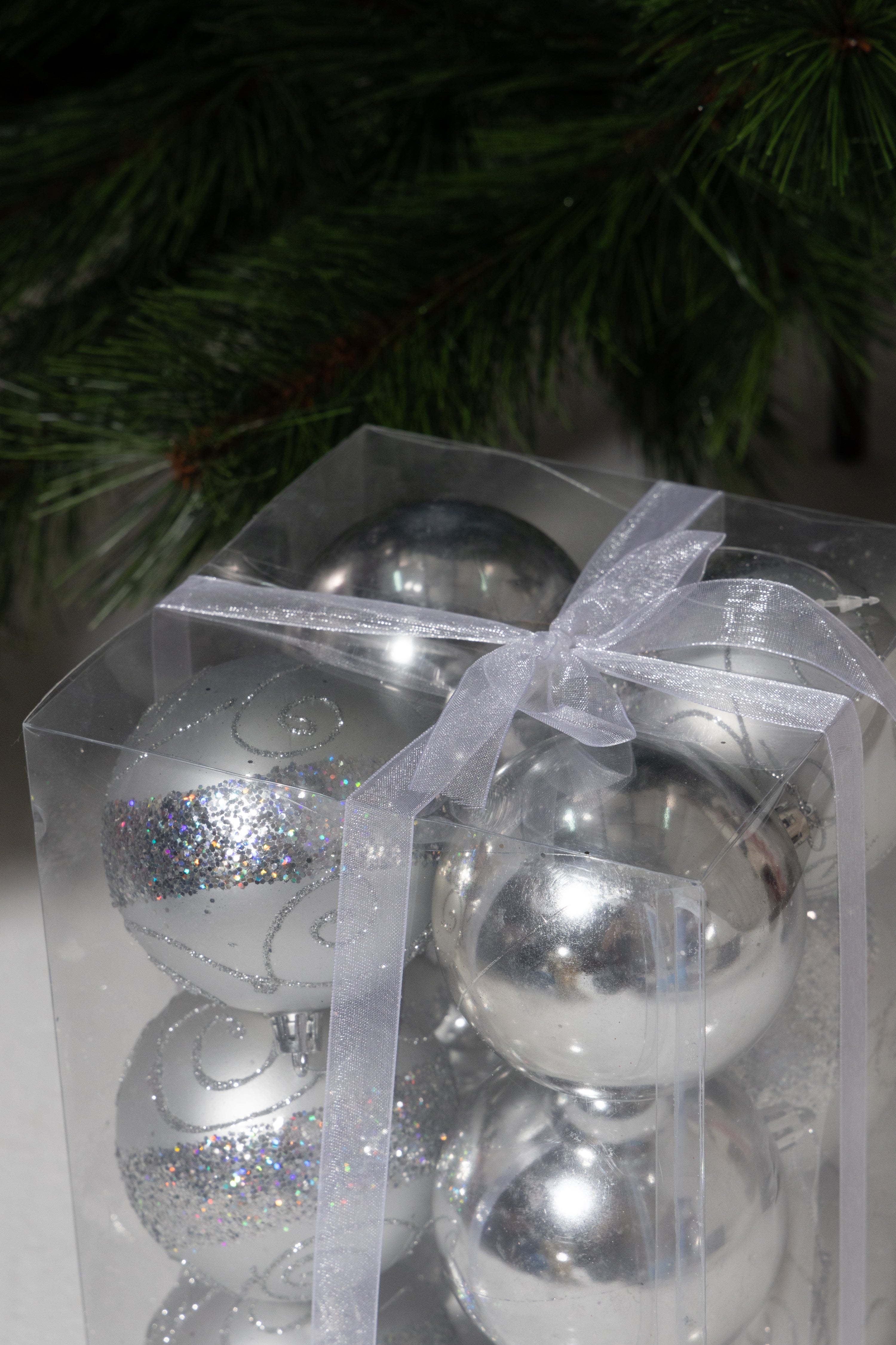 Bring a soft winter glow to your holiday decor with this elegant set of silver bauble ornaments. Each ornament features a mix of shiny and matte finishes that add beautiful depth and sparkle to your Christmas tree. The set includes twelve durable balls carefully arranged in a clear container, making them easy to store and perfect for gifting. Their timeless silver tone blends effortlessly with both classic and modern holiday decorations, adding a refined touch to any festive display.