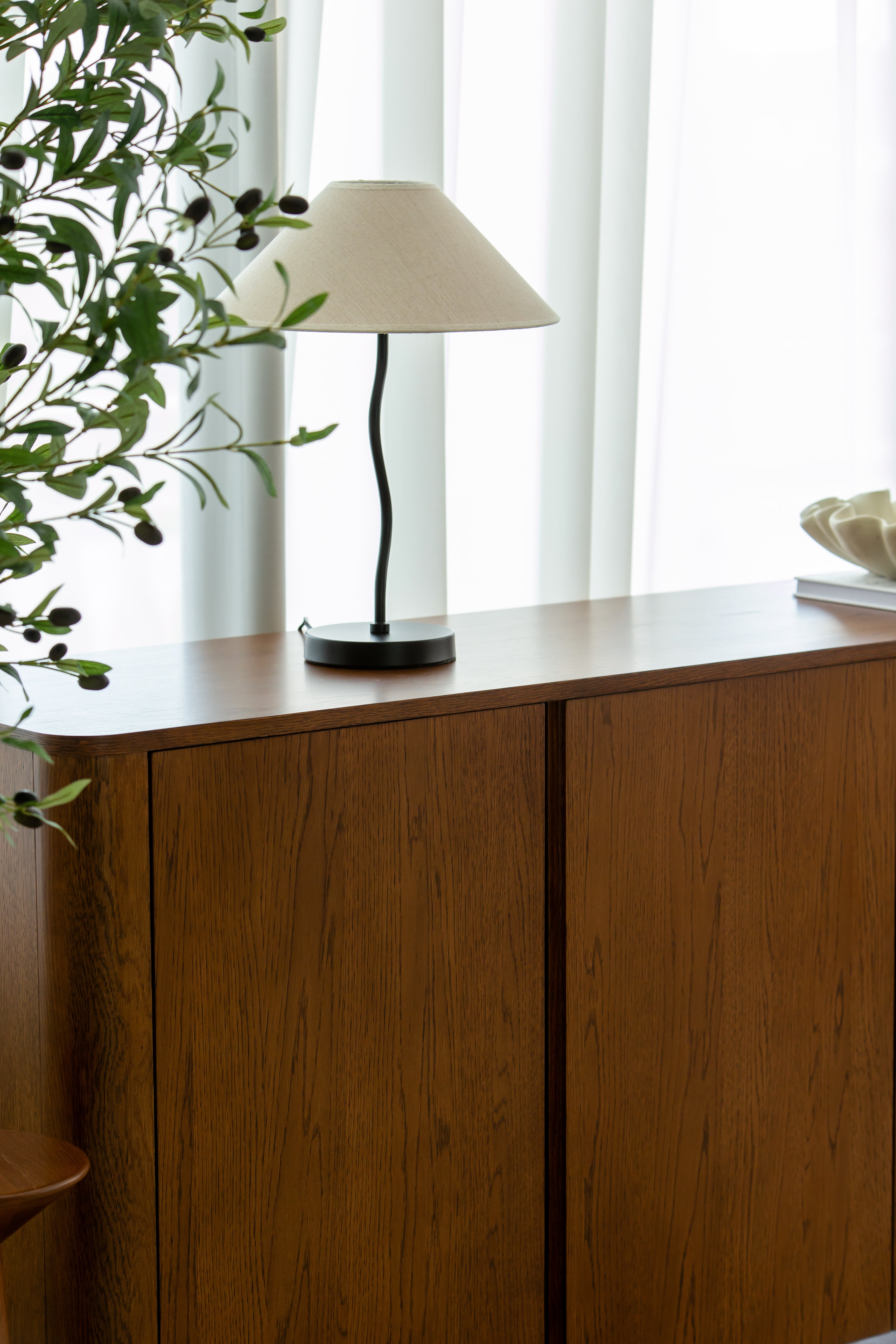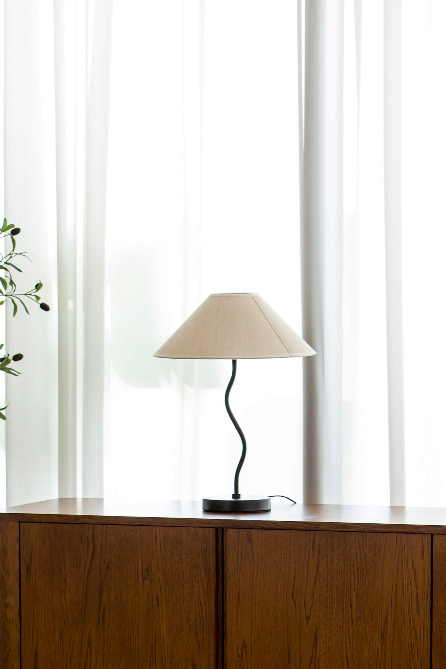A modern masterpiece blending sculptural design and practical elegance. Featuring a gracefully curved metal frame anchored by a sleek black base, this table lamp makes a striking statement on nightstands, side tables, or consoles. The wide, conical fabric shade softens the light, casting a warm, ambient glow perfect for reading or setting a relaxing mood. The black finish adds depth and contrast, while the wave-inspired form introduces artistic movement. As the designer of your own sanctuary, this lamp lets you balance function and style with effortless charm.