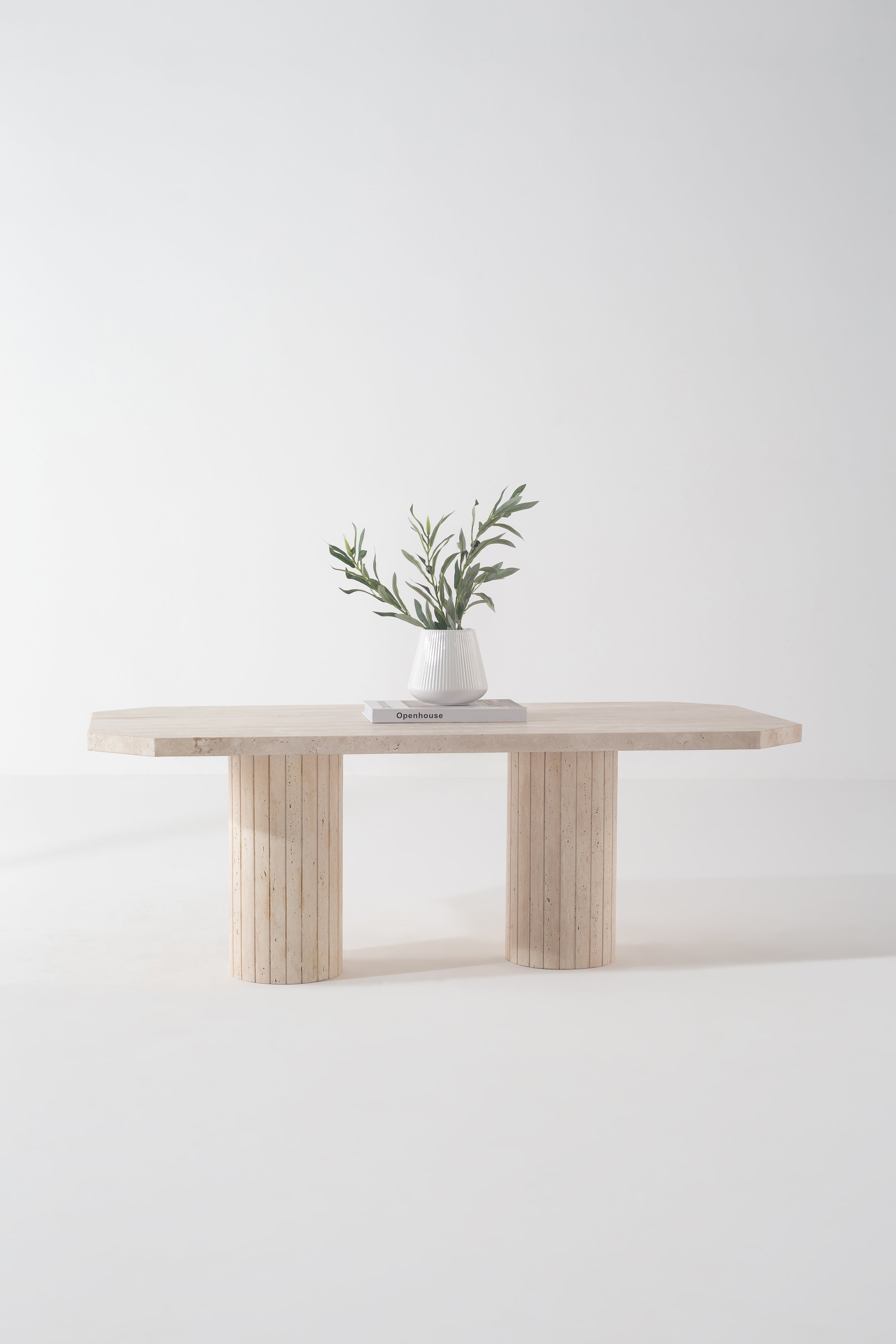 The moment your space calls for a centerpiece that exudes sophistication, this travertine coffee table answers. Its hexagonal top, rich with natural beige tones and soft veining, becomes the perfect stage for your curated decor. The fluted cylindrical legs add depth and architectural charm, elevating the design with effortless grace. Every touch reveals the smooth, organic texture of solid travertine, bringing warmth and refinement to your living area. Whether hosting conversations or holding your favorite reads, this table seamlessly blends function and artistry, making every moment around it a statement in style.