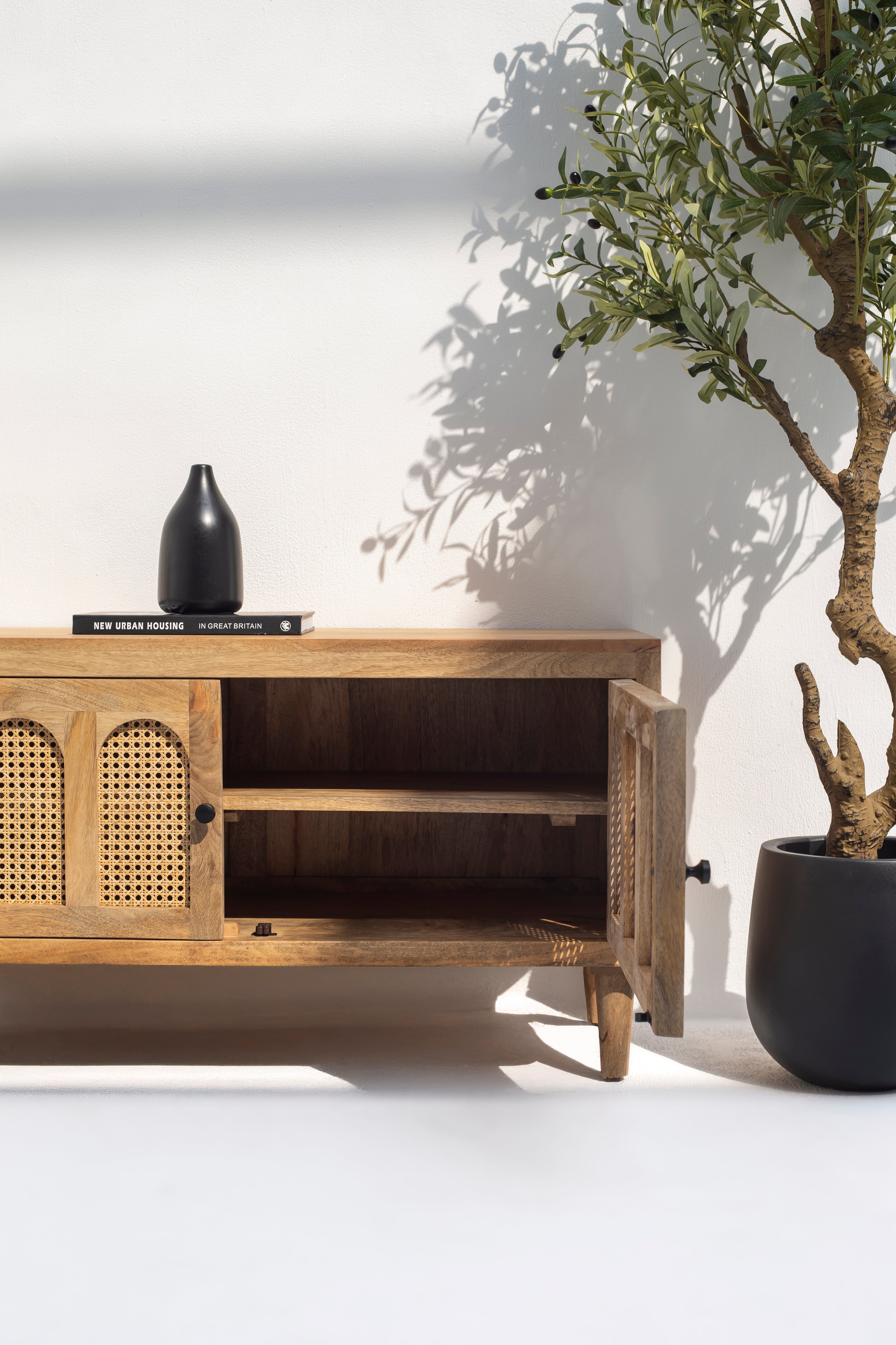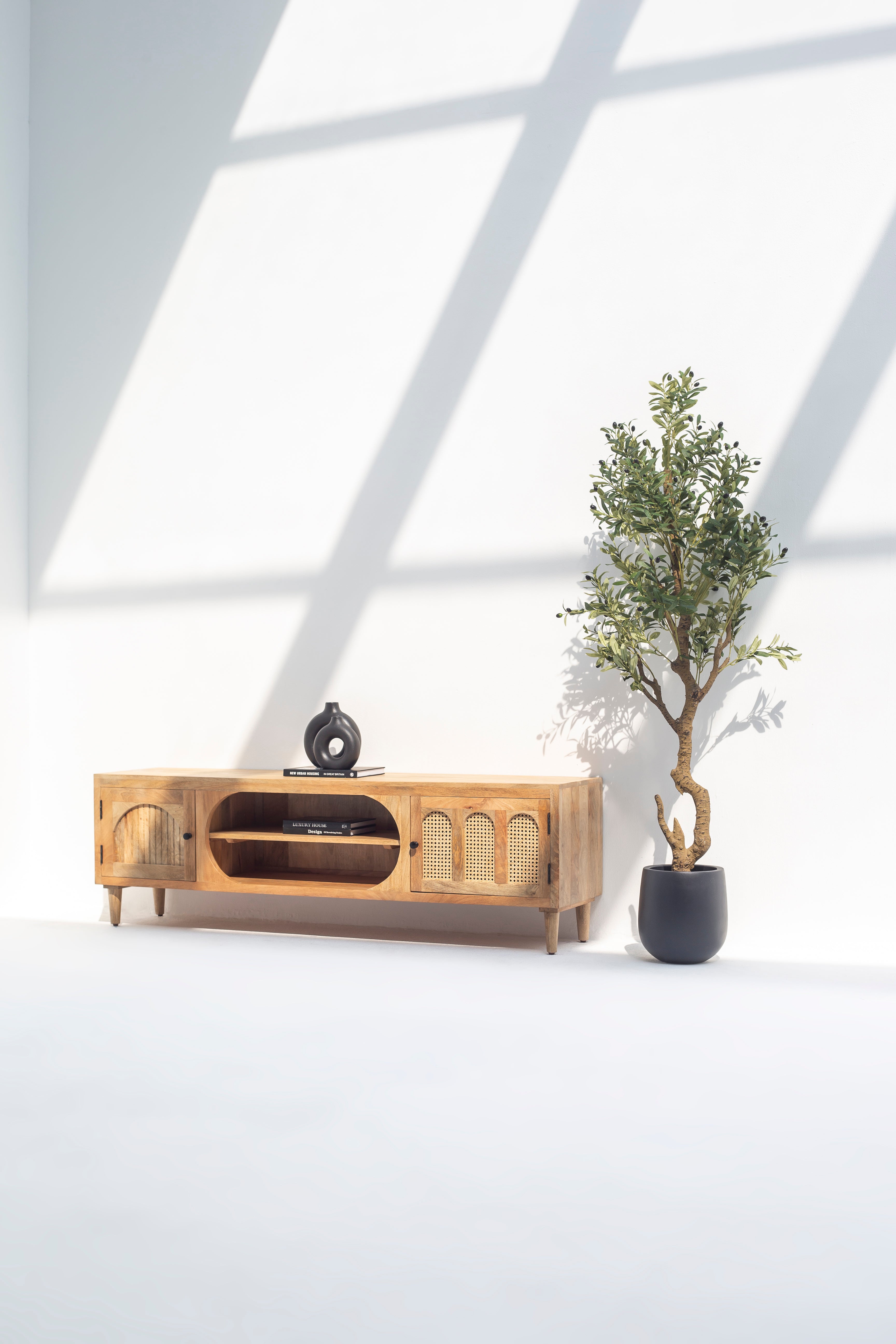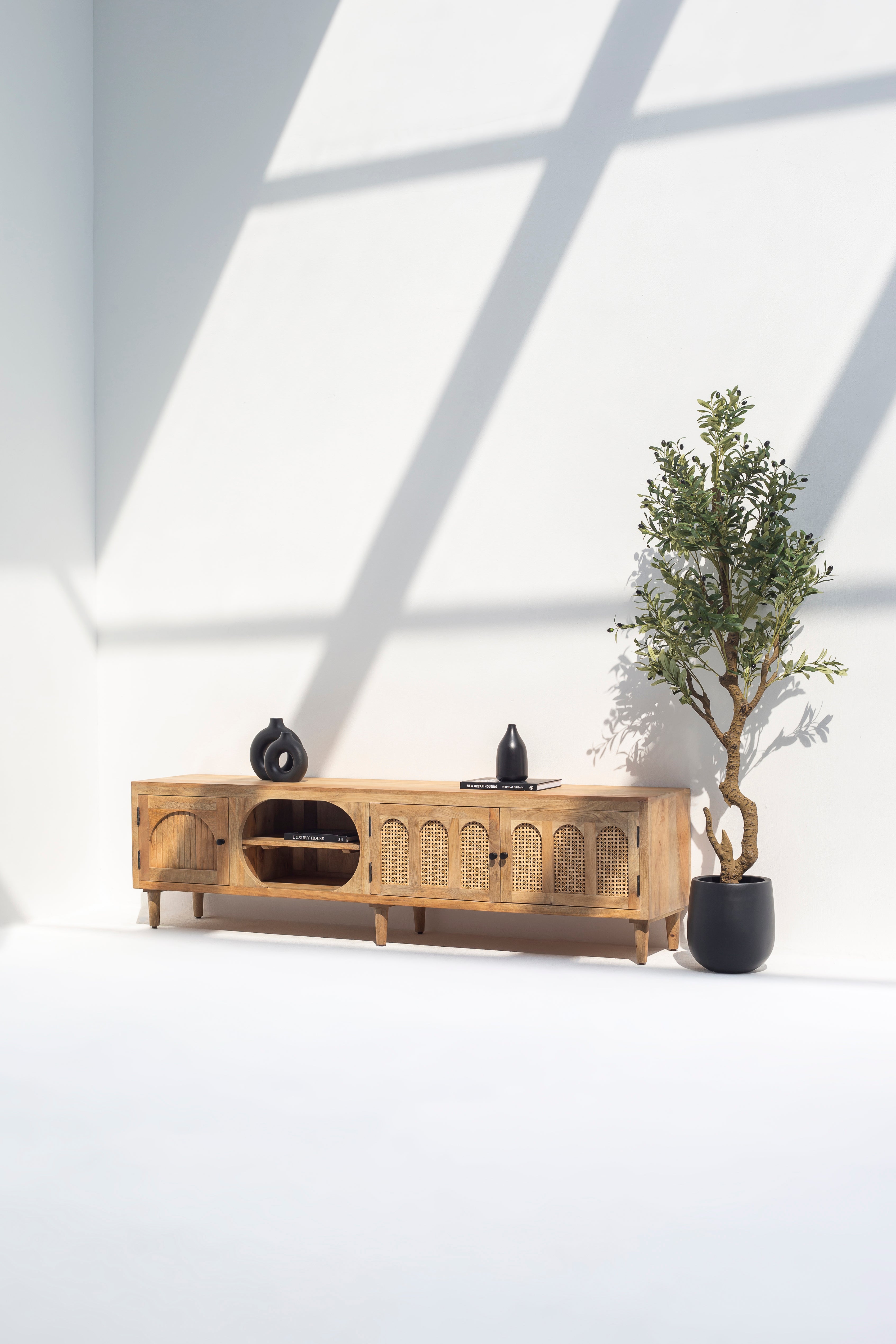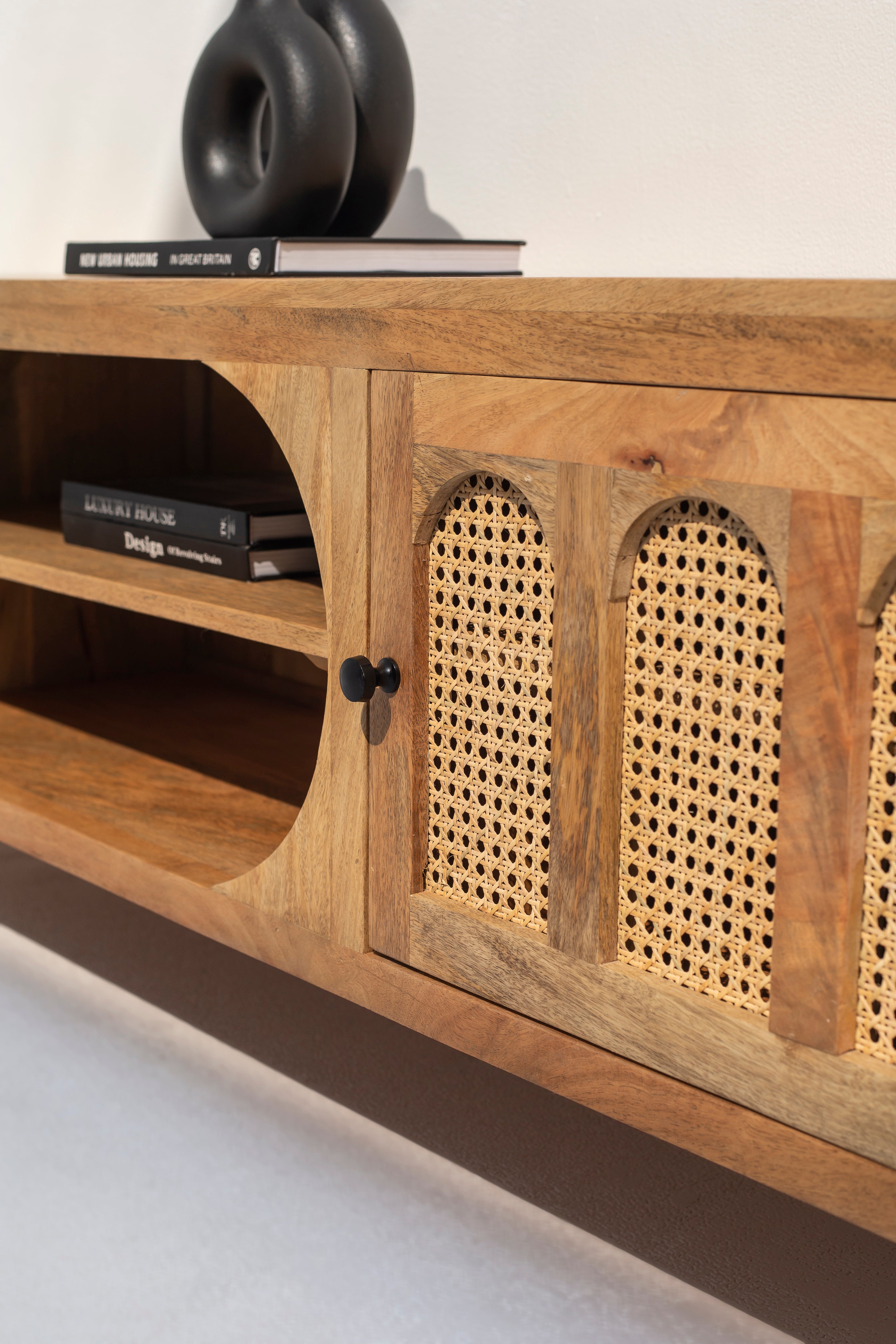 Crafted from premium mango wood, the Taline Wooden tv Unit brings a natural charm to your living space. Its sleek rectangular silhouette features an elegant mix of smooth finishes and natural wood grains that add warmth and depth. Highlighted with rattan cabinet details and an arched central shelving unit, this tv stand offers a stylish blend of contemporary and rustic design. Perfect for organizing electronics or displaying décor, the Taline is a stunning and functional centerpiece.
