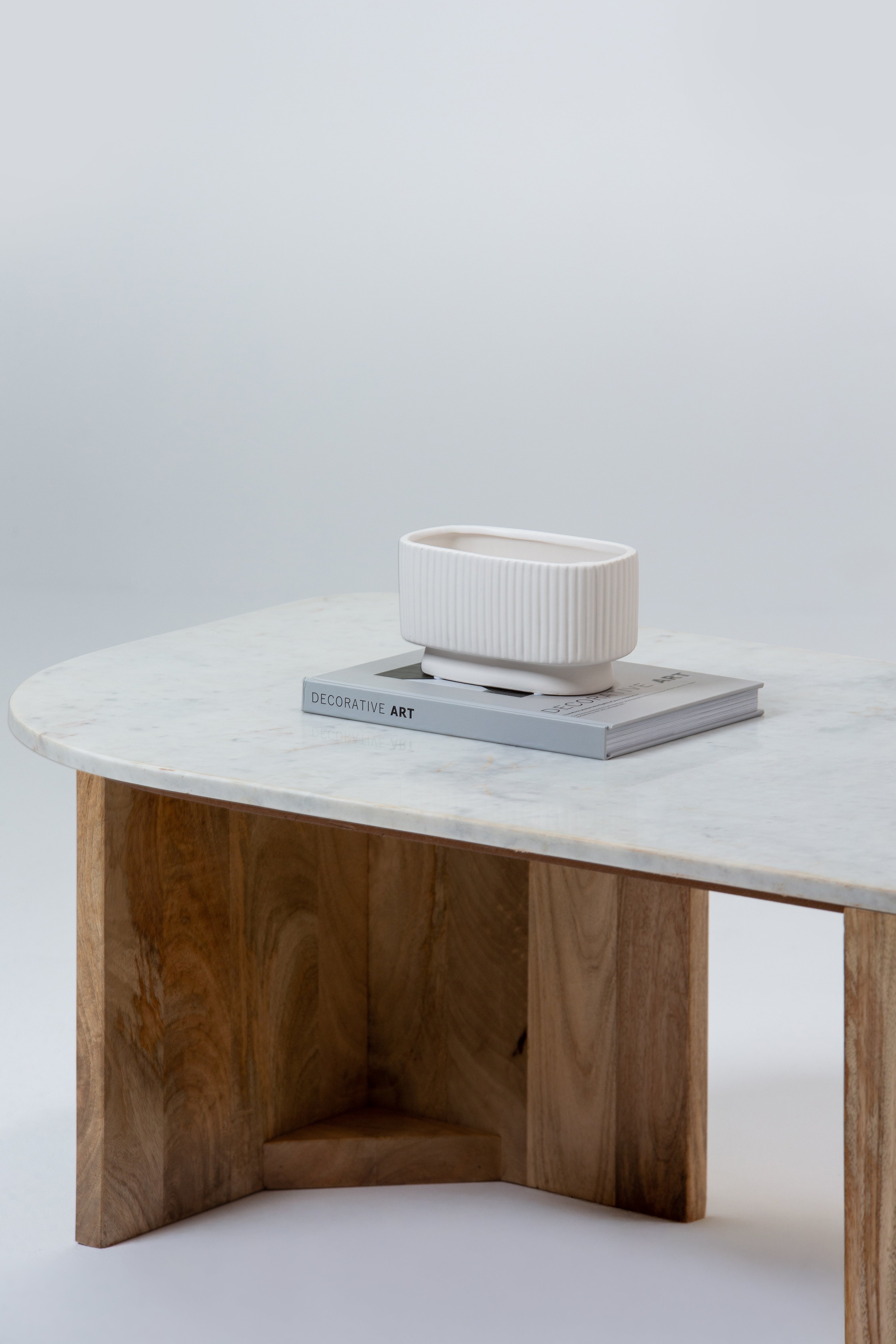 The Talitha Marble Top Coffee Table features a sleek oval marble top, beautifully supported by a uniquely designed mango wood base in a natural finish. The base showcases curved panel legs with smooth edges and an architectural cutout, creating a striking visual balance between strength and artistry. Its rounded edges and soft grain patterns add a modern yet organic touch, making it a sophisticated centerpiece for your living space.