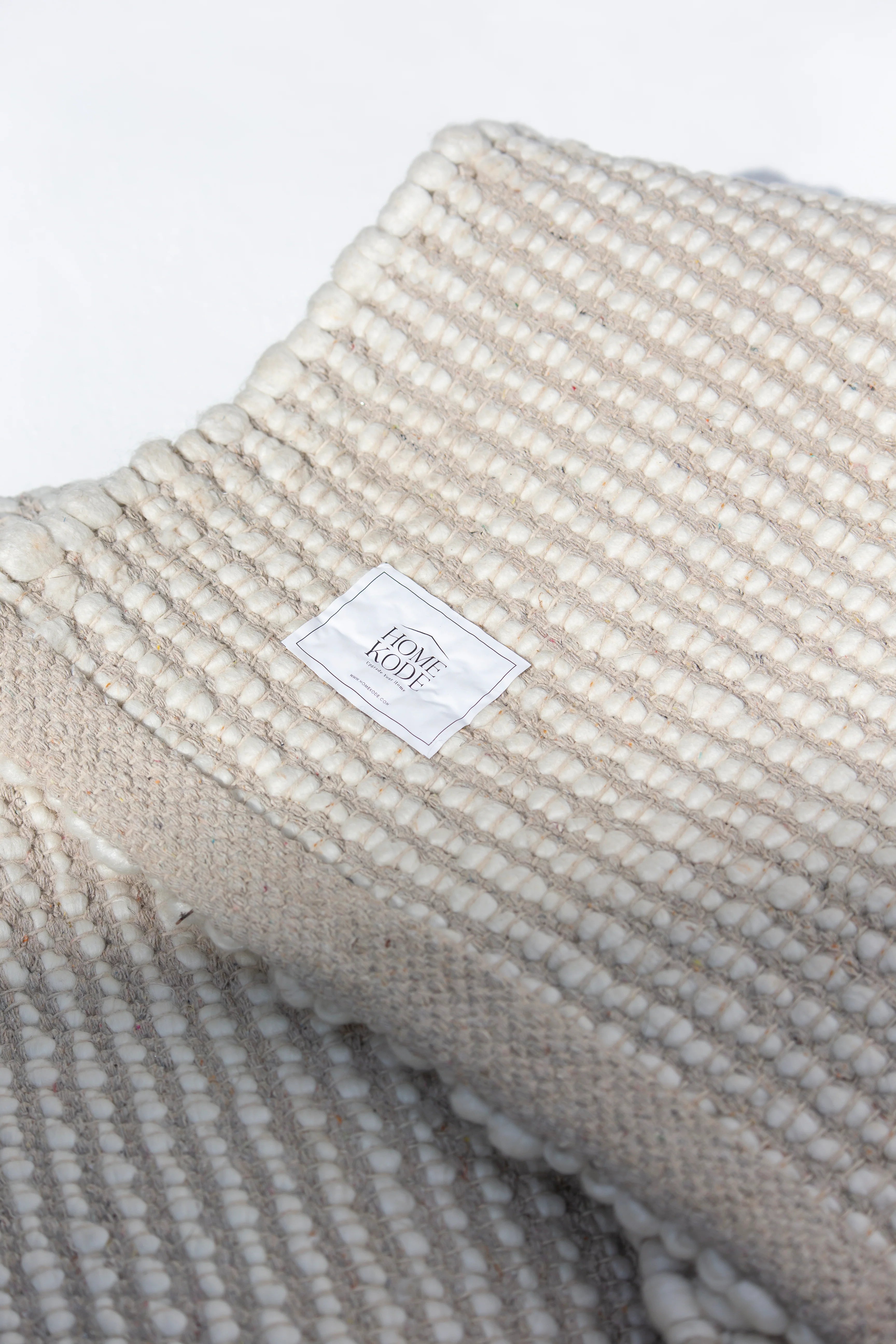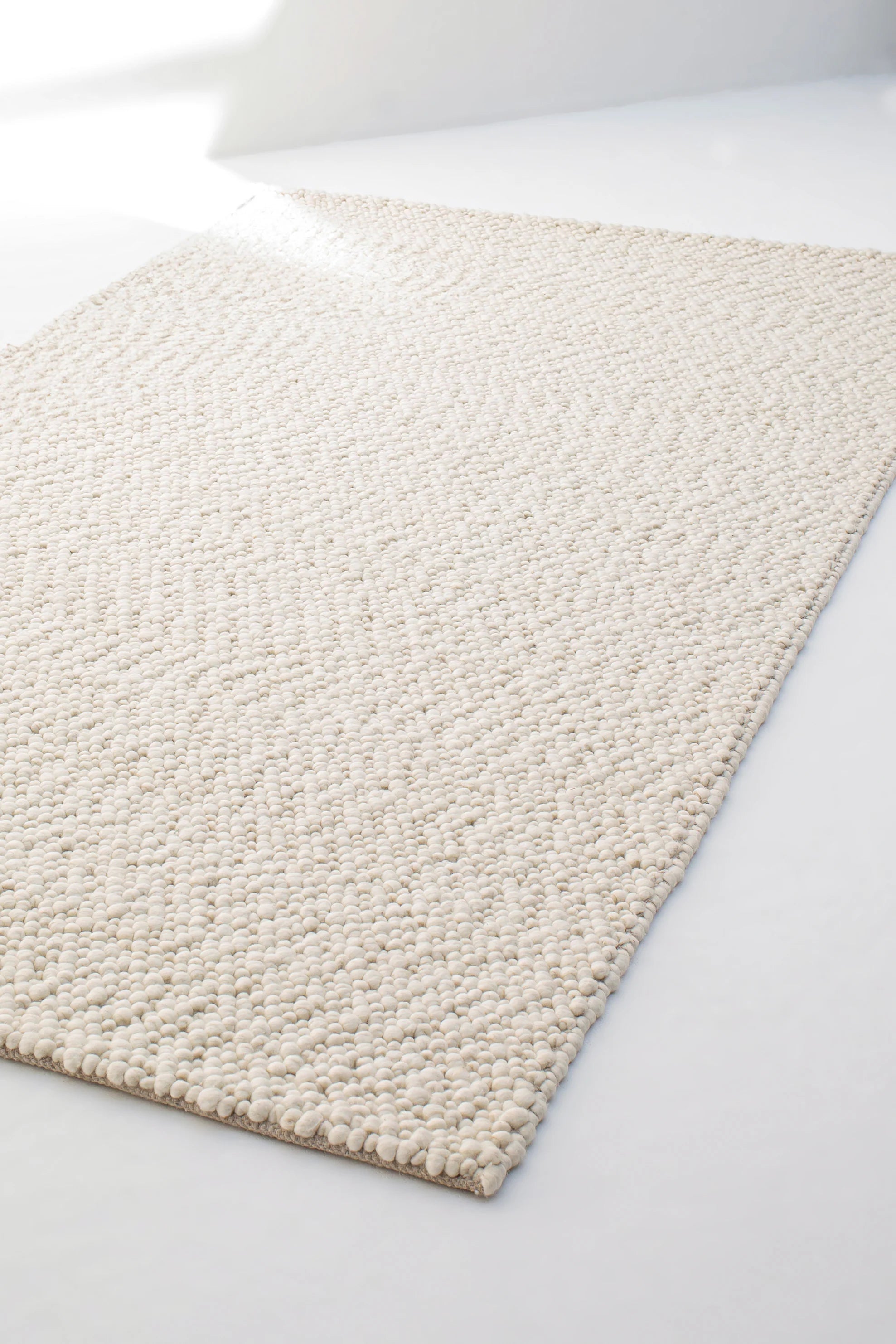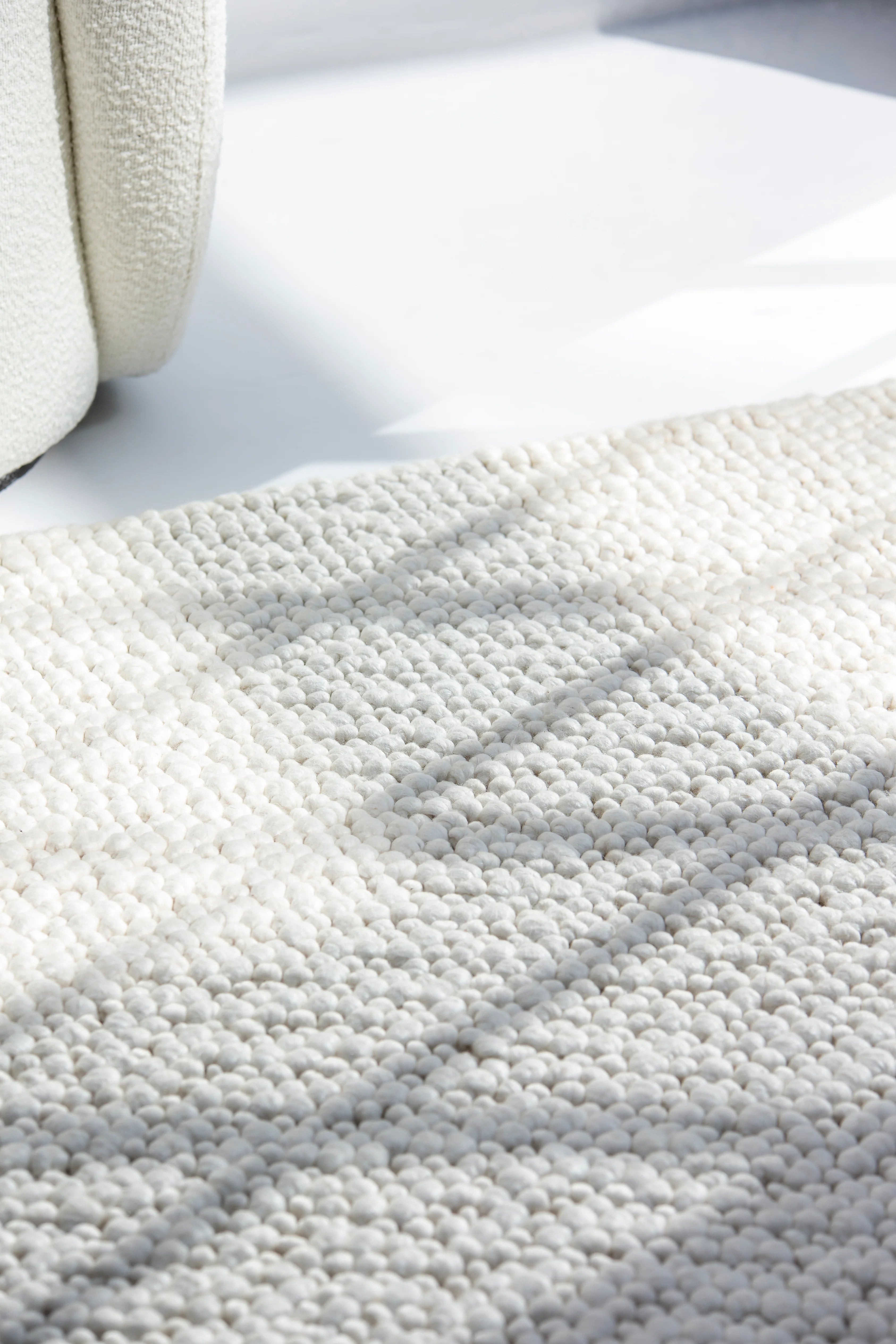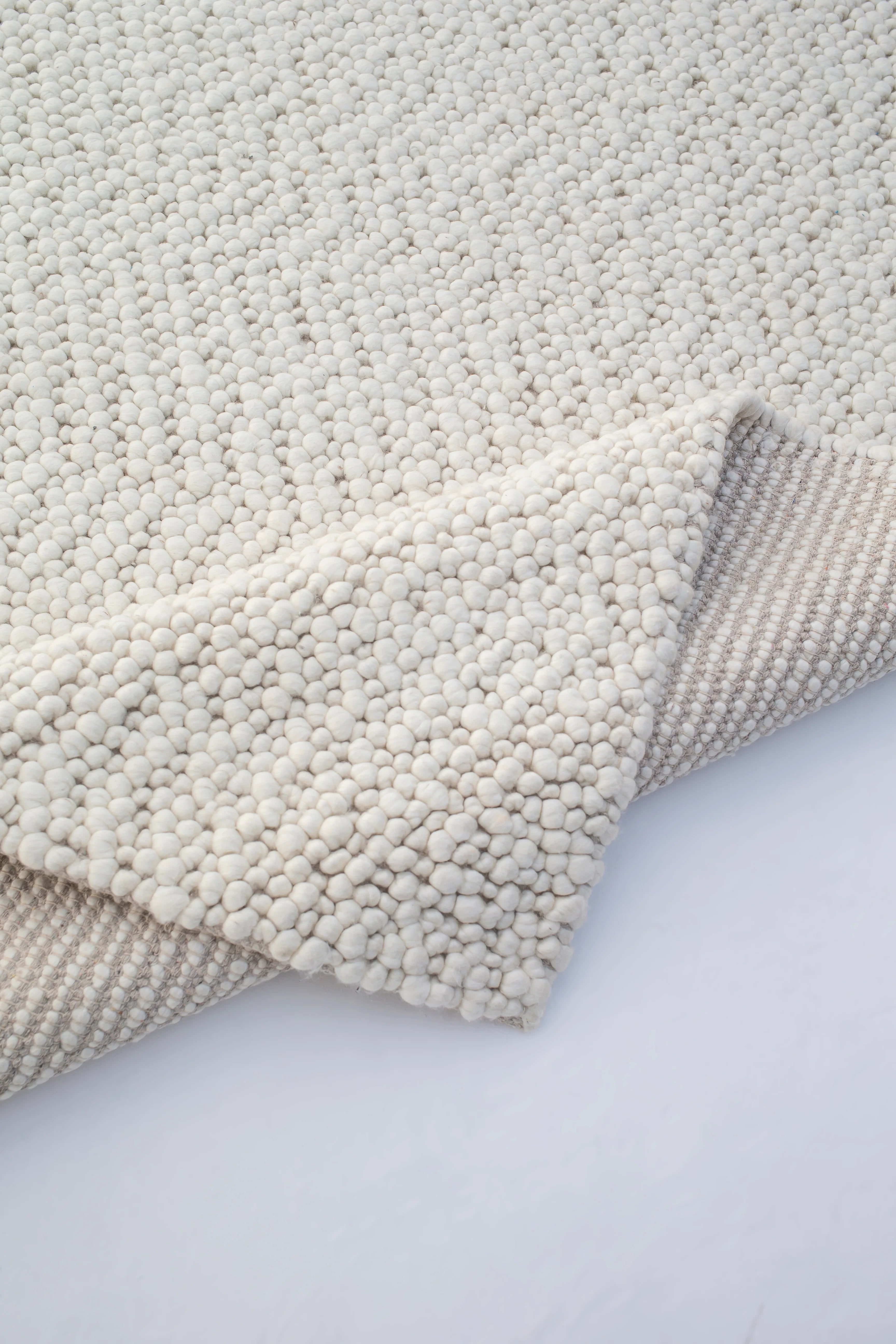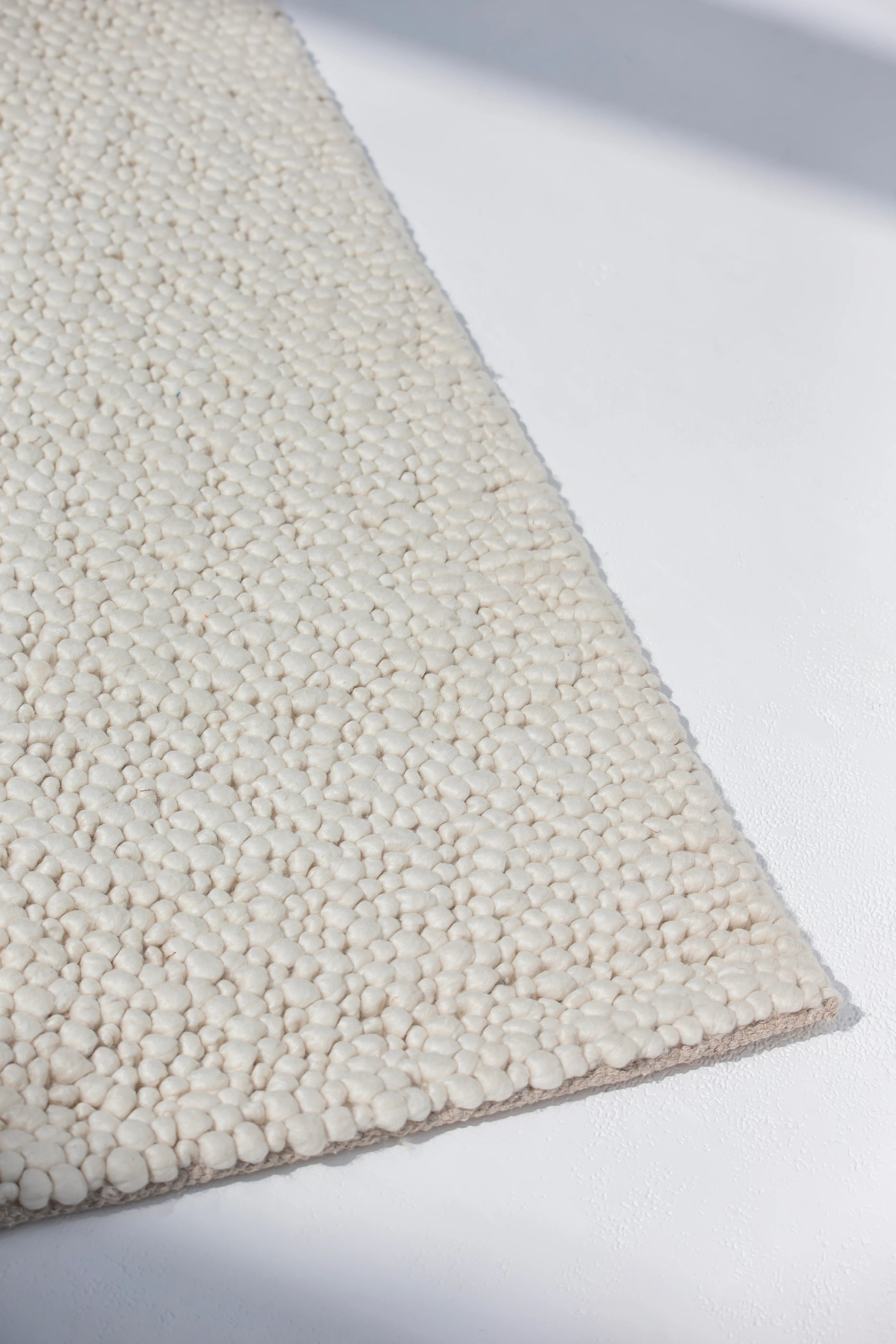 This woven rug, crafted mainly from premium New Zealand wool and cotton, offers a soft, off-white tone with a boucle-inspired texture. Designed to bring understated elegance, its expertly woven construction ensures both durability and a timeless aesthetic, perfect for elevating any space.