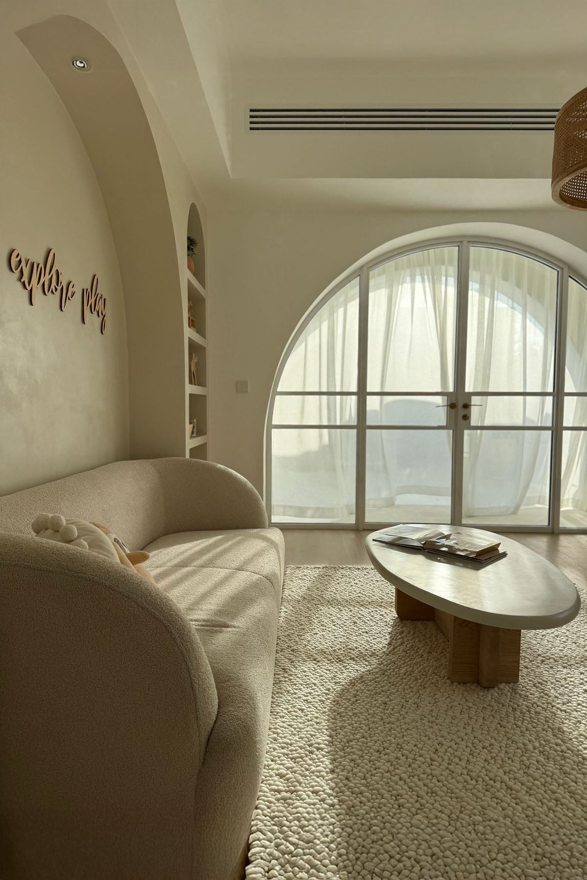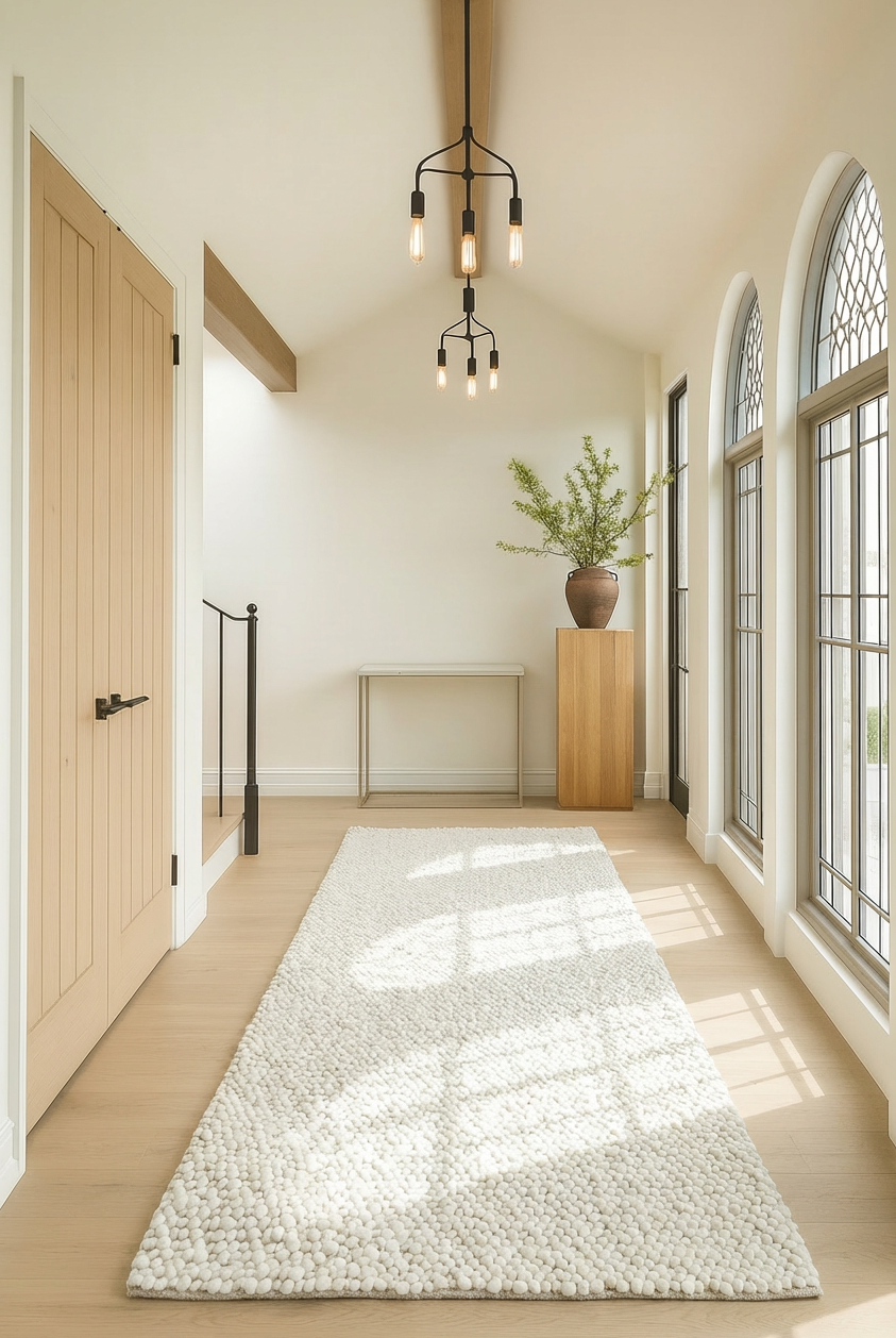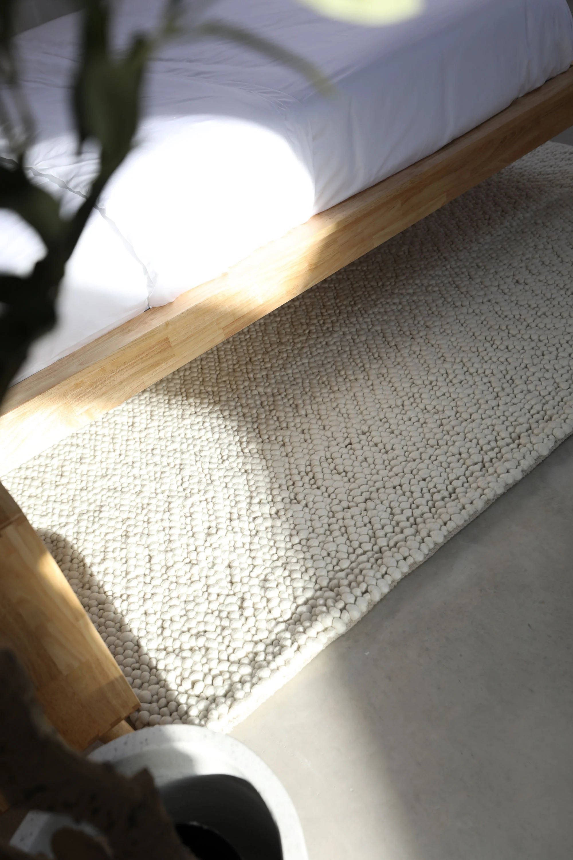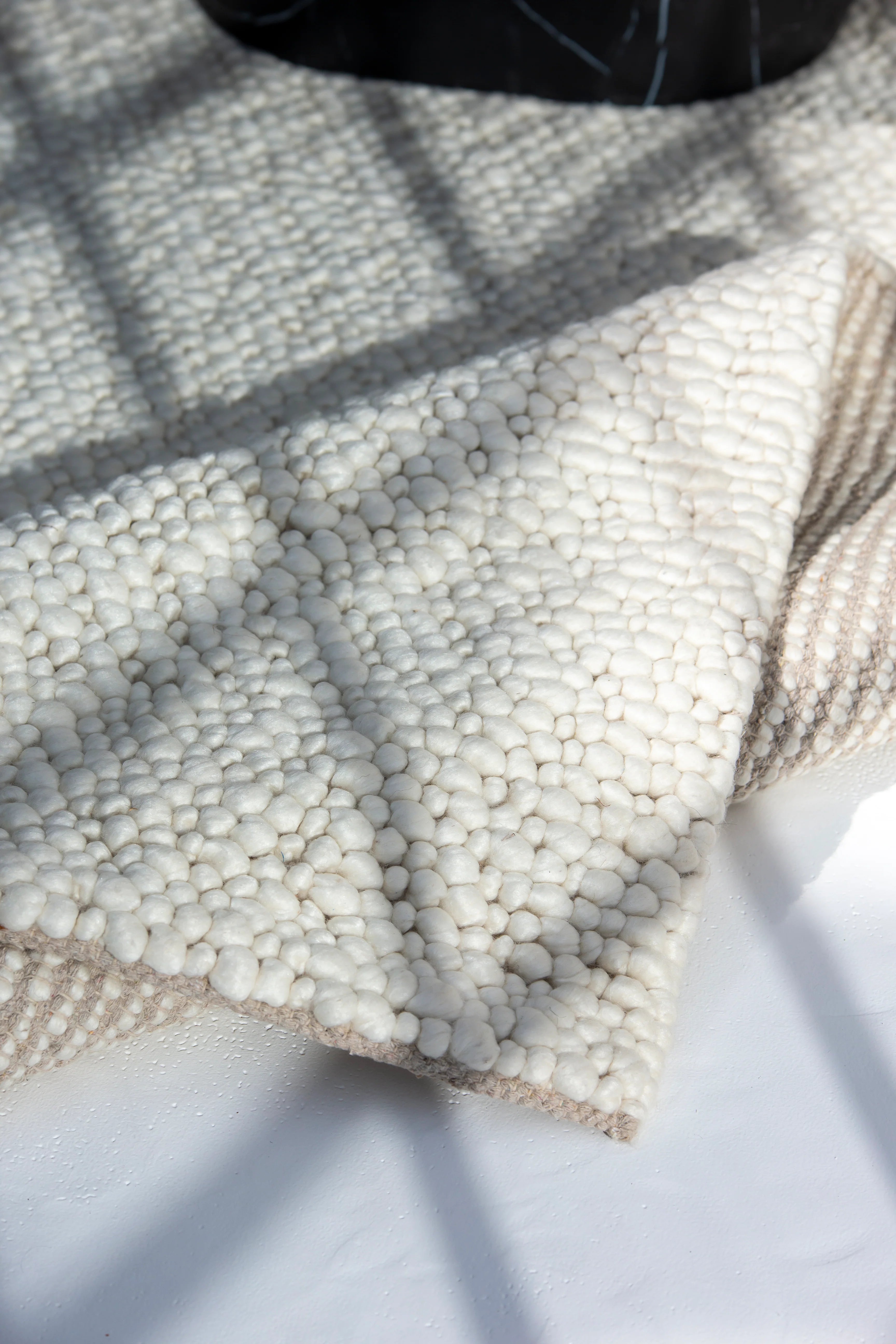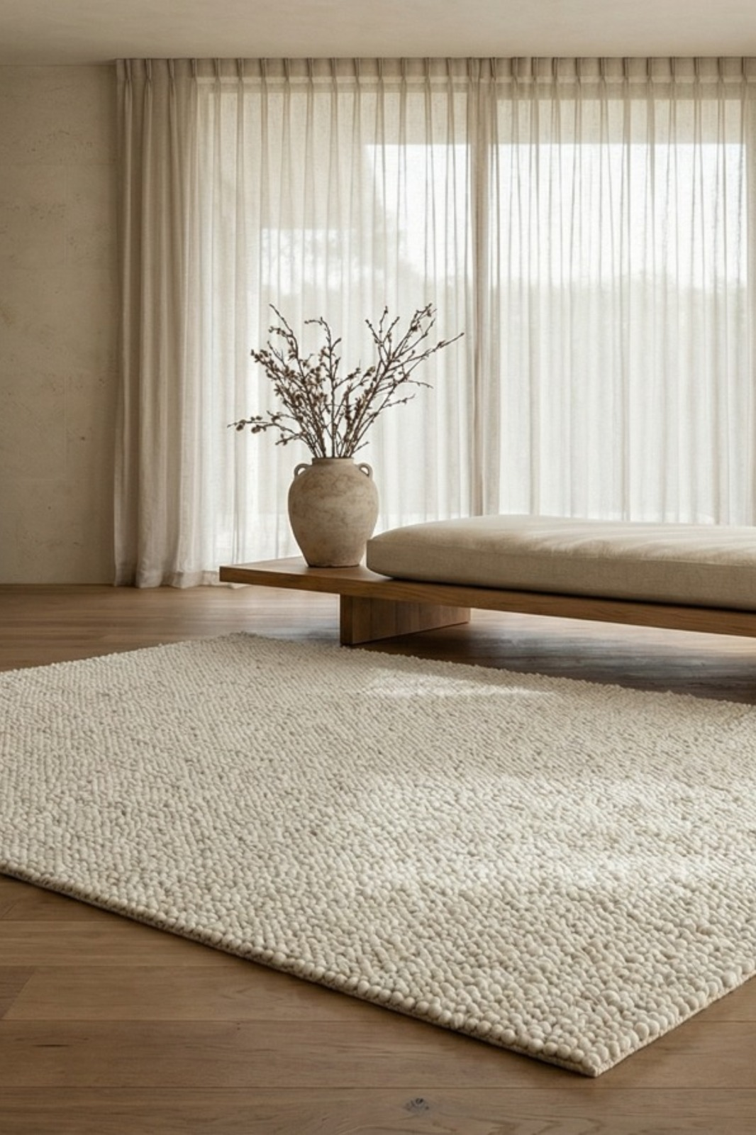 This woven rug, crafted mainly from premium New Zealand wool and cotton, offers a soft, off-white tone with a boucle-inspired texture. Designed to bring understated elegance, its expertly woven construction ensures both durability and a timeless aesthetic, perfect for elevating any space.