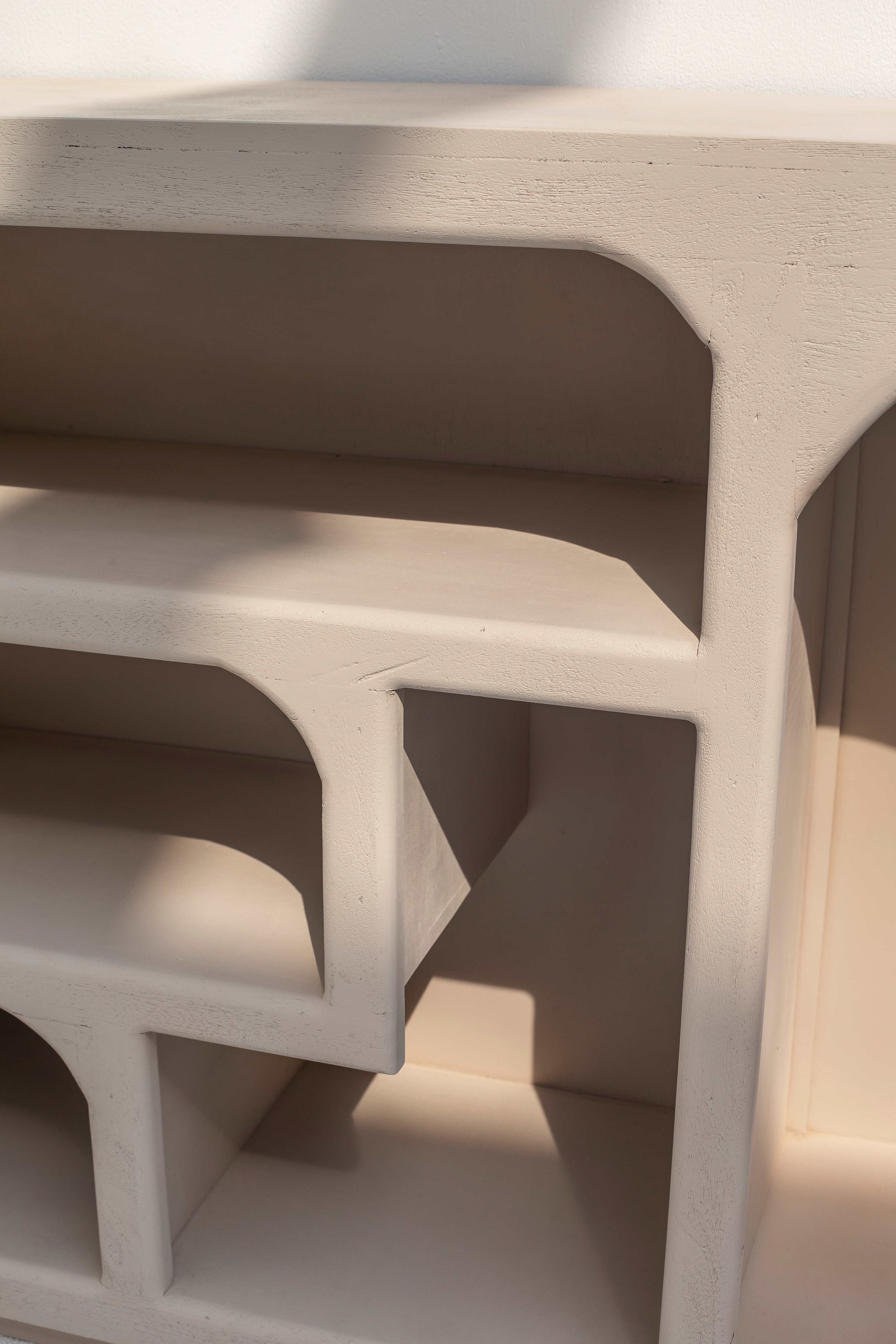 This Display Console redefines modern storage with its artistic design and painted mango wood finish. Its intricate open shelving, marked by asymmetrical arches and geometric shapes, blends functionality with sculptural beauty. The soft neutral tones of the painted mango wood harmonize with various decor styles, from minimalist to contemporary. Its textured surface adds depth, while the robust structure ensures durability. Perfect as a display unit for books, vases, or art pieces, this console transforms living spaces with its balance of form and function.