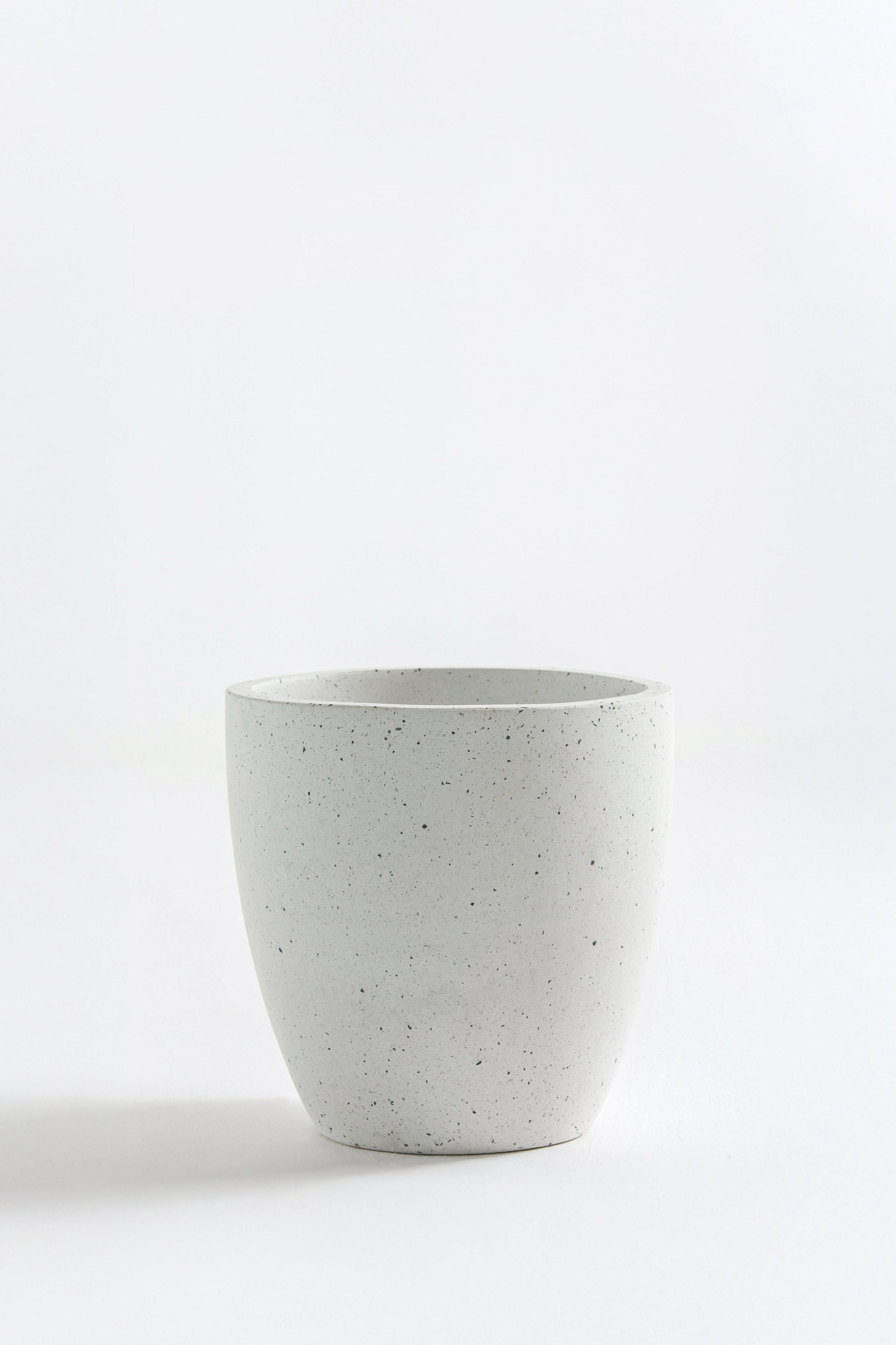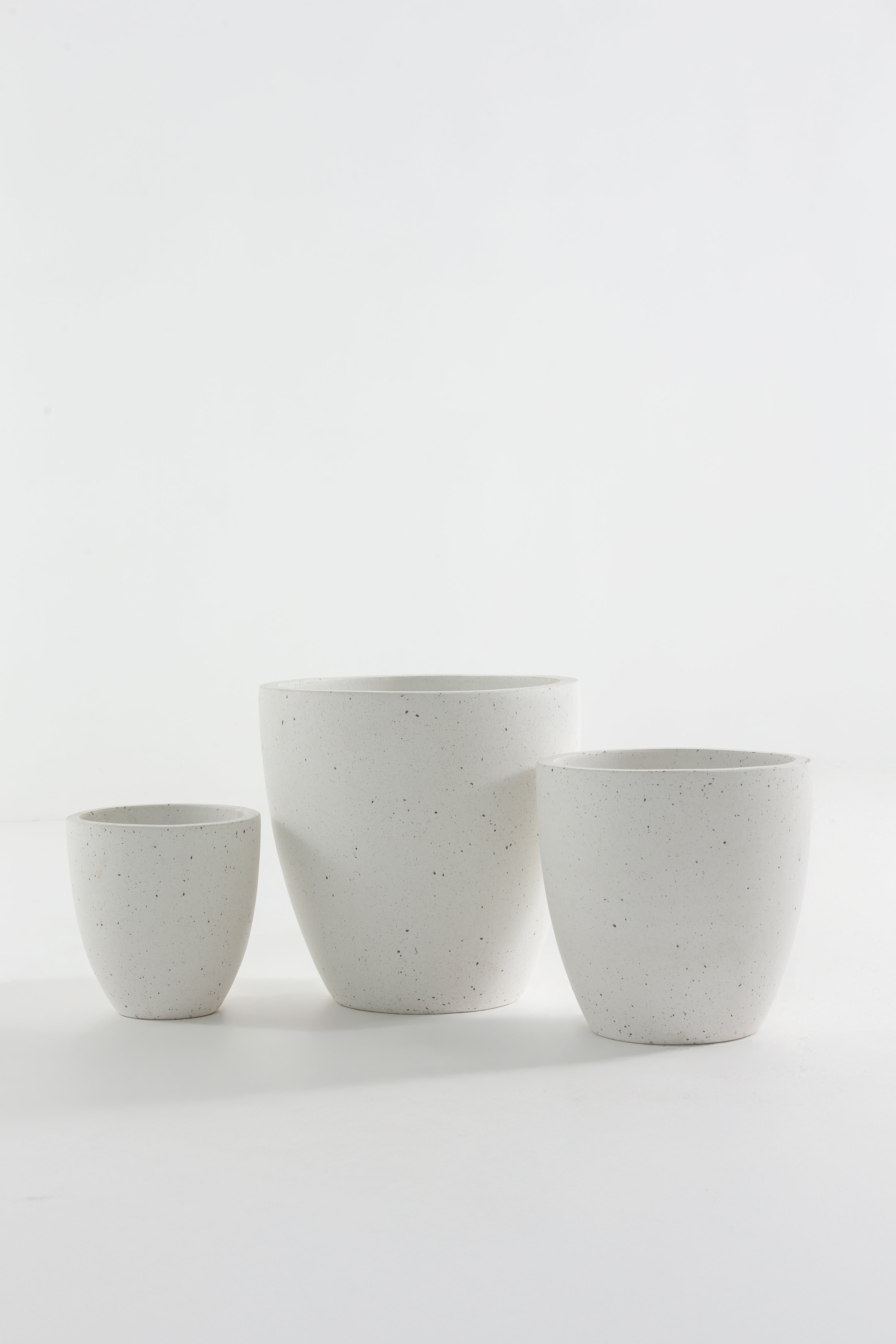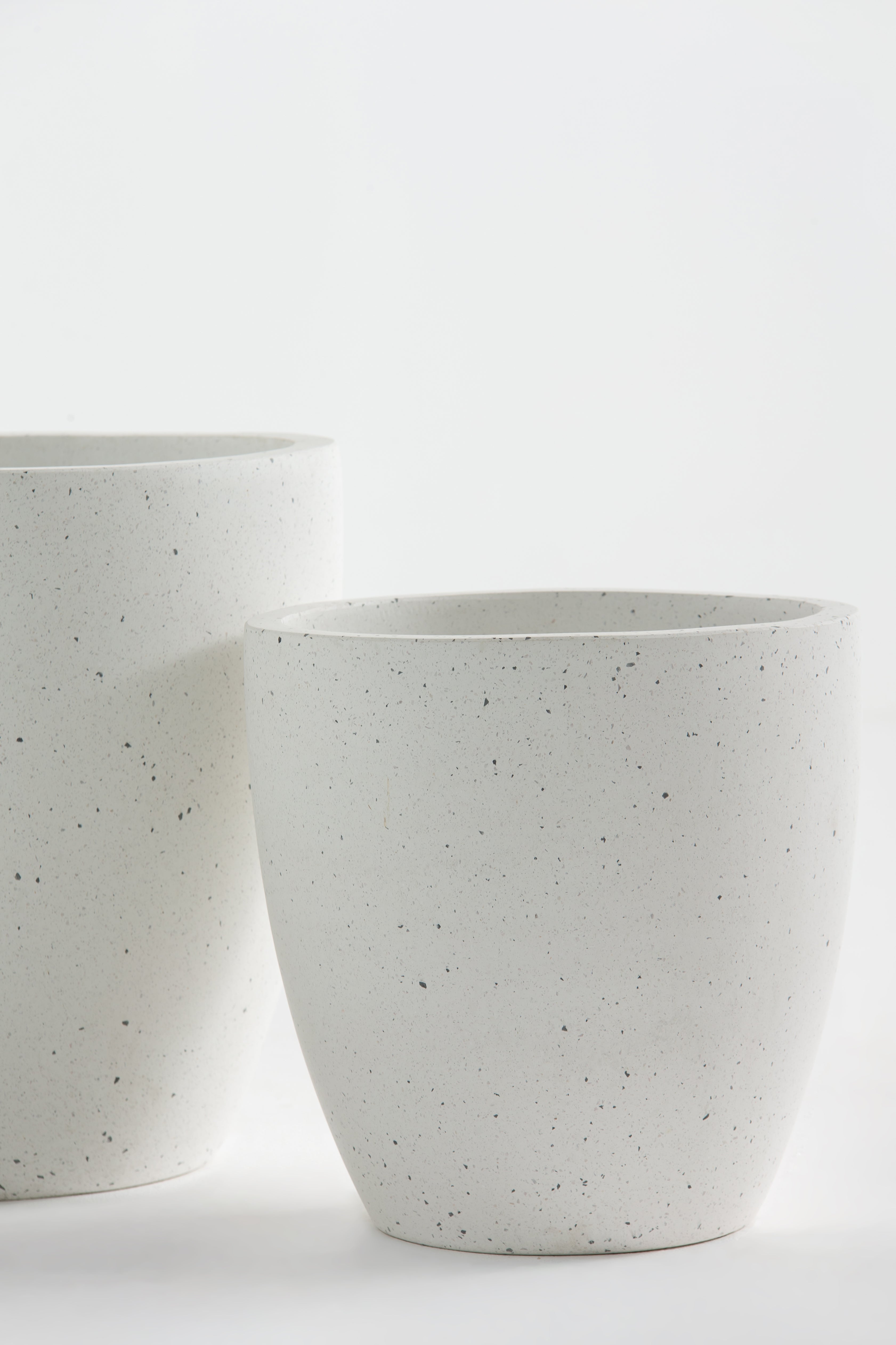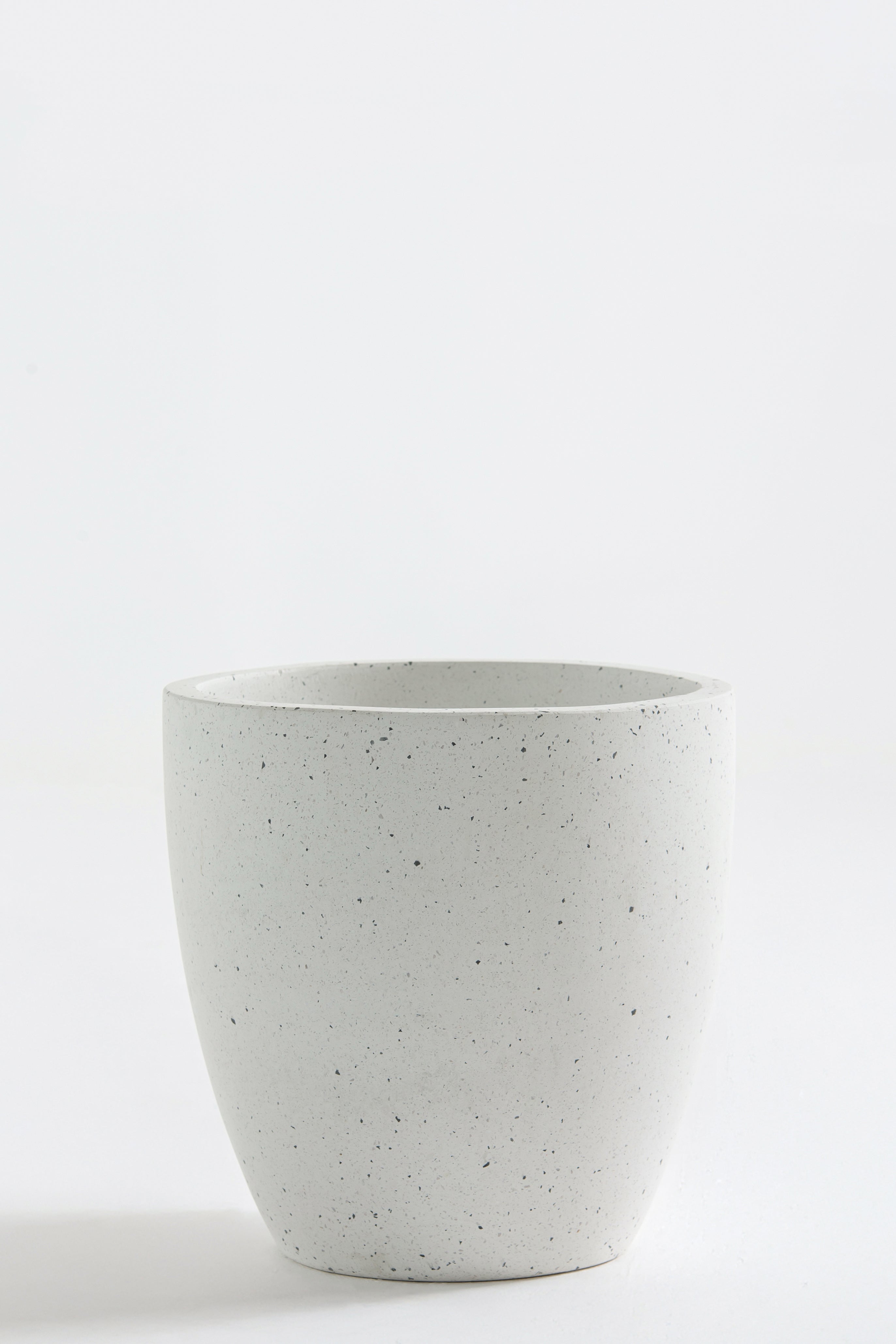 Elevate plant styling with these terrazzo-finished concrete pots, designed to blend organic texture with contemporary polish. Featuring a speckled surface and gently tapered cylindrical form, each piece balances simplicity with visual character. The light-toned base dotted with dark aggregates adds subtle contrast, making these pots ideal for neutral interiors, Scandinavian spaces, or modern patios. Available in three sizes, they offer flexible styling for everything from succulents to statement foliage. Their durable material and understated charm make them both decorative and functional for everyday use.