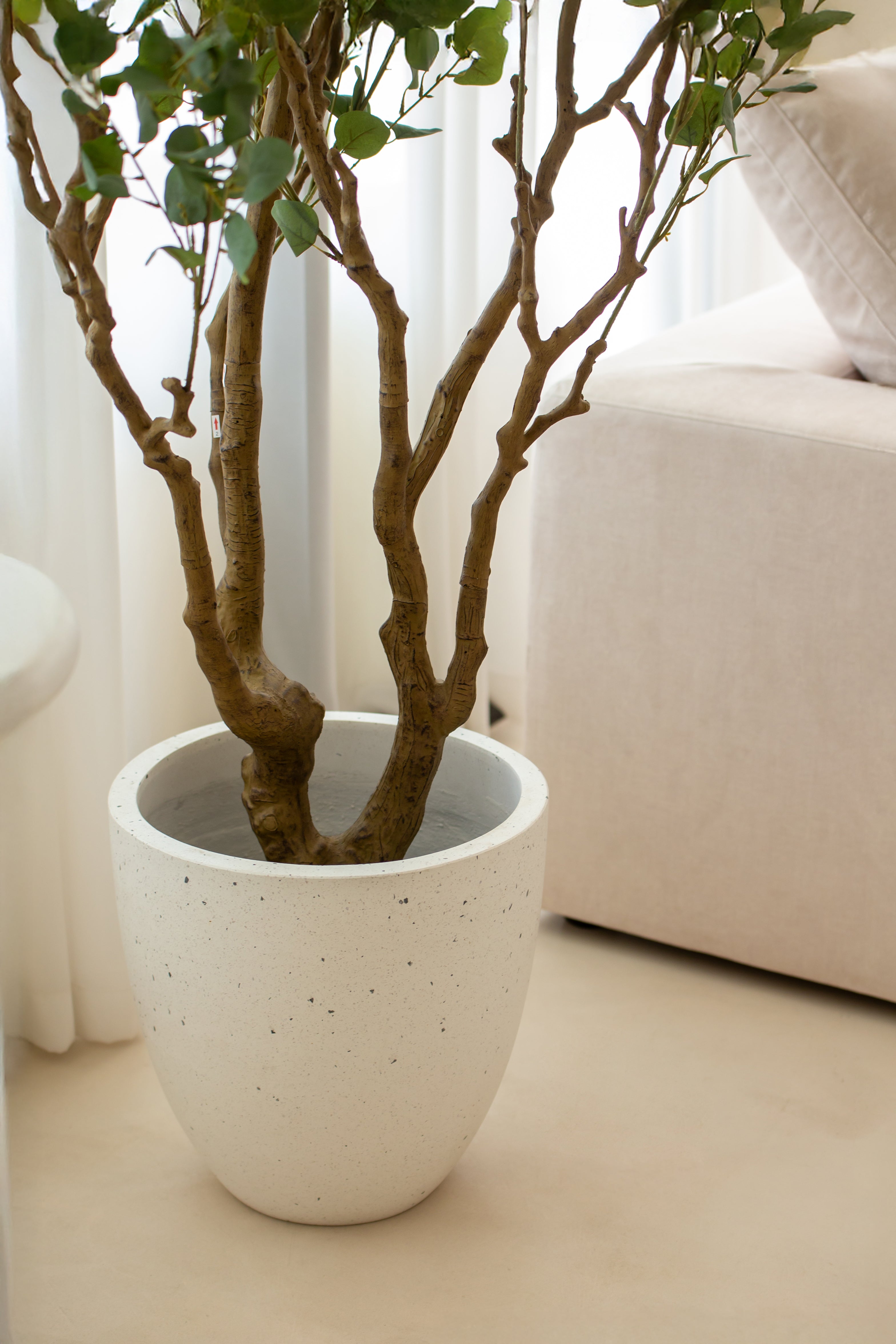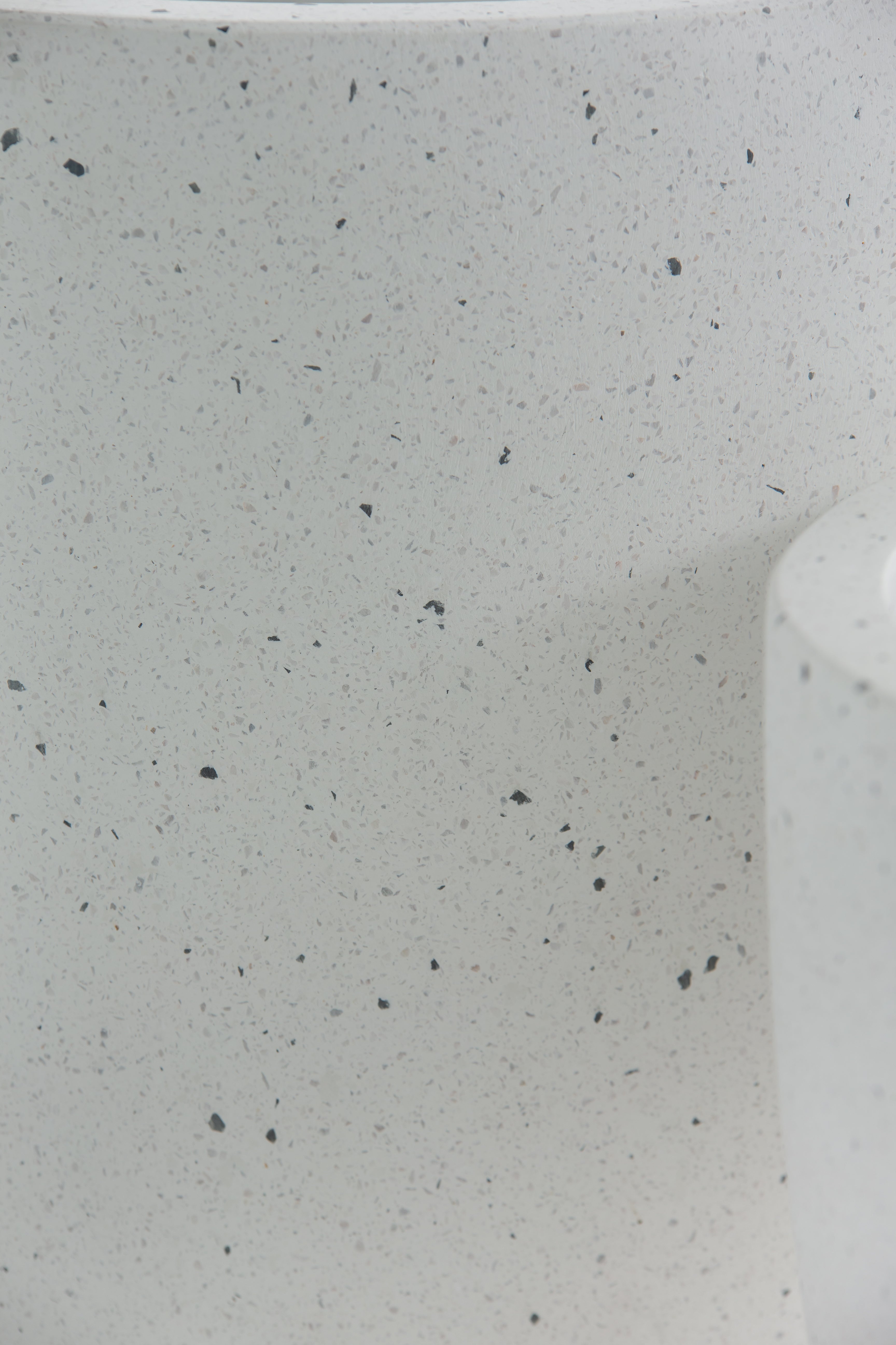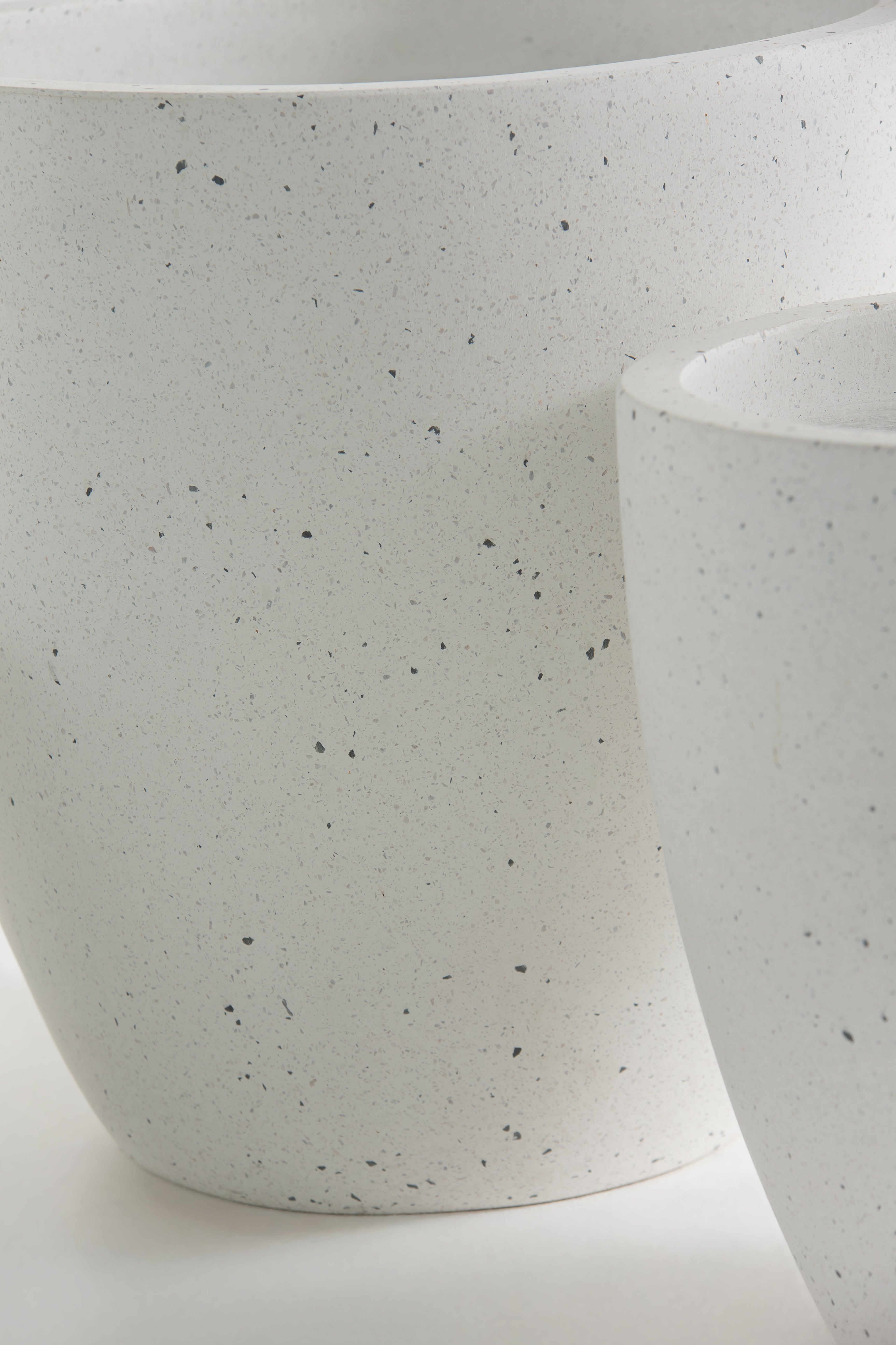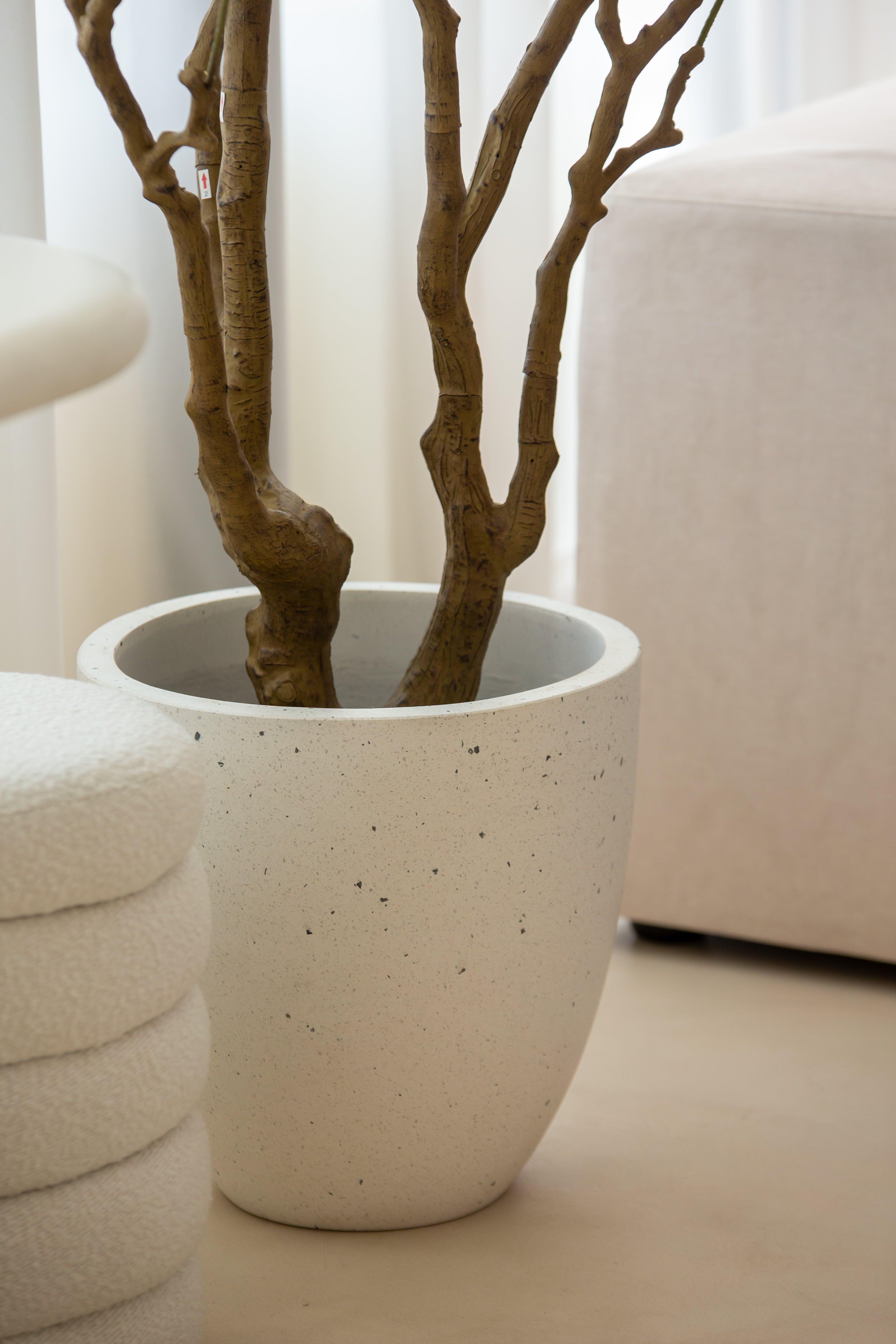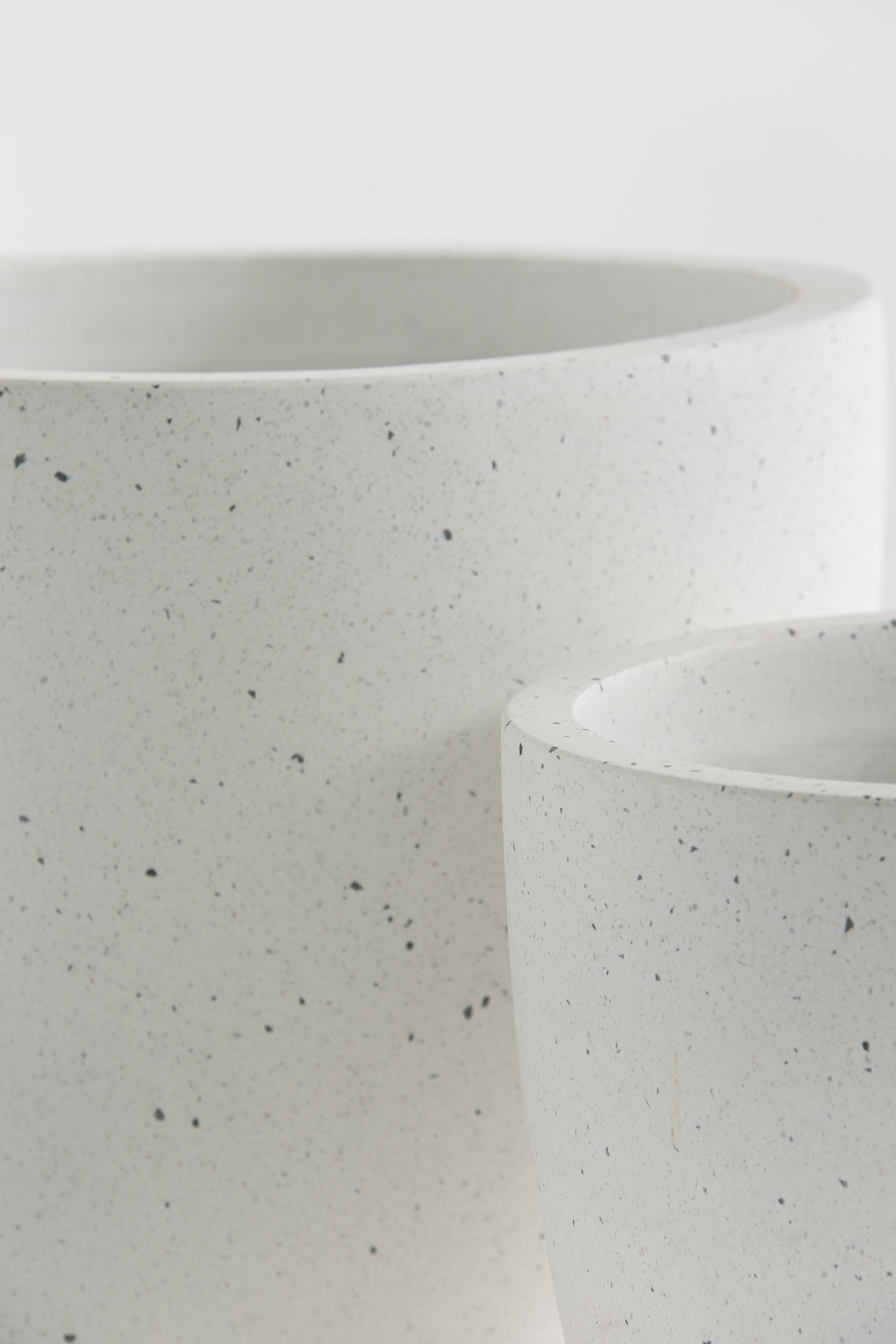 Elevate plant styling with these terrazzo-finished concrete pots, designed to blend organic texture with contemporary polish. Featuring a speckled surface and gently tapered cylindrical form, each piece balances simplicity with visual character. The light-toned base dotted with dark aggregates adds subtle contrast, making these pots ideal for neutral interiors, Scandinavian spaces, or modern patios. Available in three sizes, they offer flexible styling for everything from succulents to statement foliage. Their durable material and understated charm make them both decorative and functional for everyday use.