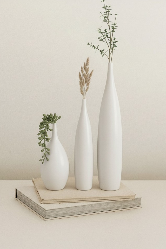 This set features three sculptural vases designed with elongated, streamlined forms and a matte white finish. Each vase varies in height and profile, including one with a rounded teardrop body and two with tall, tapered silhouettes. The narrow necks and slim openings are suitable for single stems or minimalist arrangements. The smooth surface and clean contours give the set a balanced, contemporary appearance, making it suitable for both standalone display and grouped arrangement in modern interior settings.