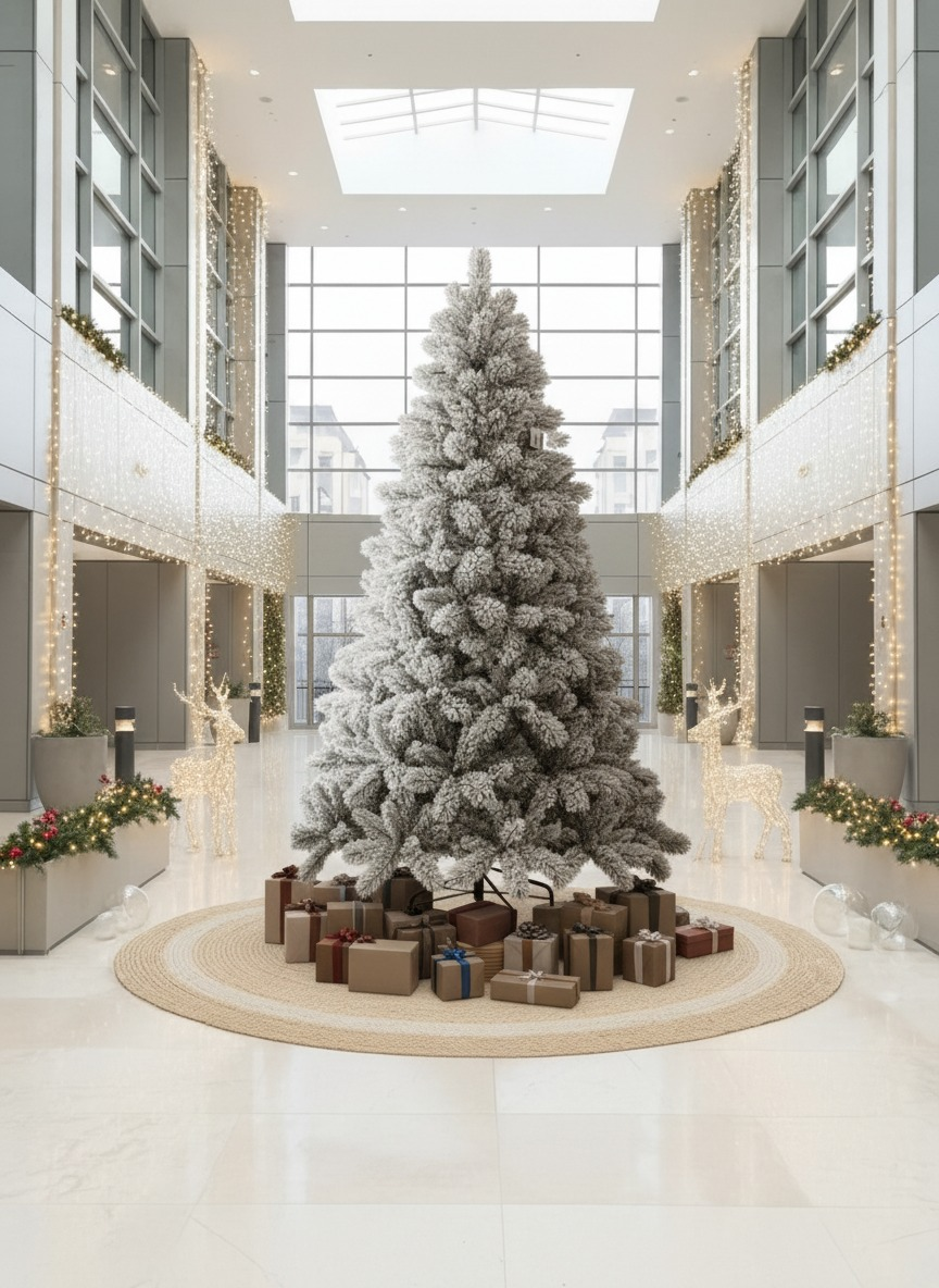 Create a wintry focal point with this flocked white artificial Christmas tree. Thick, layered branches carry soft snow effects for a calm, frosted look that showcases ornaments and lights beautifully. The full profile feels lush yet tidy, with sturdy tips that keep decorations secure and spacing even. Choose XL heights to suit grand rooms and airy lobbies; its quiet tone complements metallic baubles, warm string lights, and neutral decor for a serene festive scene.