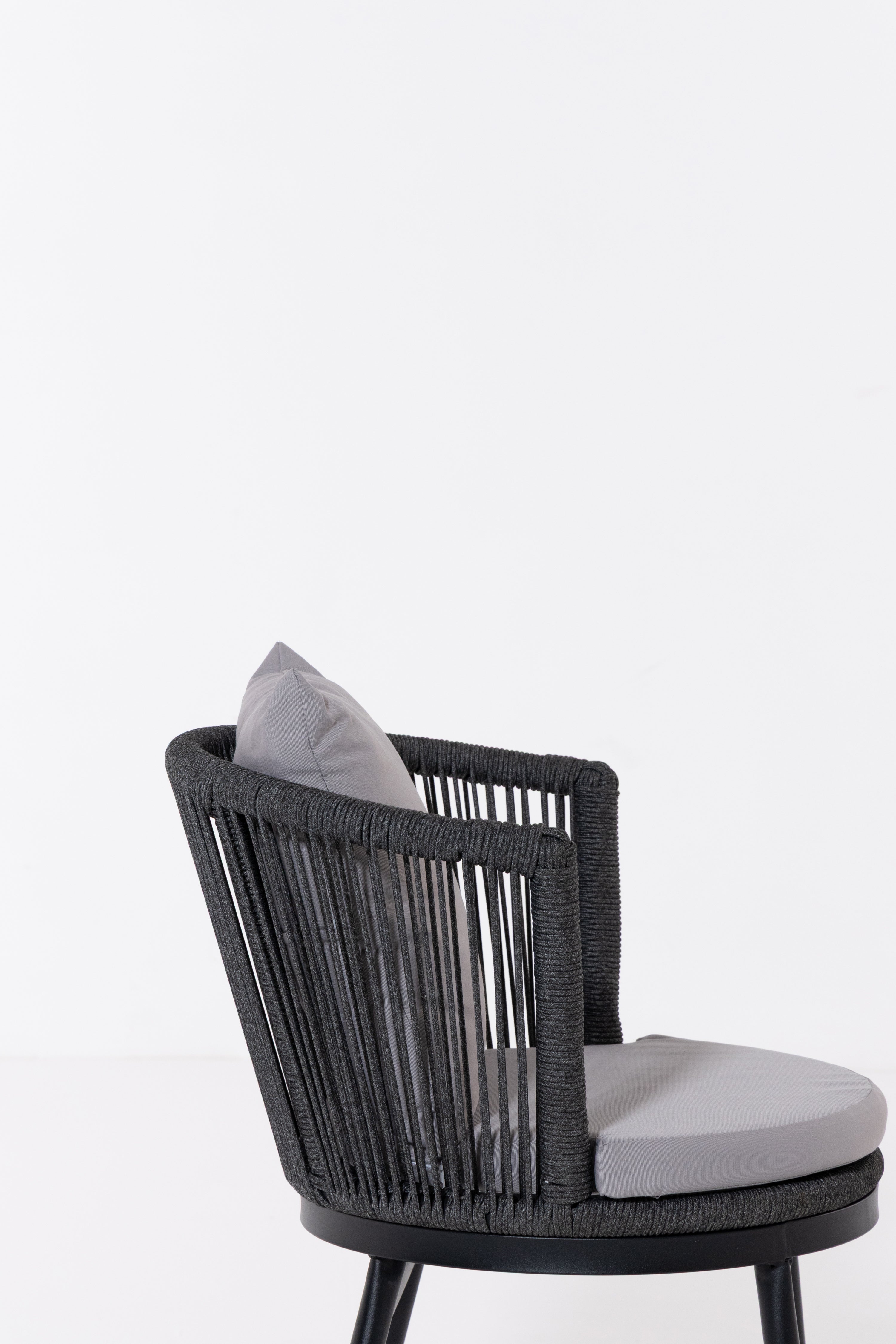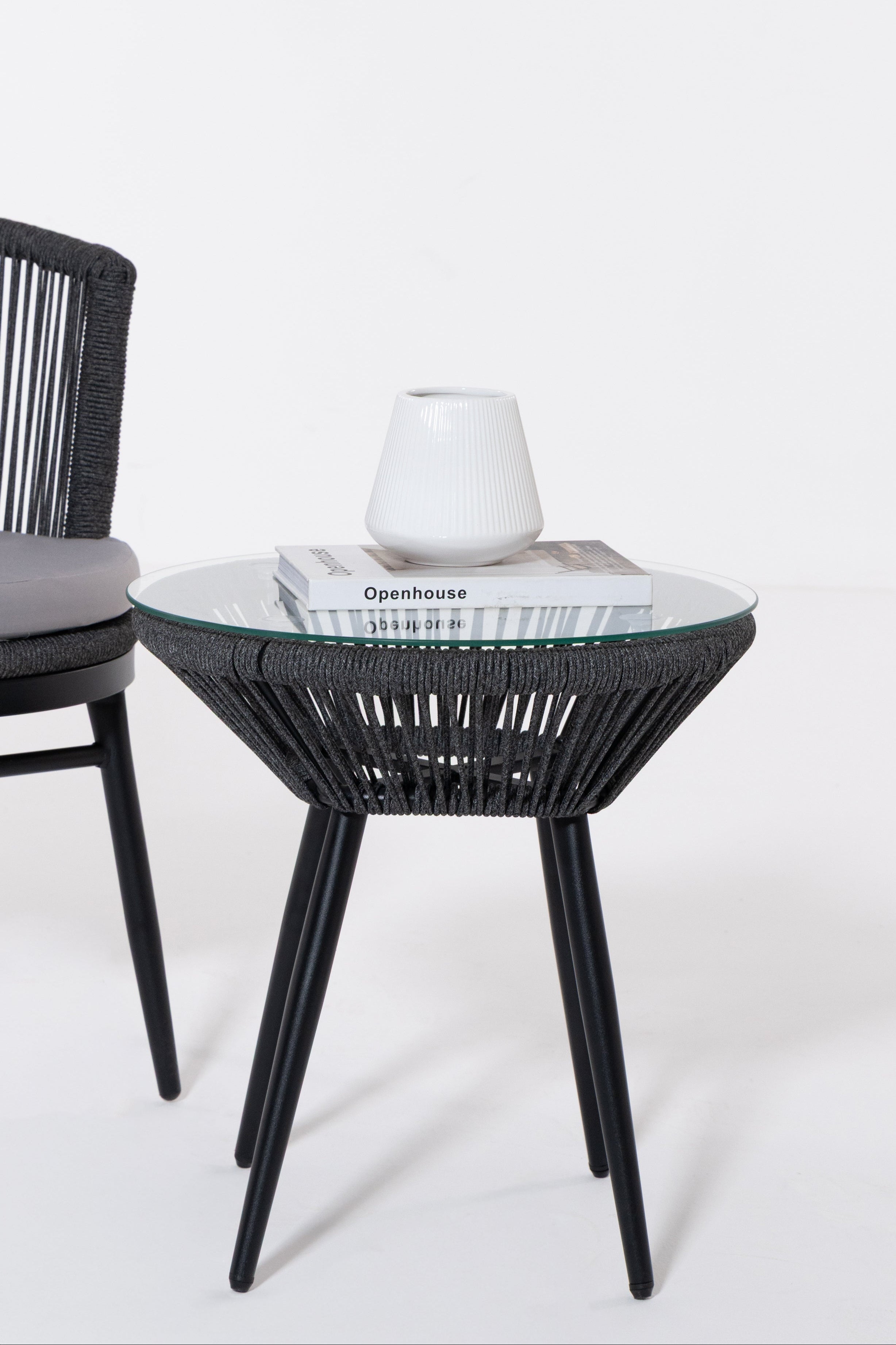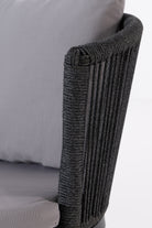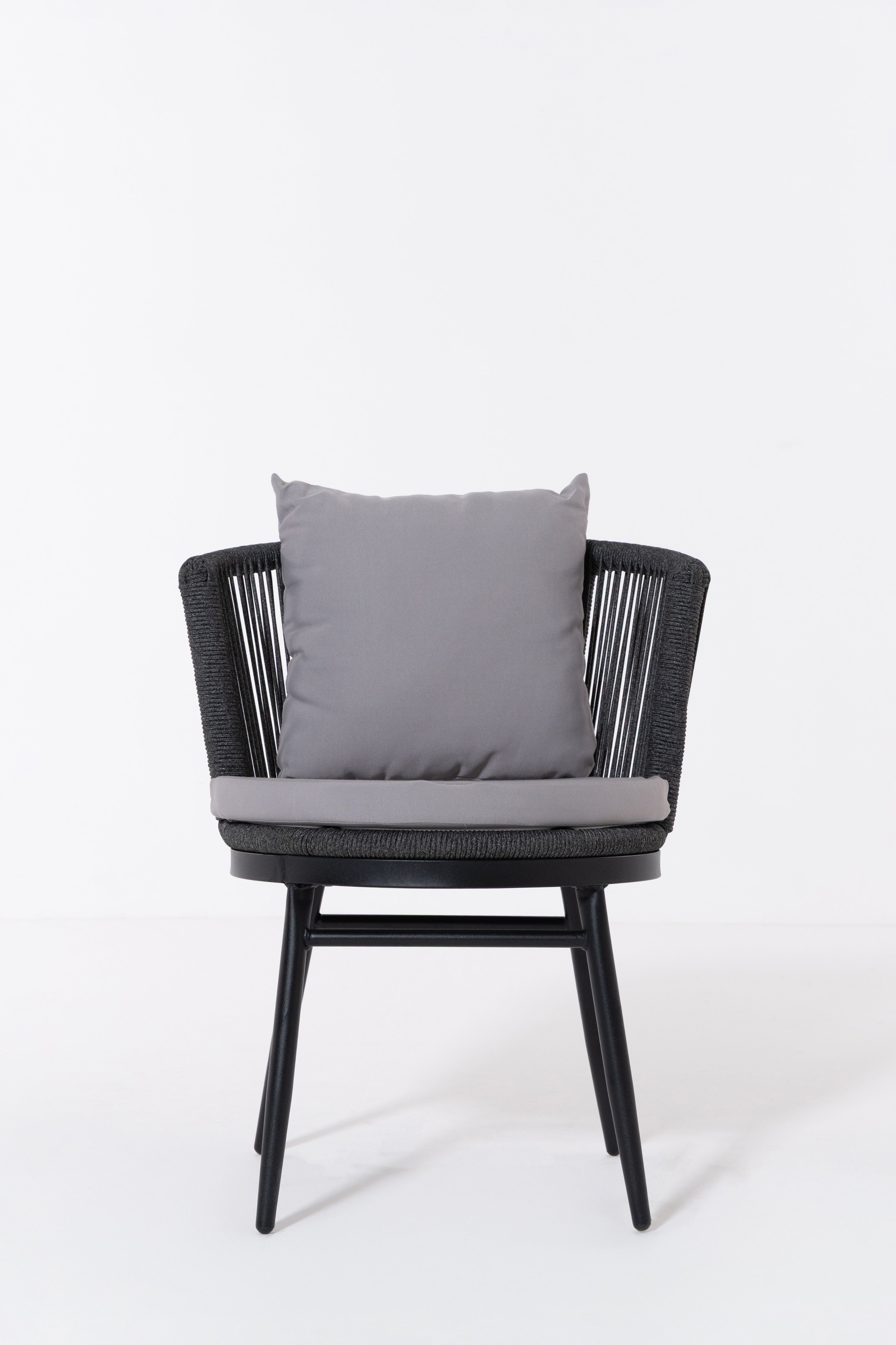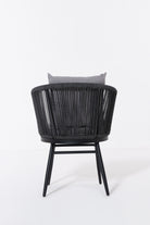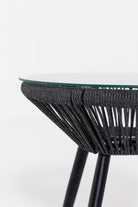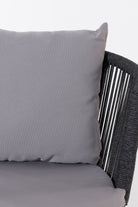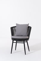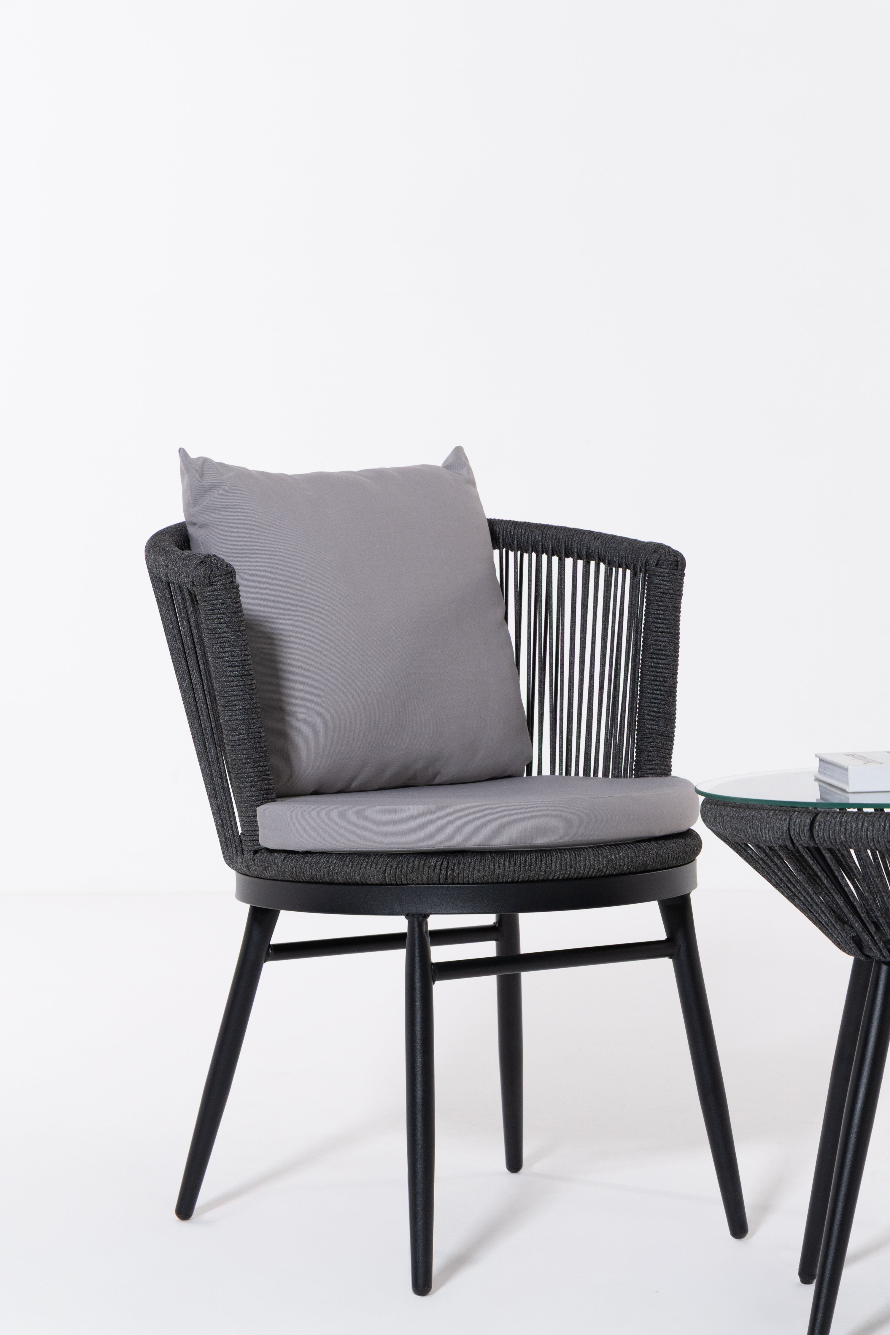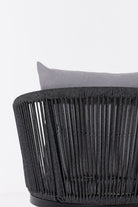 Create a serene outdoor oasis with the Zaira outdoor Lounge Set. This chic set features a sleek black metal frame chair, wrapped in intricately woven rope for a contemporary aesthetic. Complementing it is a matching table with a minimalist round glass top. The set’s elegant monochrome design and contrasting plush cushions offer both luxury and comfort, perfect for relaxing al fresco moments.