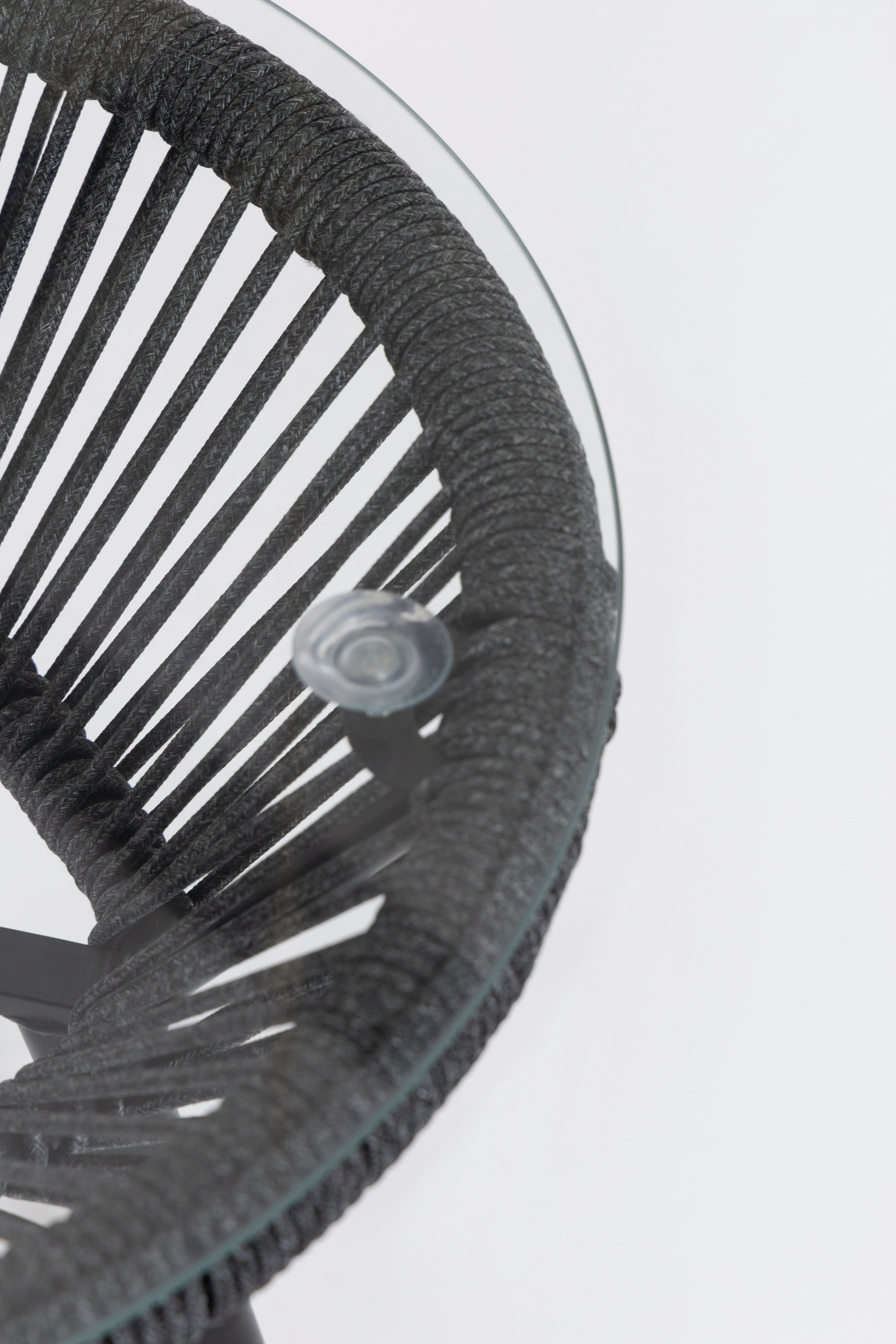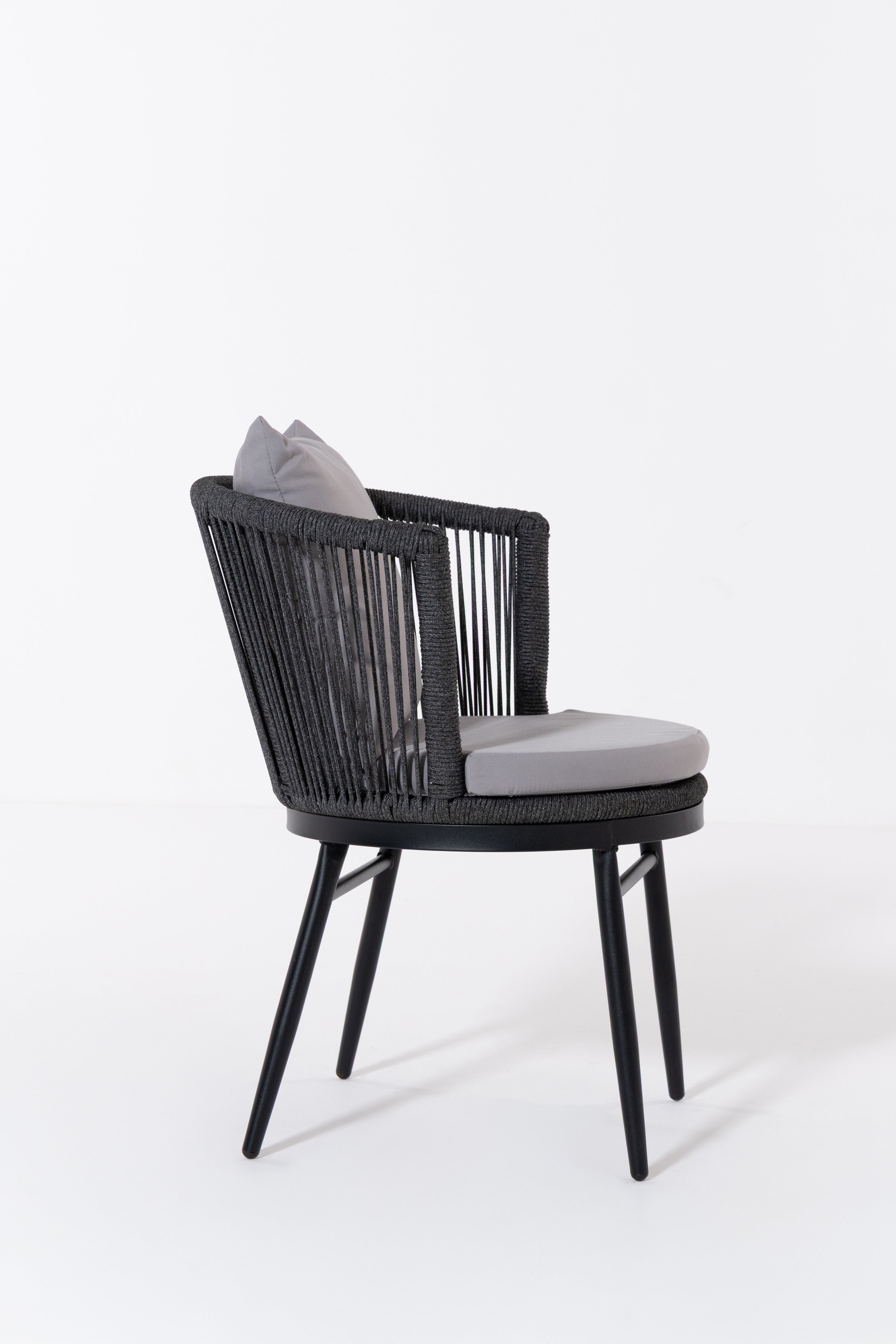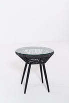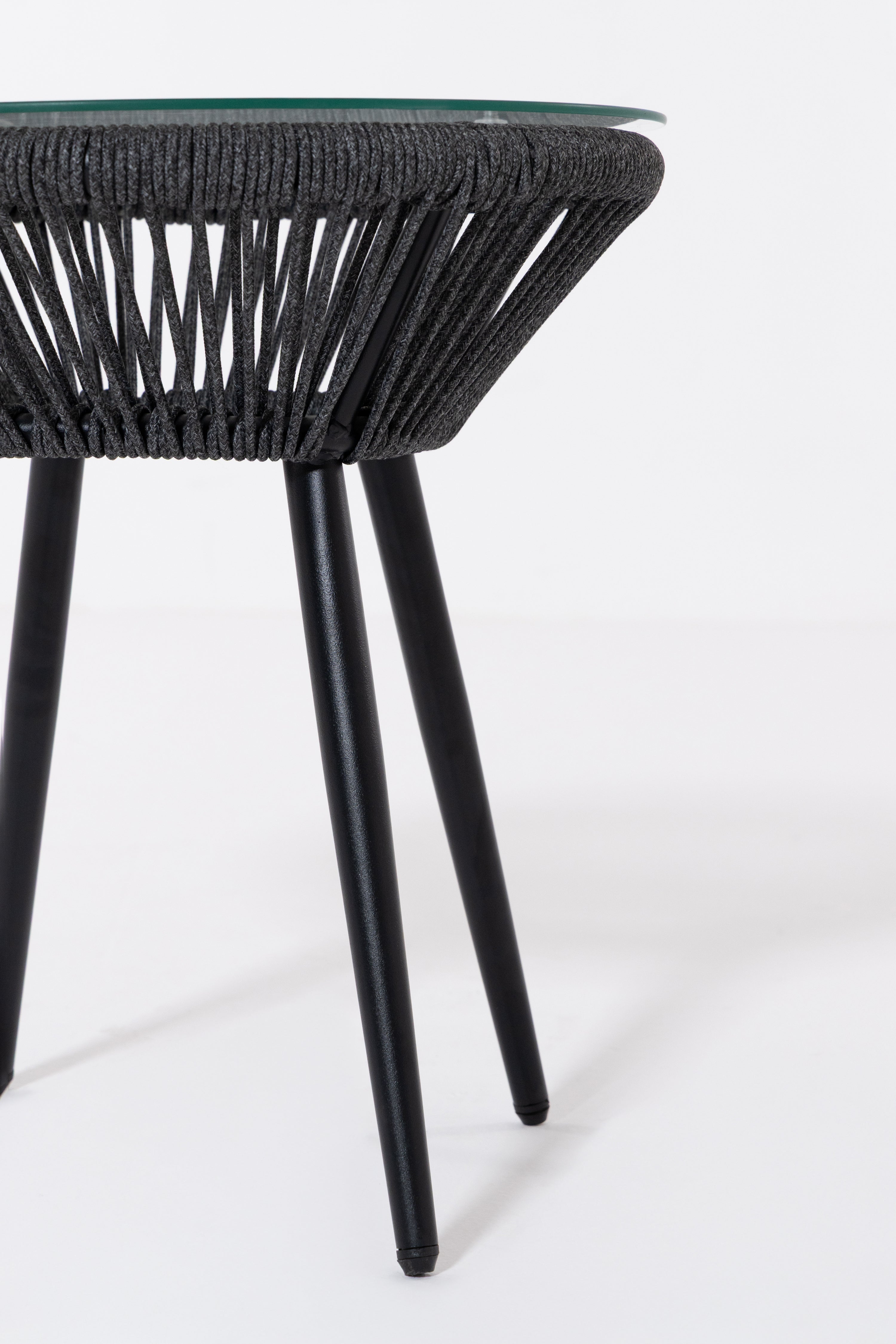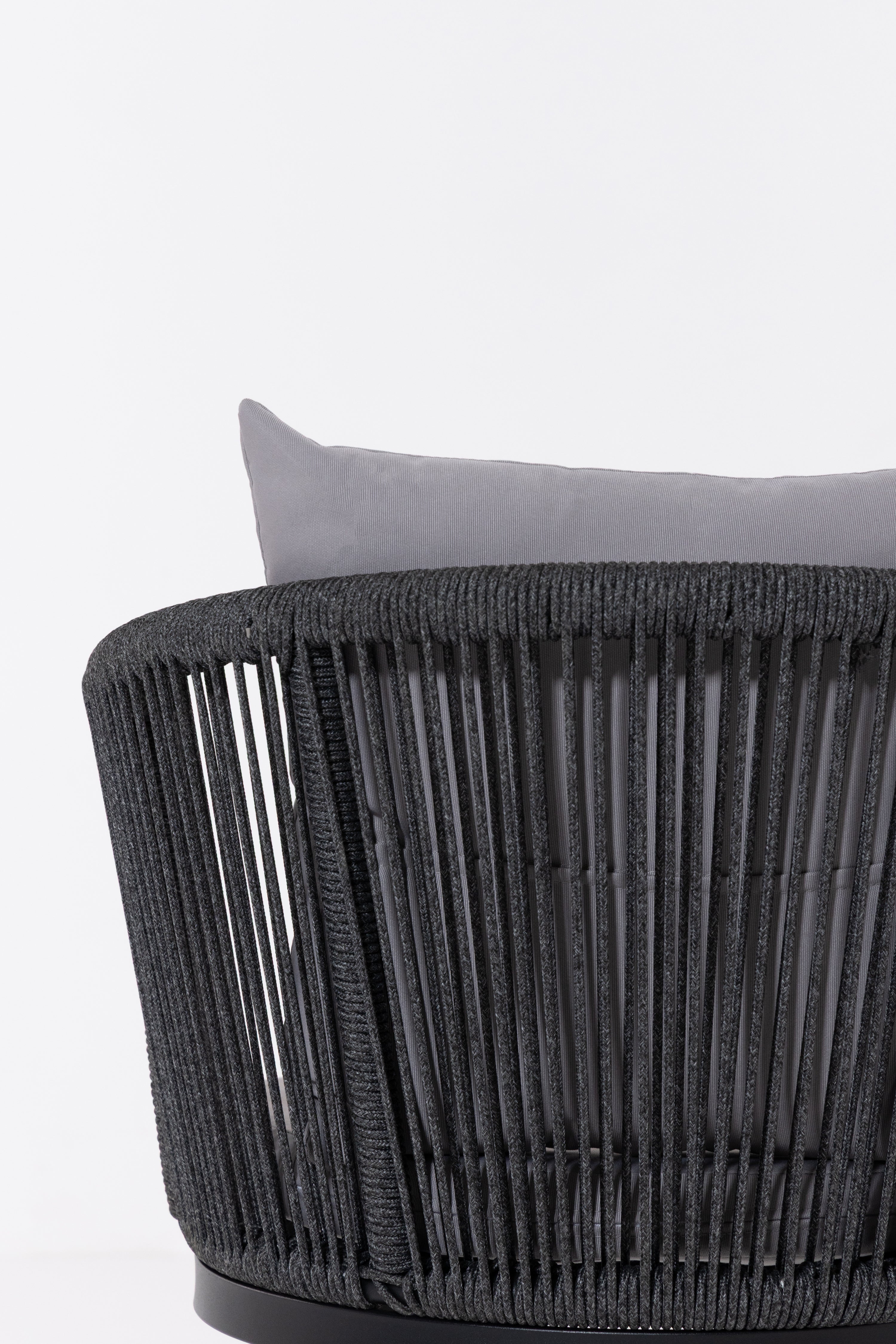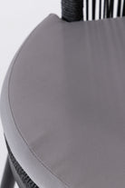Create a serene outdoor oasis with the Zaira outdoor Lounge Set. This chic set features a sleek black metal frame chair, wrapped in intricately woven rope for a contemporary aesthetic. Complementing it is a matching table with a minimalist round glass top. The set’s elegant monochrome design and contrasting plush cushions offer both luxury and comfort, perfect for relaxing al fresco moments.