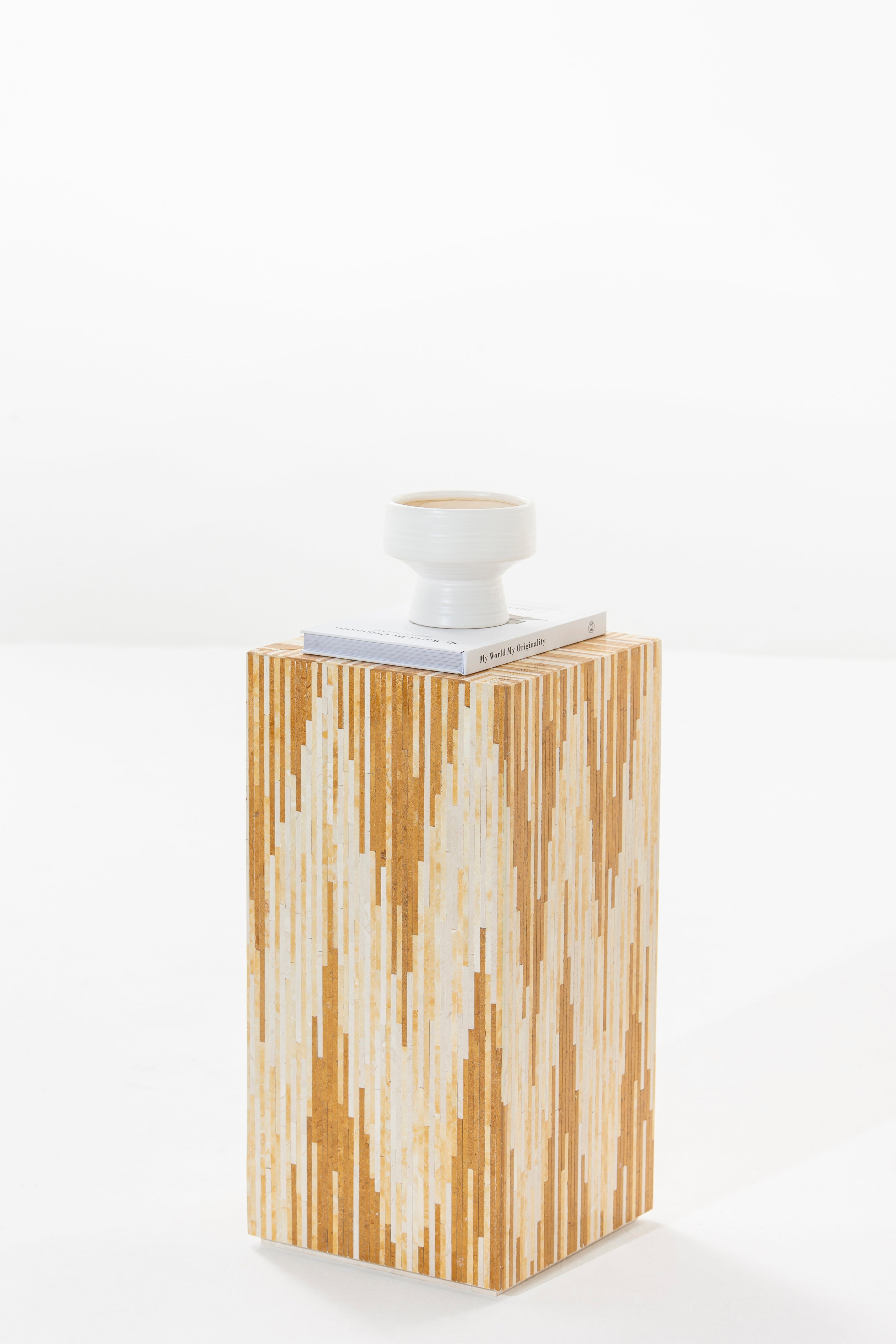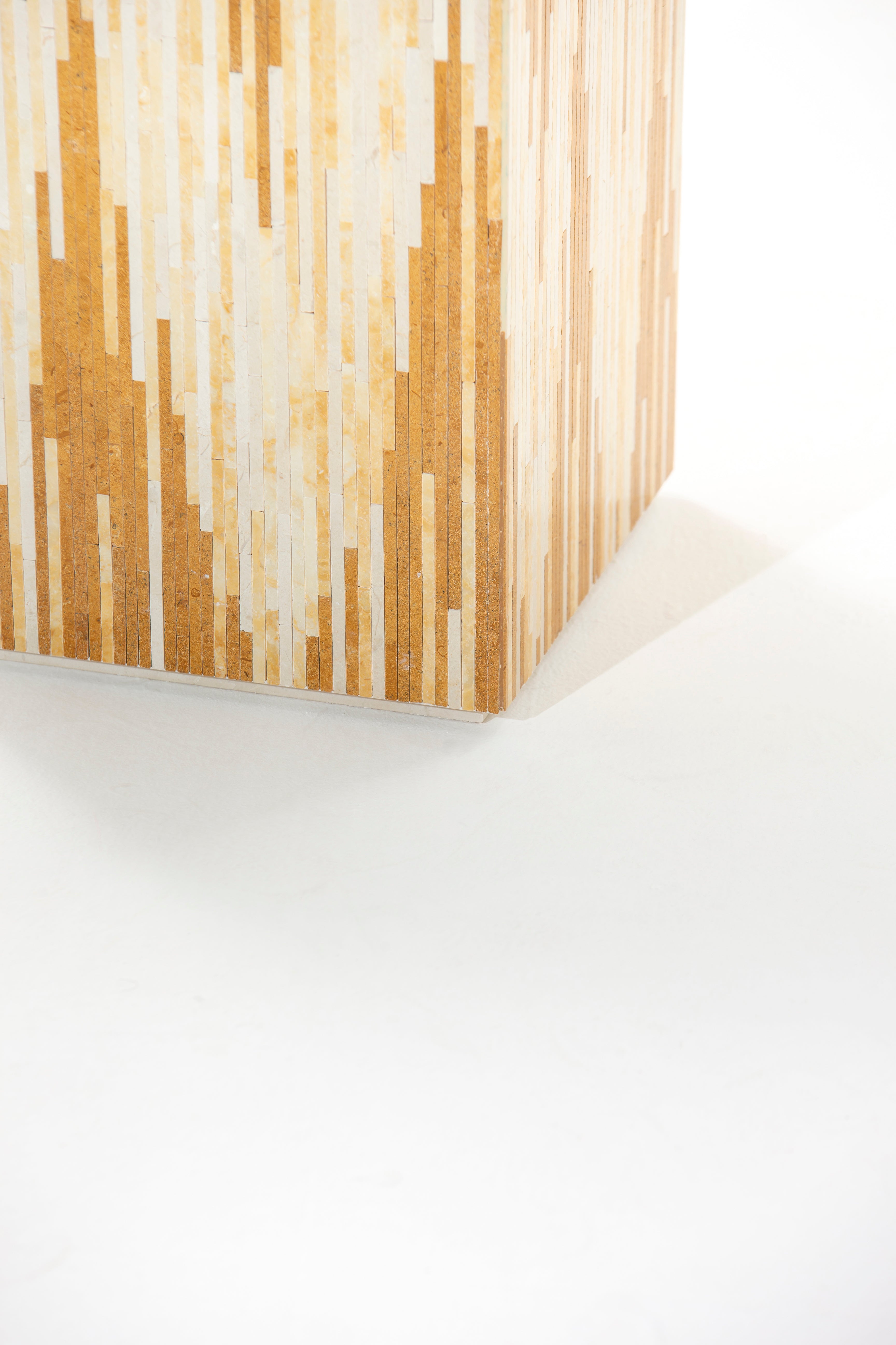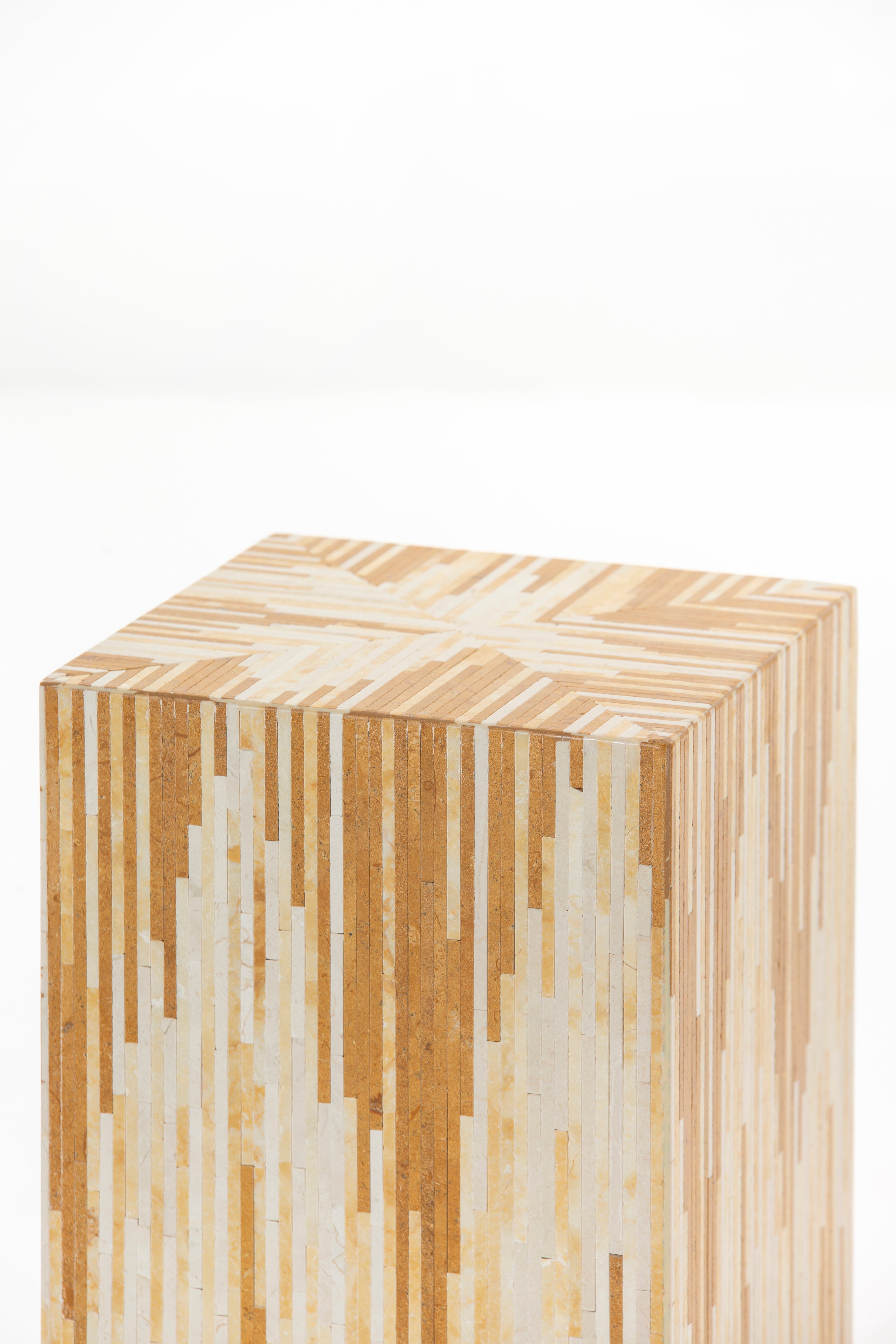 This striking rectangular pedestal, designed to be the centerpiece of your modern aesthetic, features an intricate mosaic of meticulously arranged marble tiles. The design showcases a captivating linear abstract pattern, with vertical and diagonal lines in varying shades of light beige, cream, and brown, creating a dynamic visual texture that draws the eye. Its clean lines and natural color palette offer a versatile display solution for your cherished art pieces, sculptures, or even a vibrant plant, seamlessly integrating with your contemporary interior design and adding an understated yet powerful artistic statement to your space.