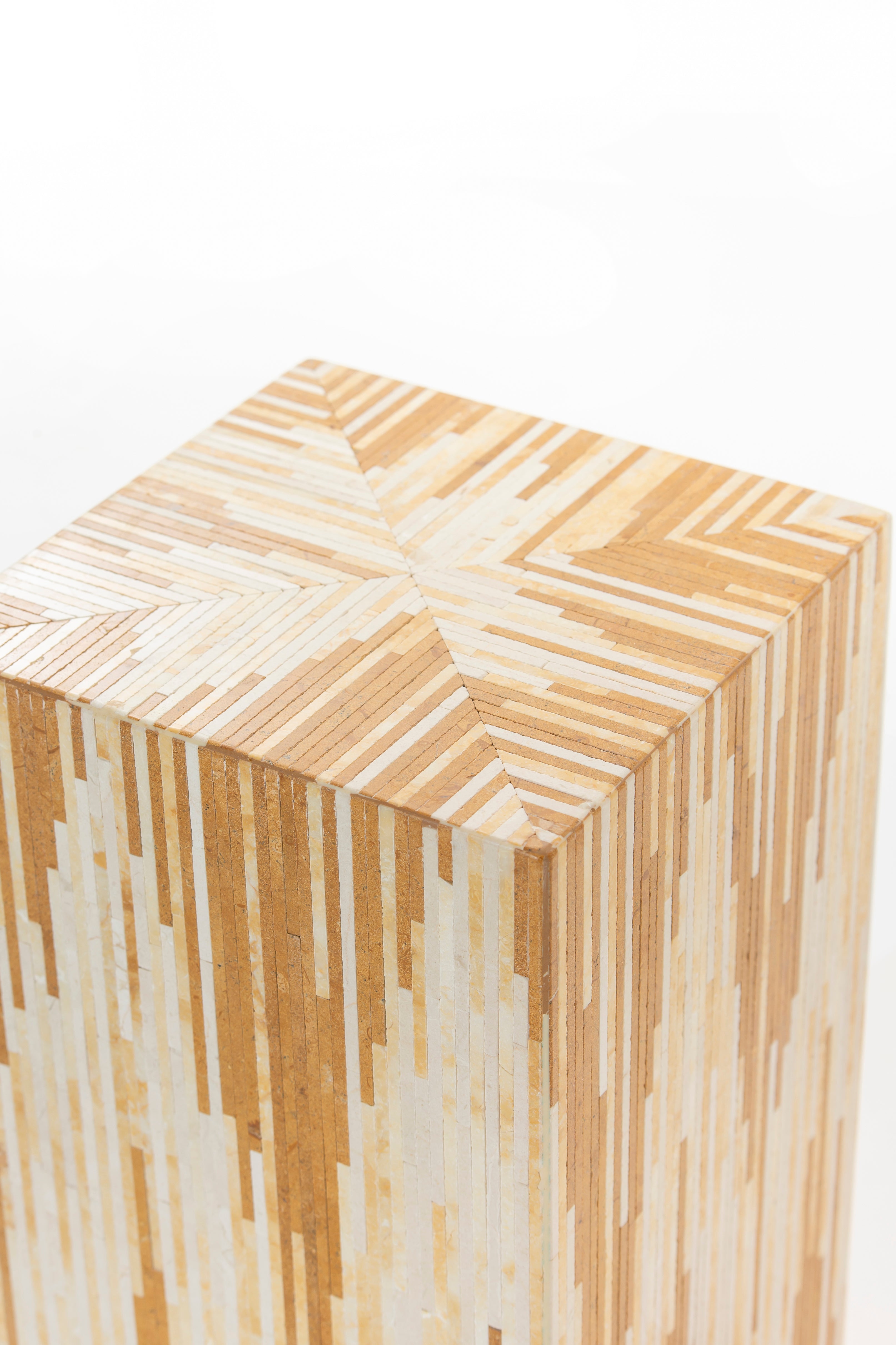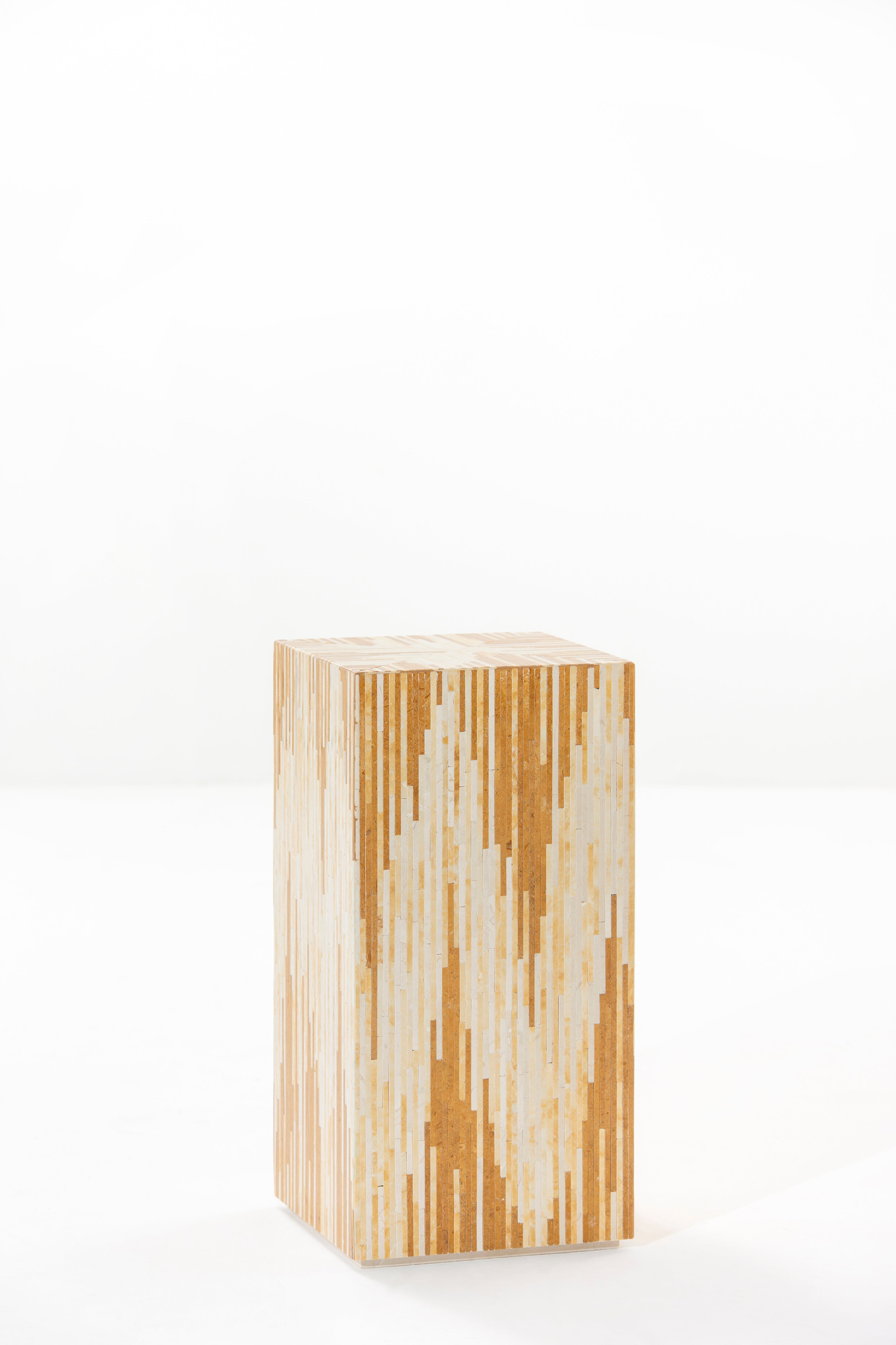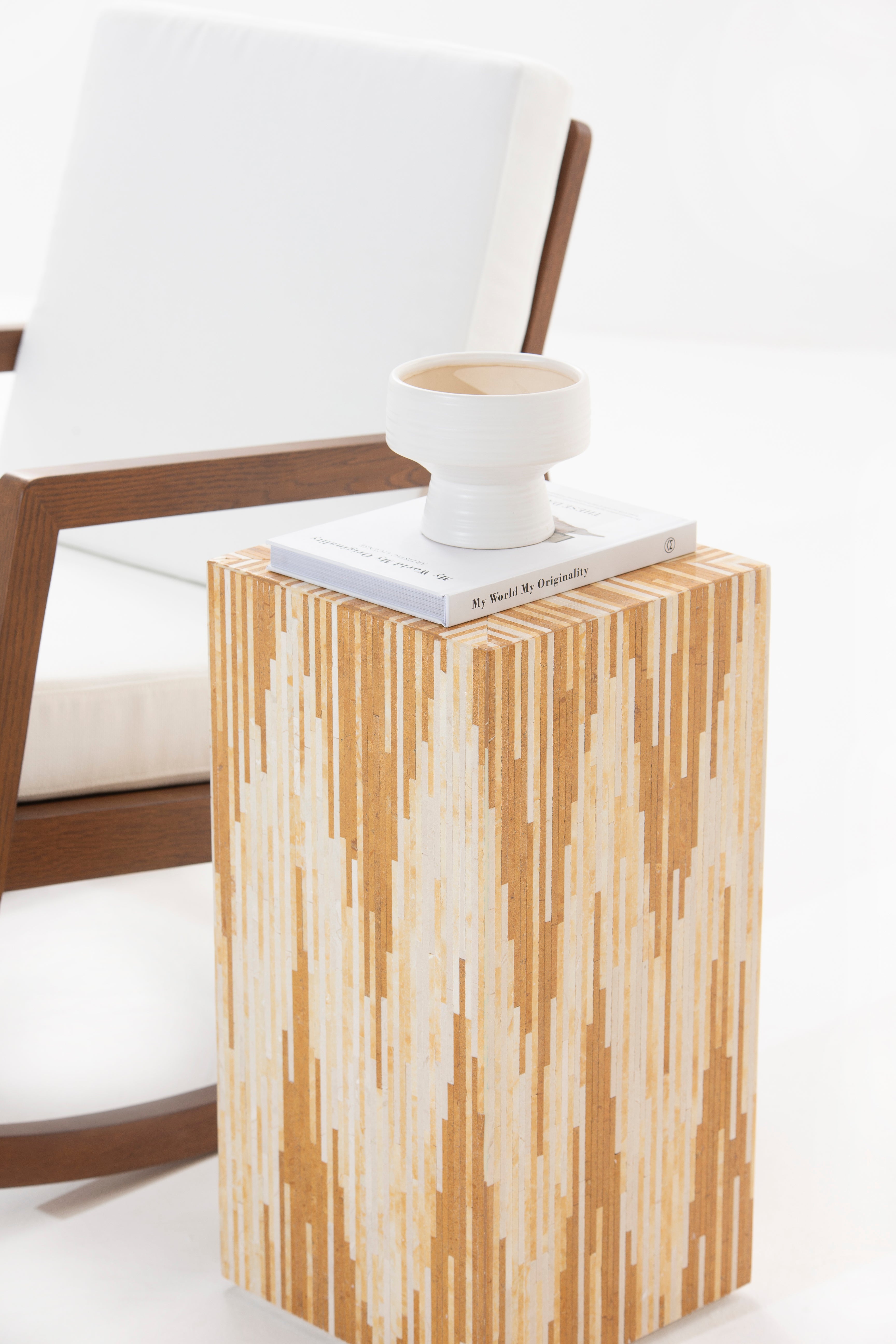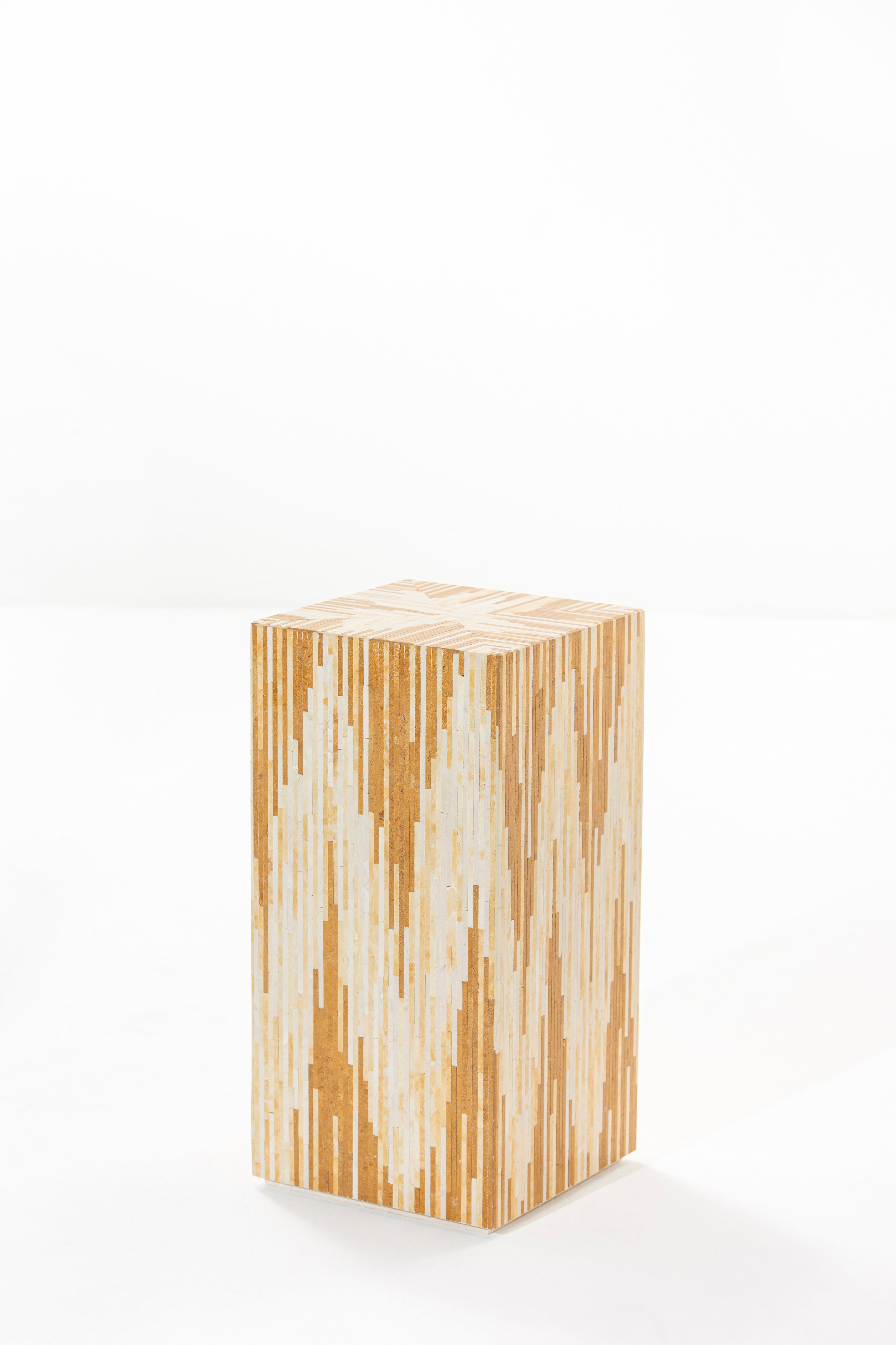 This striking rectangular pedestal, designed to be the centerpiece of your modern aesthetic, features an intricate mosaic of meticulously arranged marble tiles. The design showcases a captivating linear abstract pattern, with vertical and diagonal lines in varying shades of light beige, cream, and brown, creating a dynamic visual texture that draws the eye. Its clean lines and natural color palette offer a versatile display solution for your cherished art pieces, sculptures, or even a vibrant plant, seamlessly integrating with your contemporary interior design and adding an understated yet powerful artistic statement to your space.
