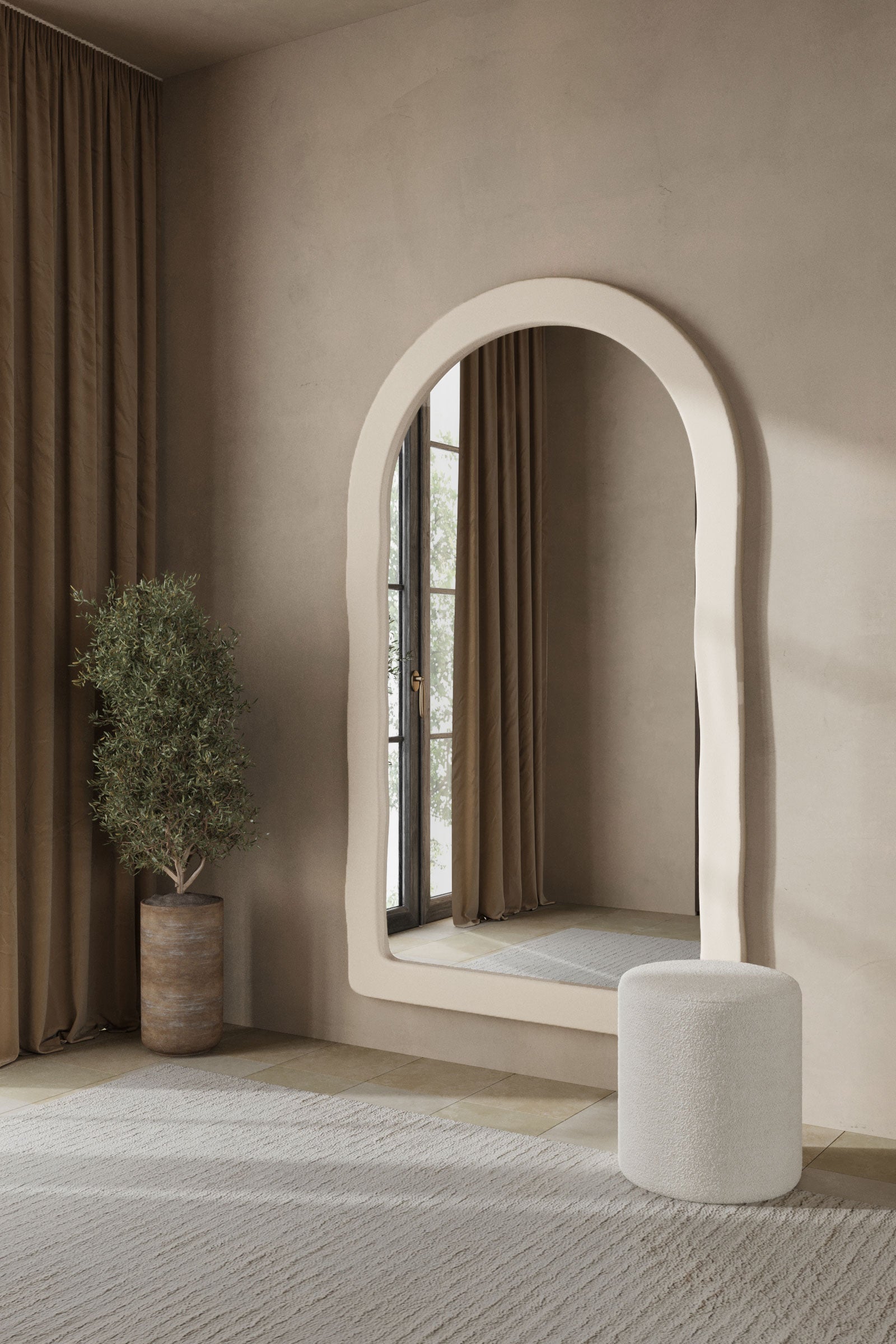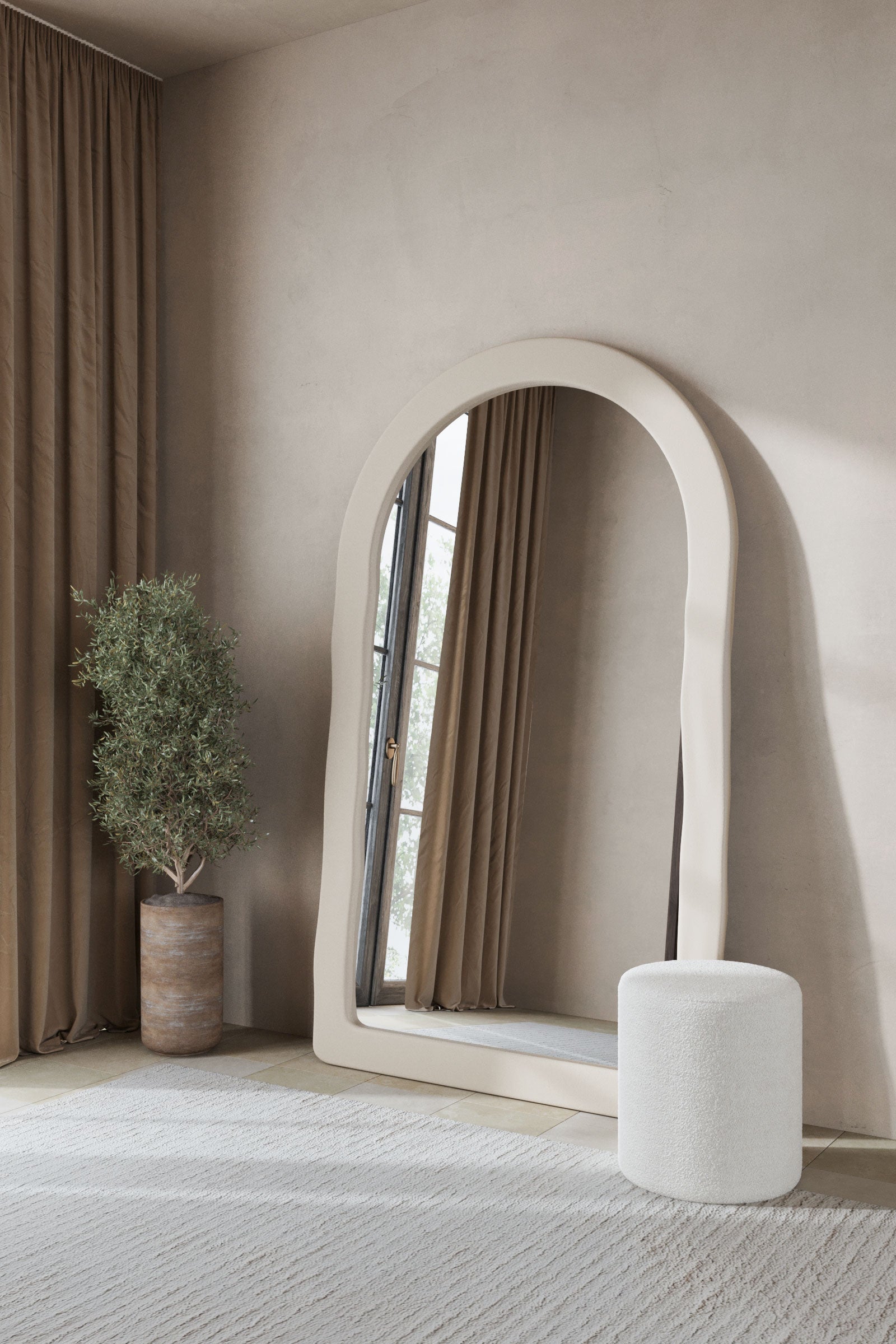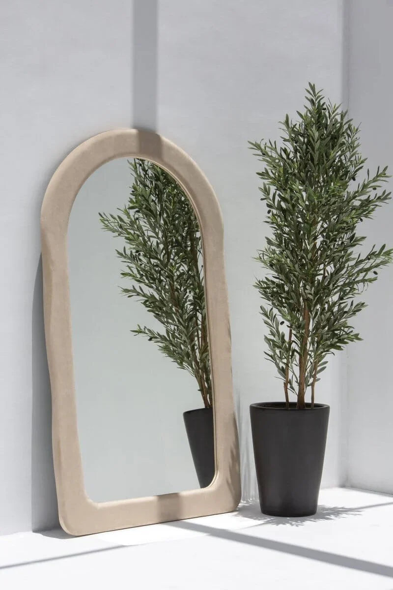 Crafted with attention to detail, this mirror enhances your decor with its unique irregular arch, which introduces an element of the unexpected into your space. The beige color of the velvet-like fabric infuses a light, airy feel, making it perfect for Greek-style interiors or simple, understated rooms. Its size offers a practical view, while the soft, undulating lines of the irregular arch invite calm and introspection. This mirror is best suited for spaces that favor simplicity and a touch of rustic elegance over opulence, ensuring it remains a timeless and cherished addition to your home.